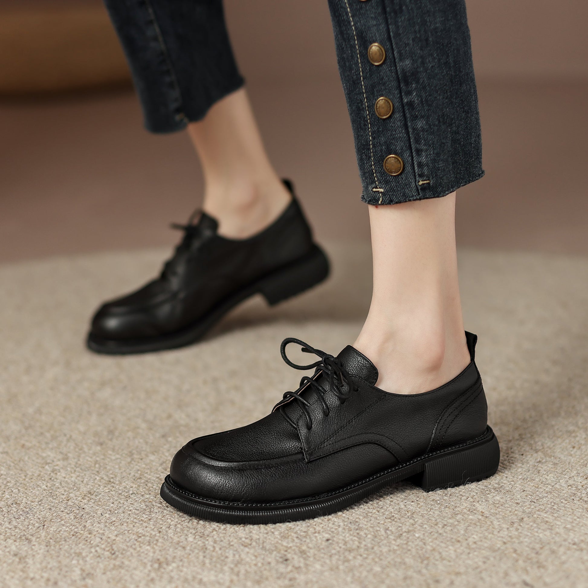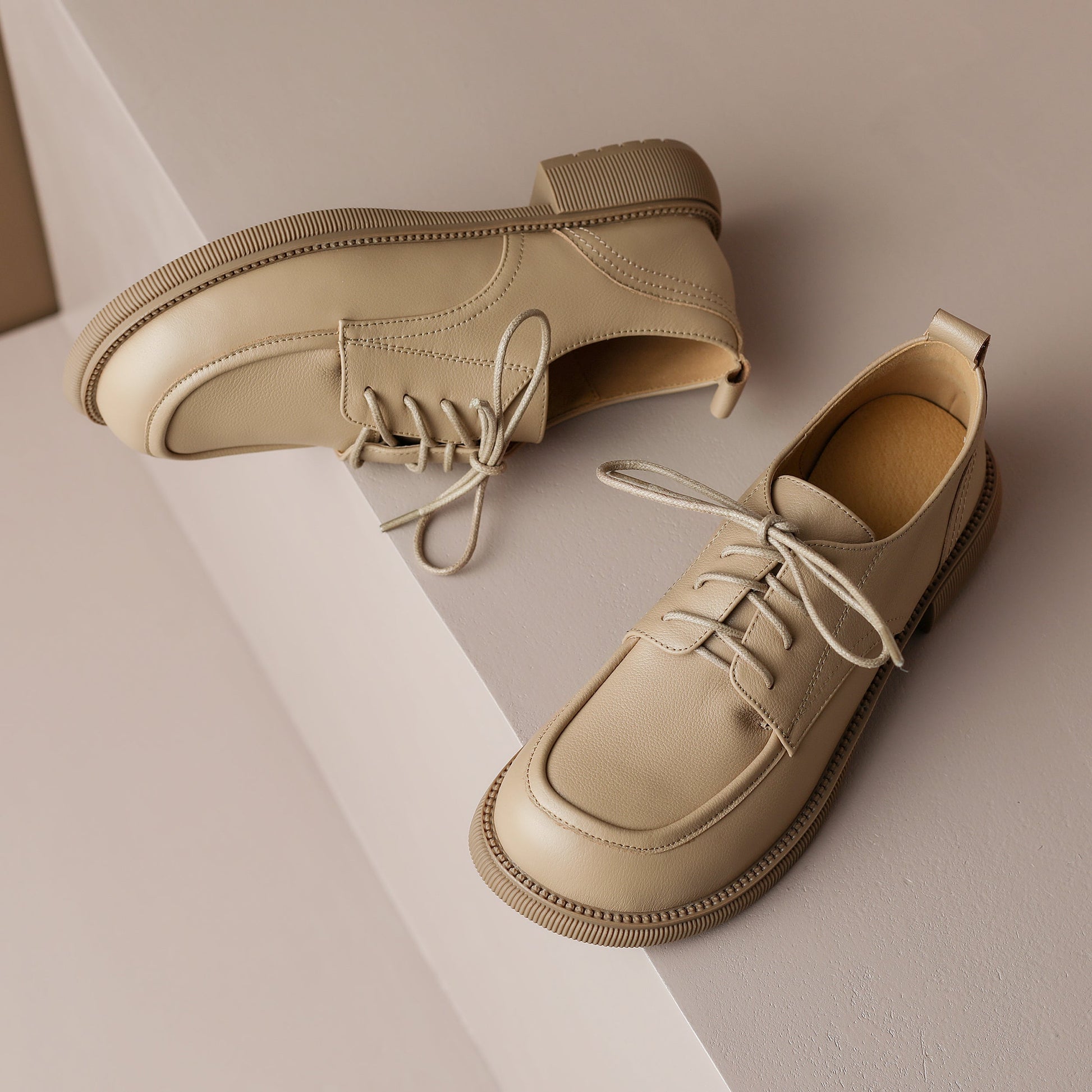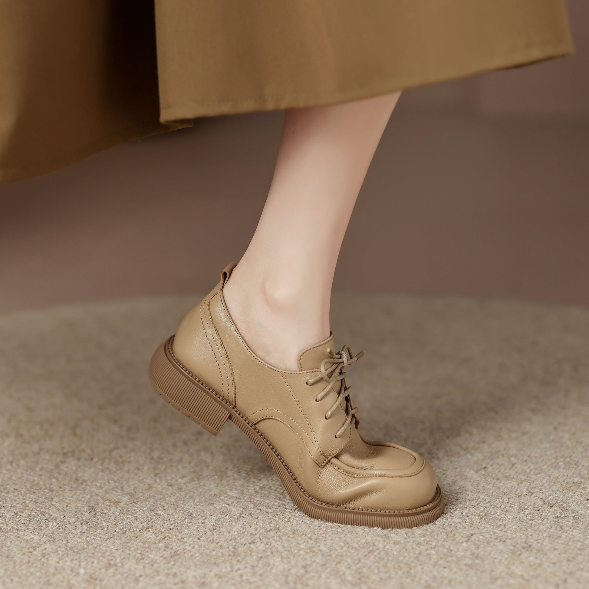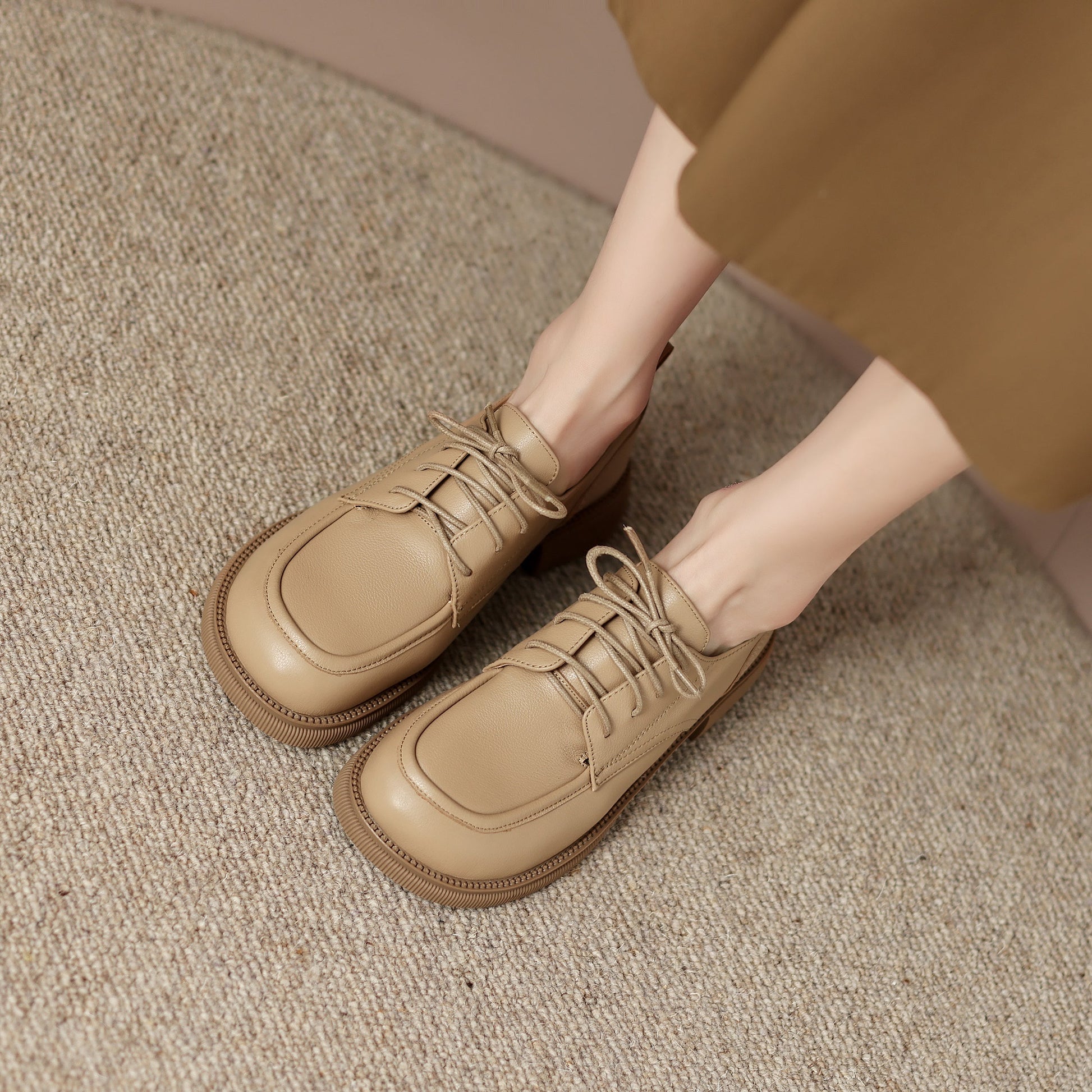 Handcrafted Women's Square-Toe Leather Lace-Up Low Heel – Casual Style