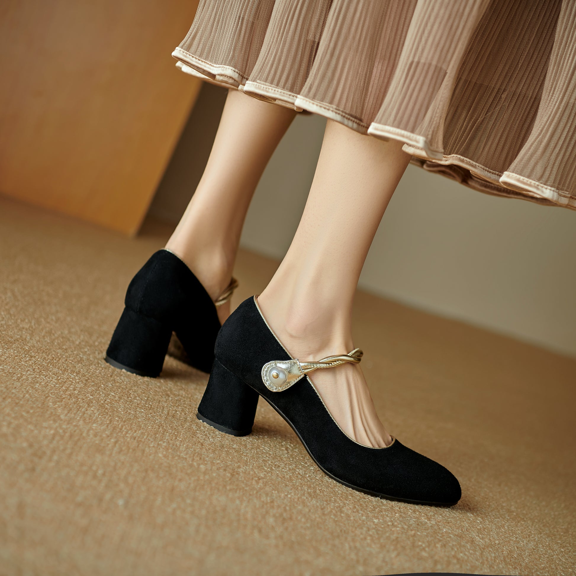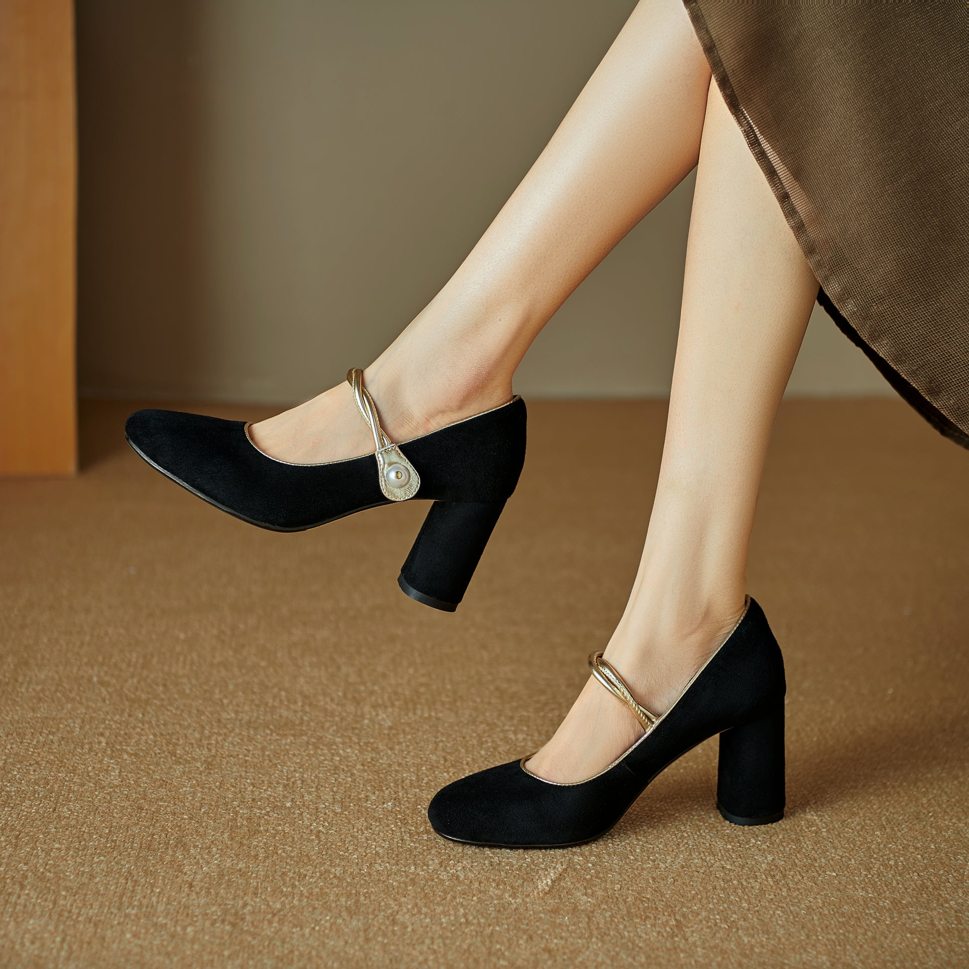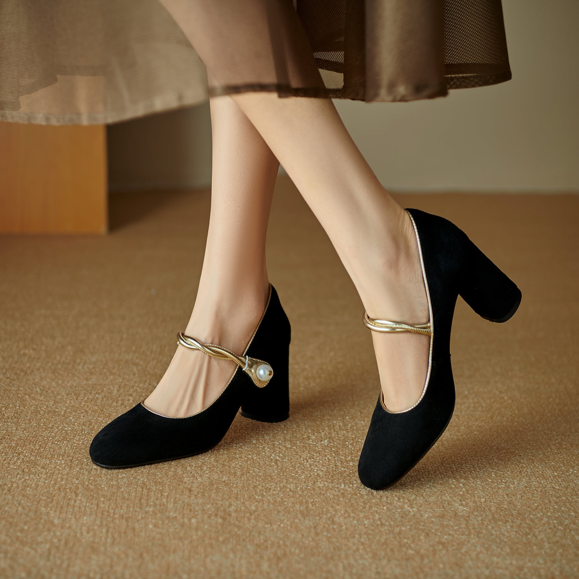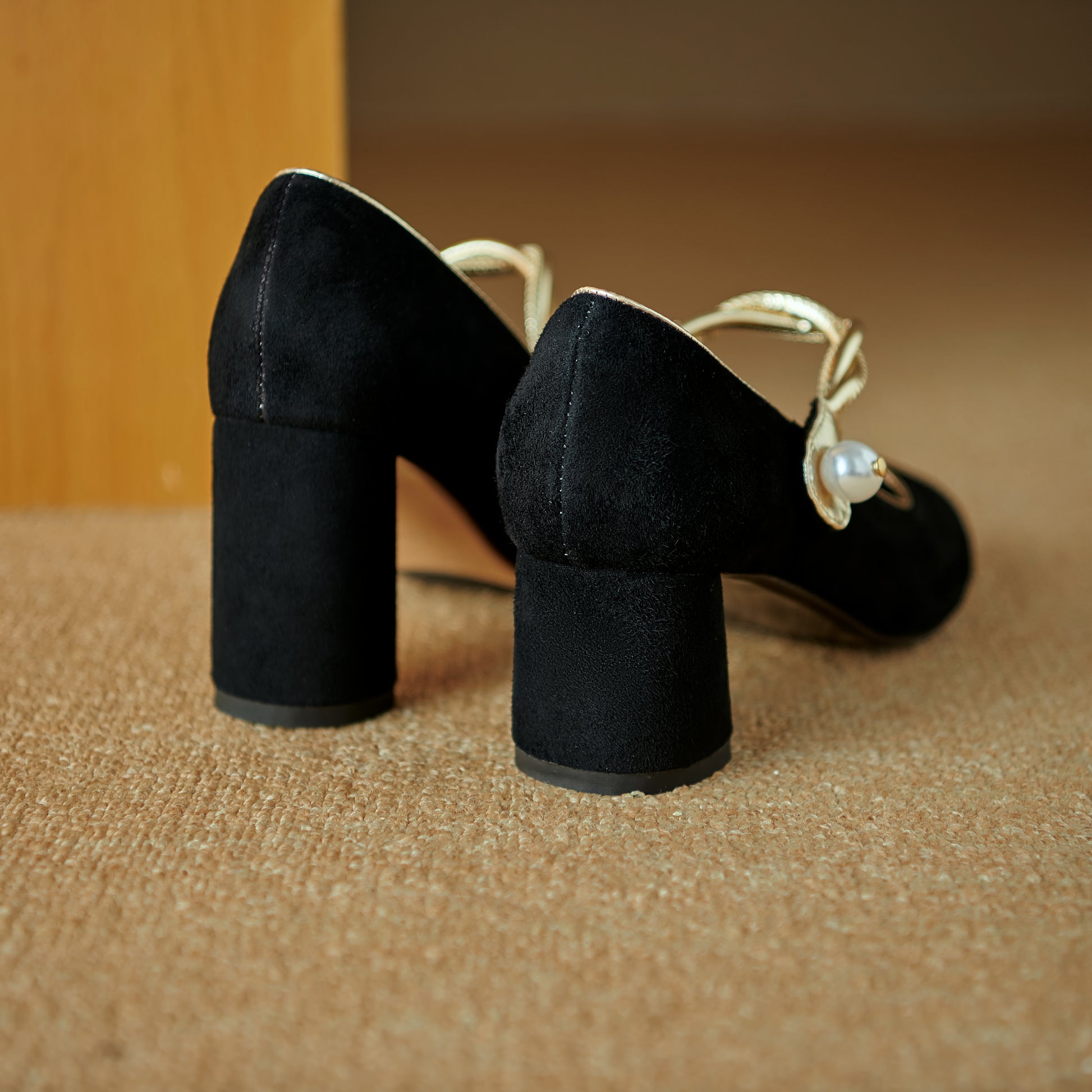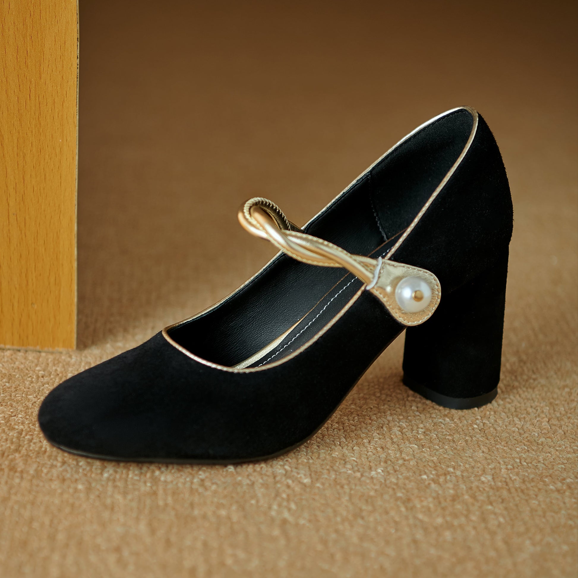 The ParisianPearl MaryJane is an exquisite women's pump that blends Parisian elegance with modern sophistication. Handcrafted from premium sheepskin suede, this luxurious design features matching sheepskin lining and insole for exceptional comfort. The 5.5cm/8cm block heel (please specify height) and flexible TPR sole provide stable elevation, while the rounded toe and pearl-embellished buckle create timeless femininity.