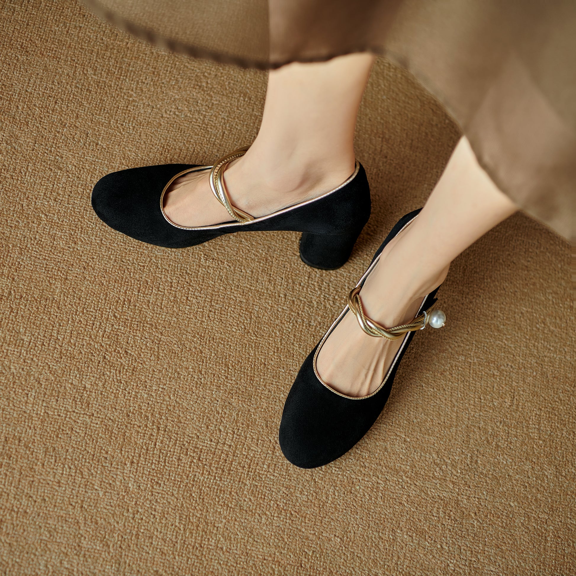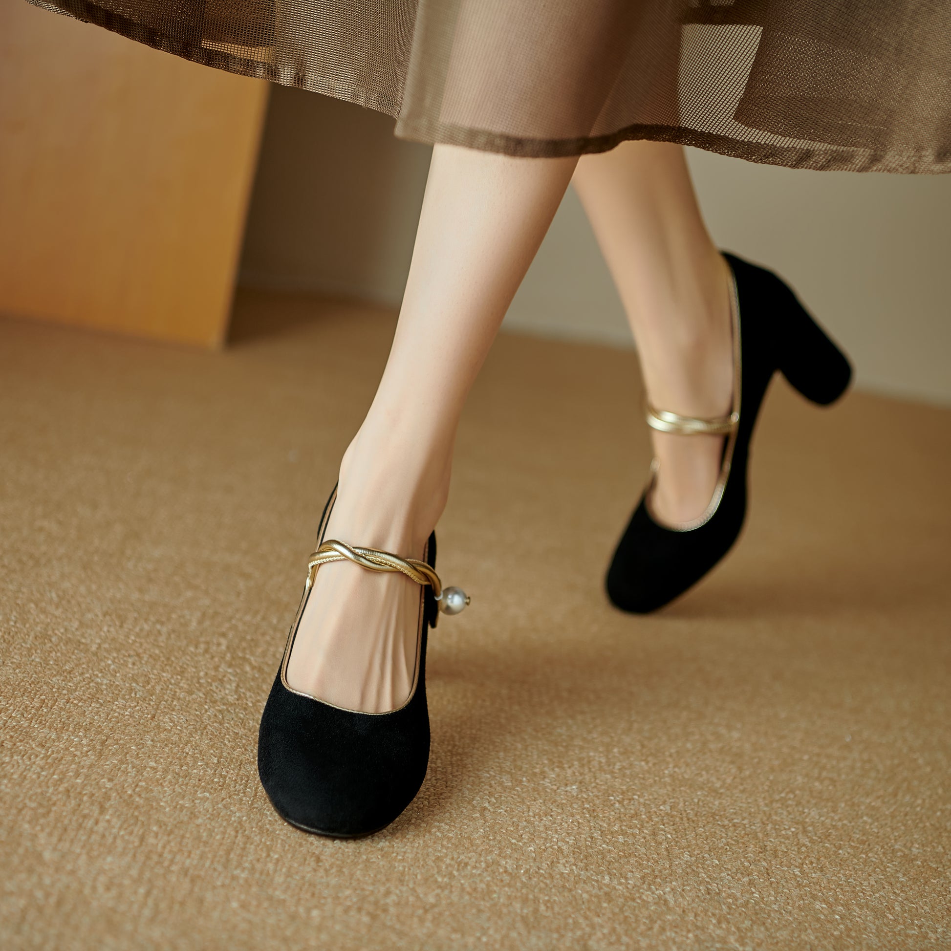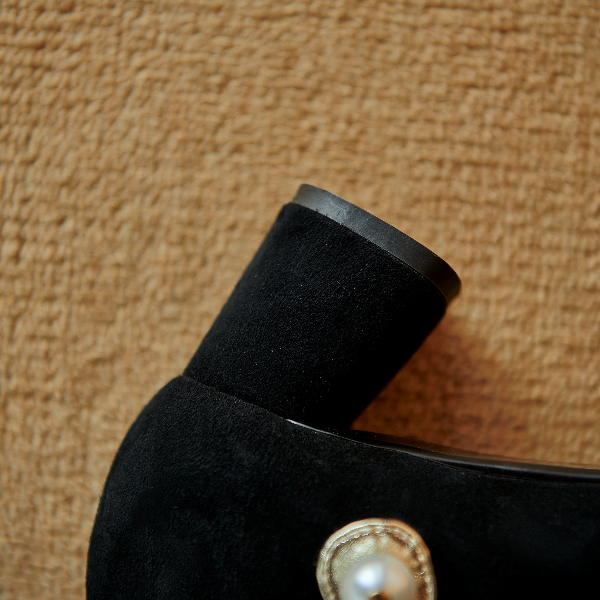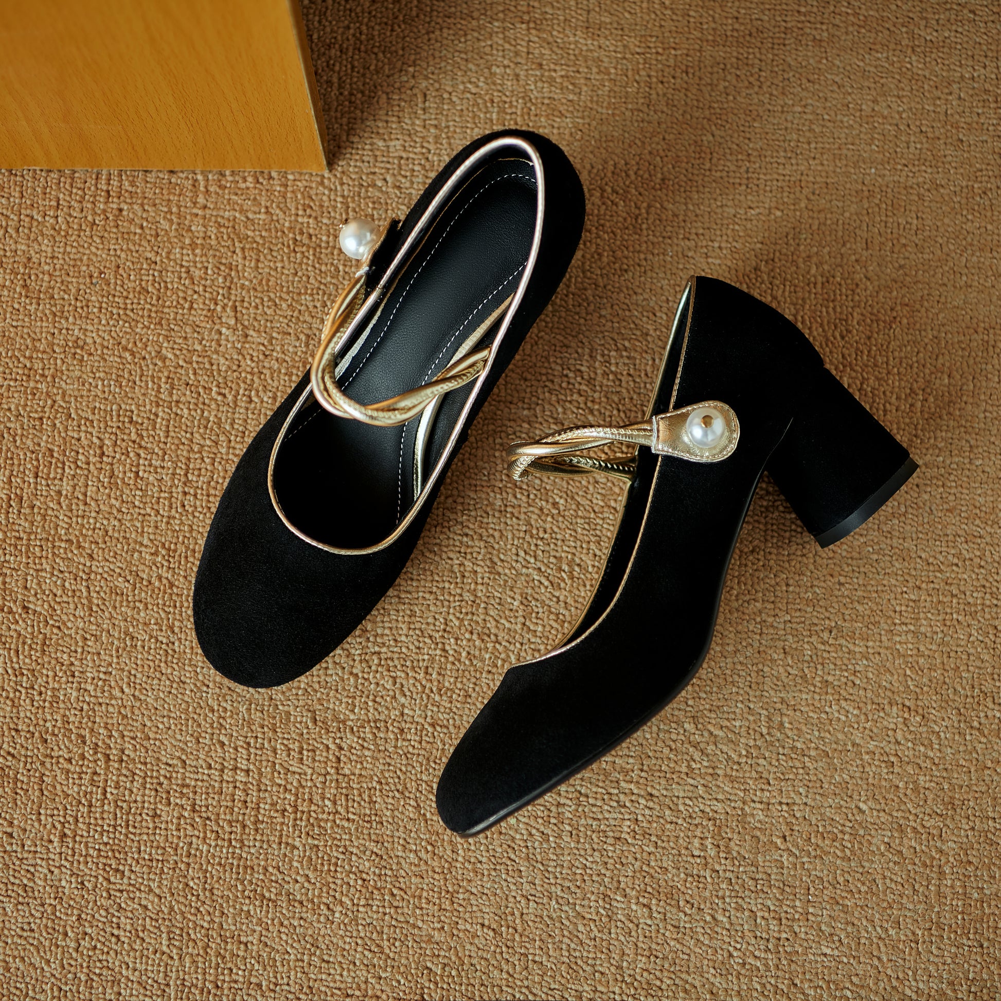 The ParisianPearl MaryJane is an exquisite women's pump that blends Parisian elegance with modern sophistication. Handcrafted from premium sheepskin suede, this luxurious design features matching sheepskin lining and insole for exceptional comfort. The 5.5cm/8cm block heel (please specify height) and flexible TPR sole provide stable elevation, while the rounded toe and pearl-embellished buckle create timeless femininity.