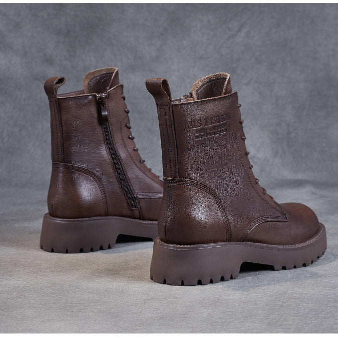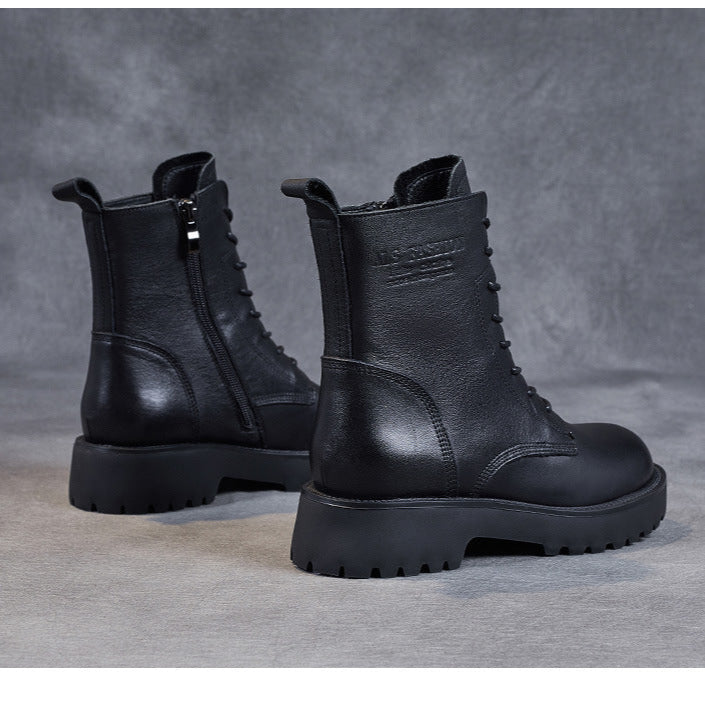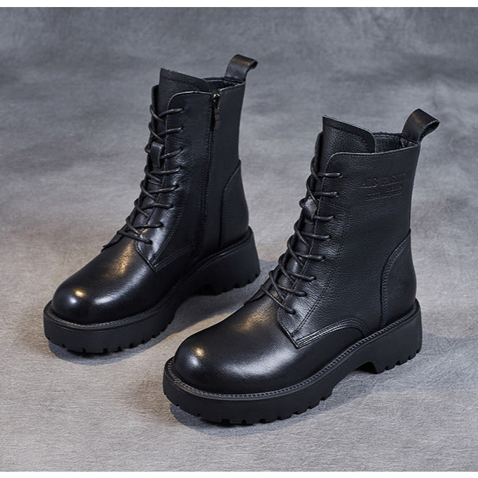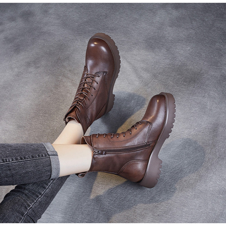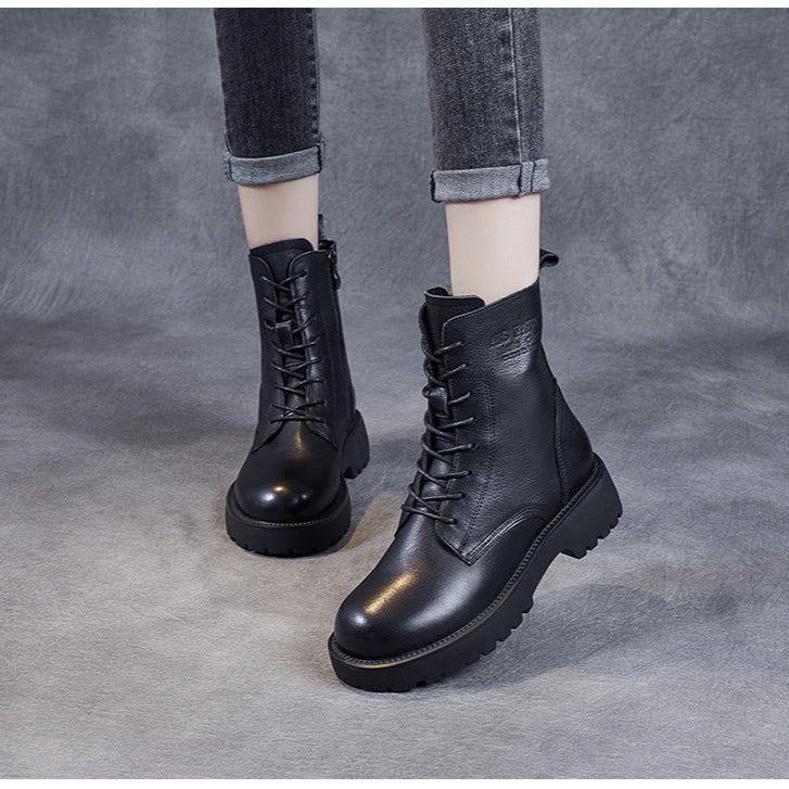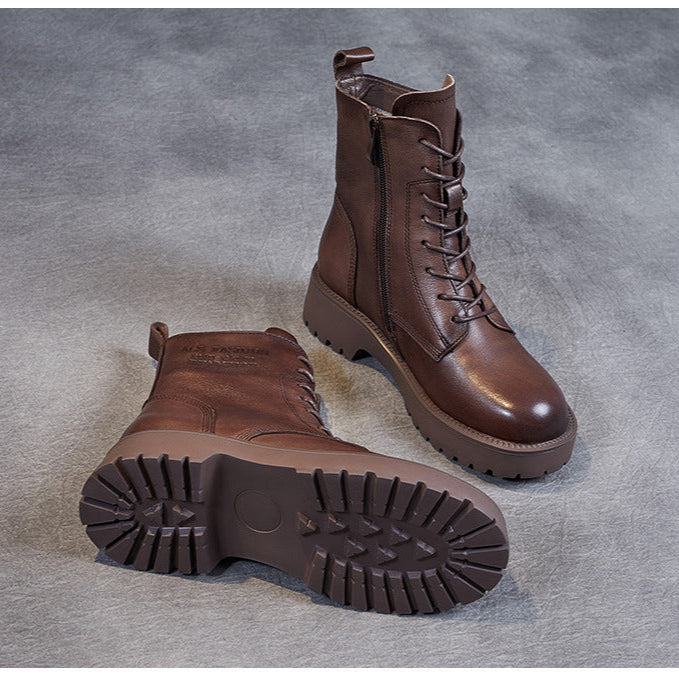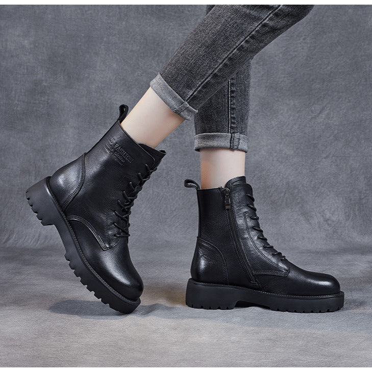 Women's Genuine Leather Casual Combat Boots with Side Zipper Closure