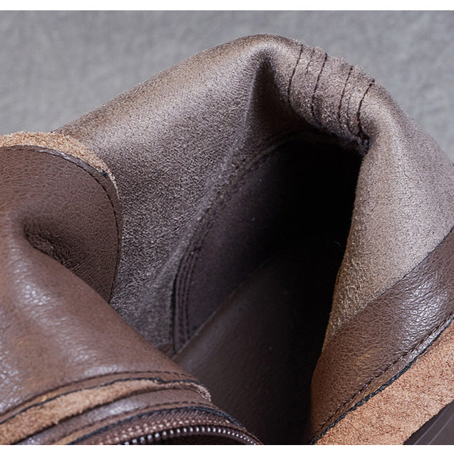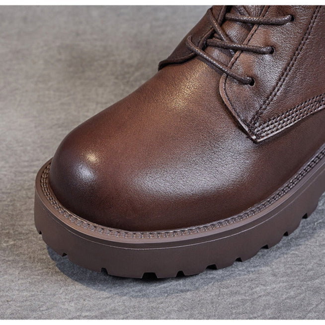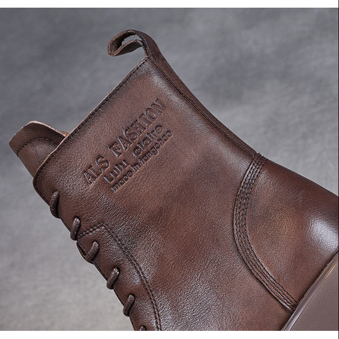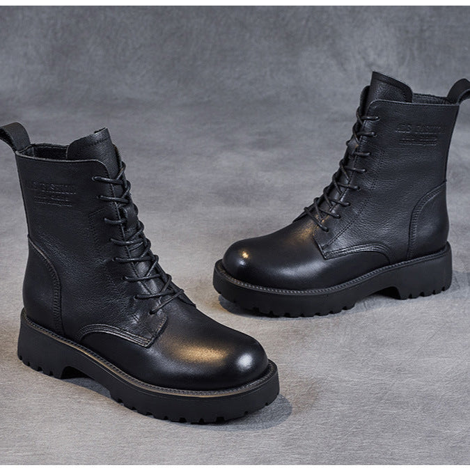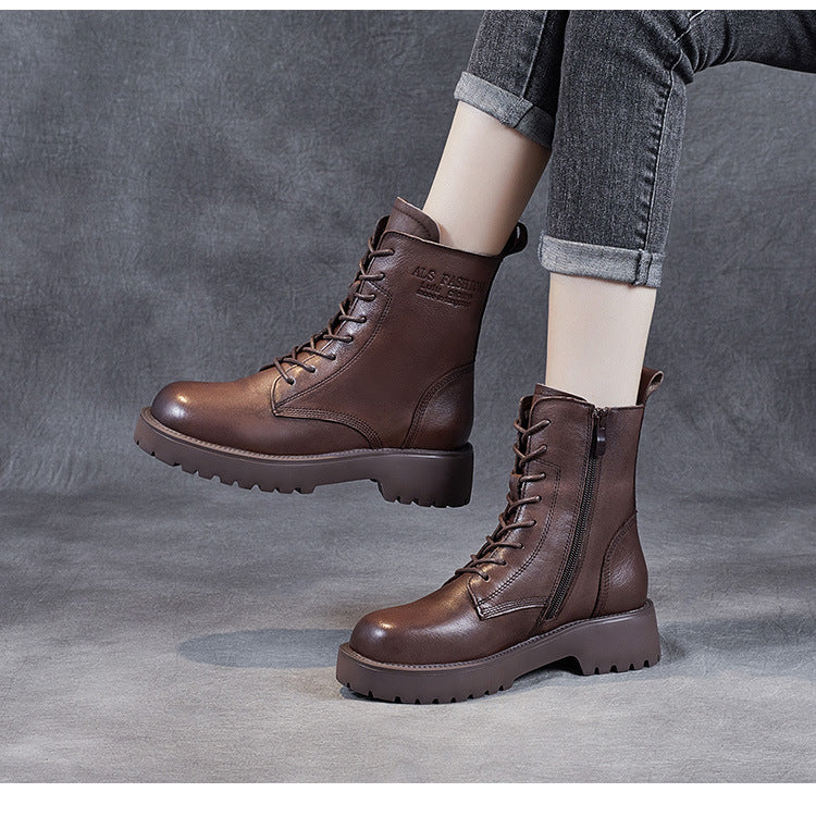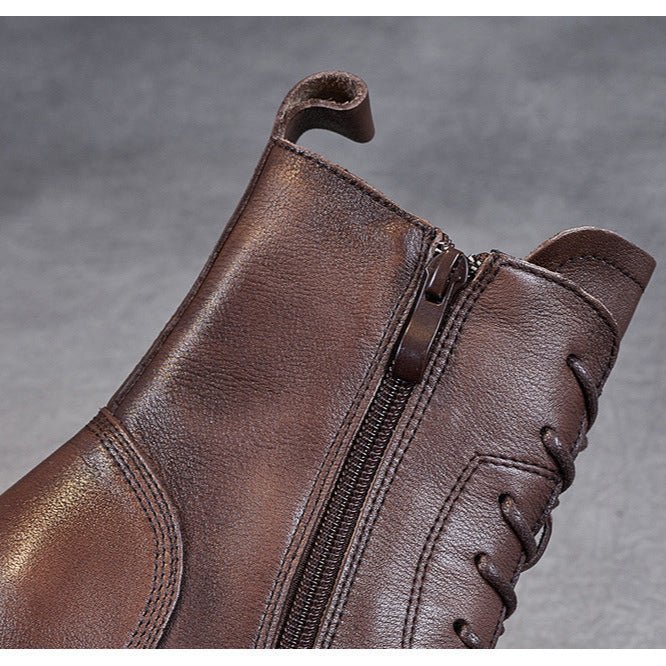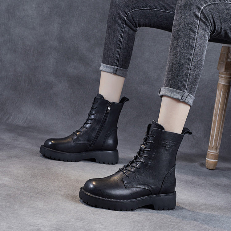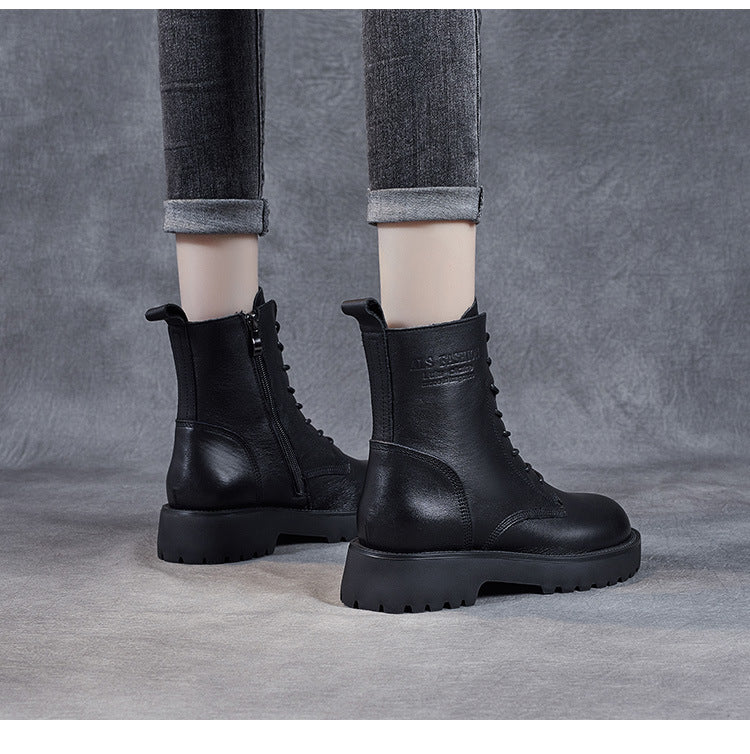 Women's Genuine Leather Casual Combat Boots with Side Zipper Closure