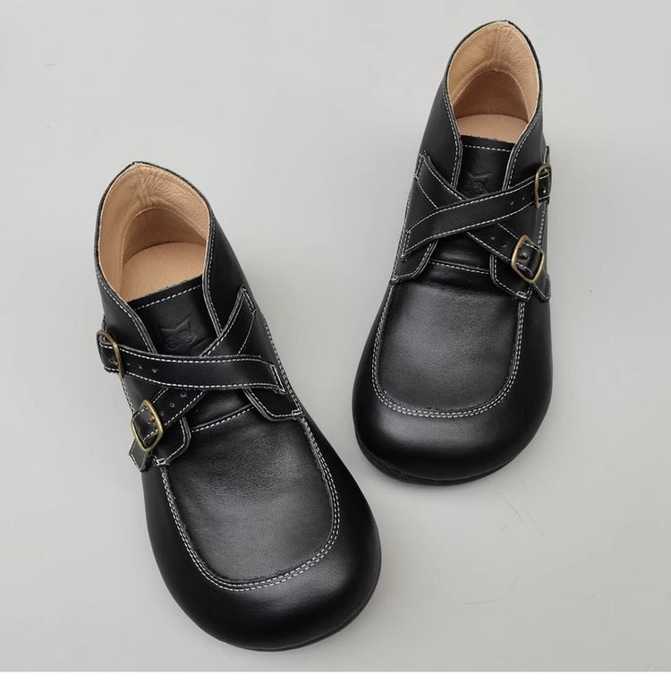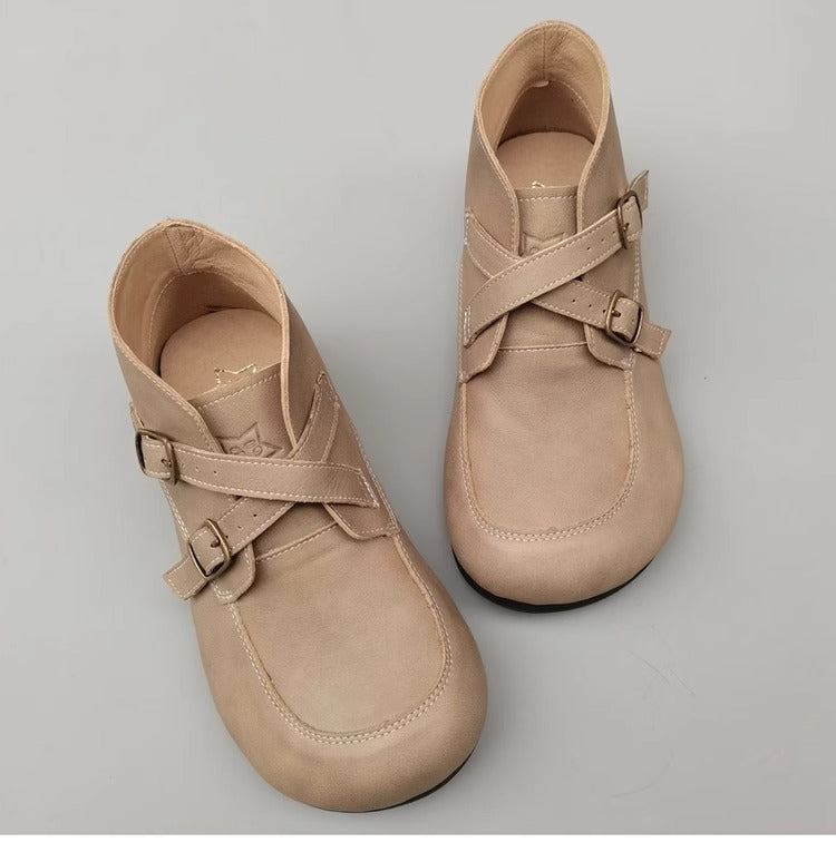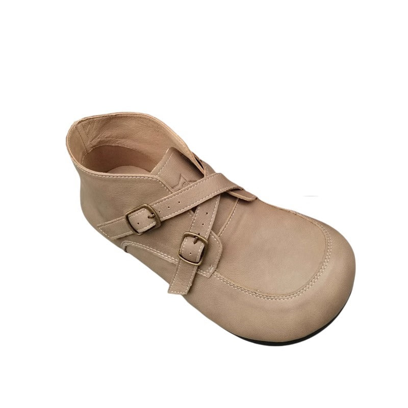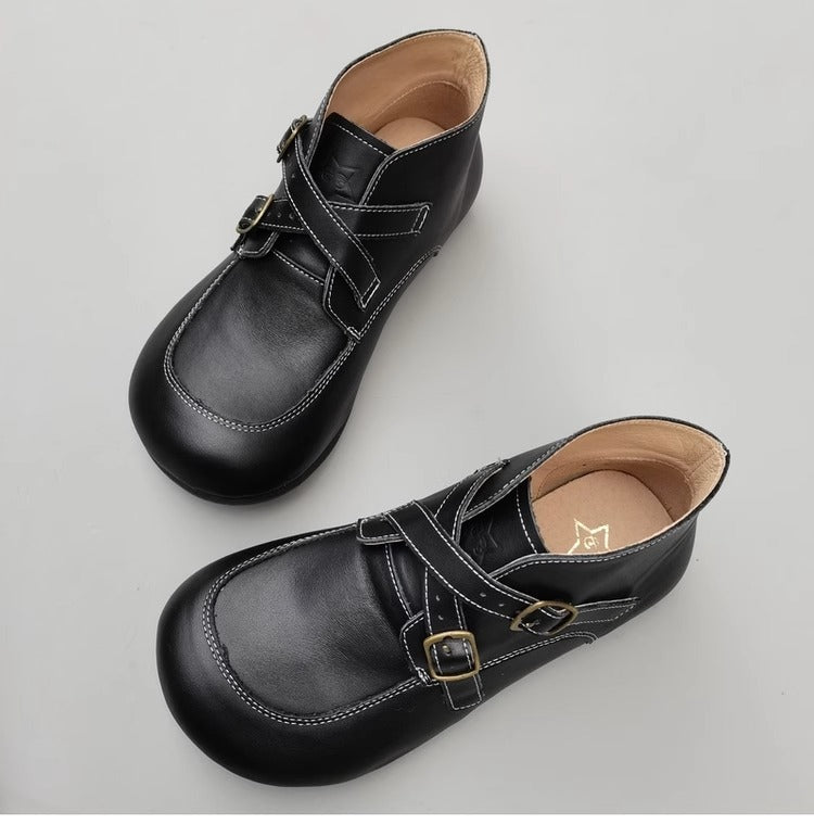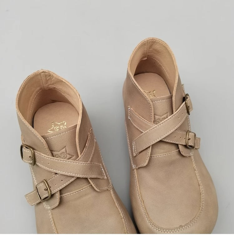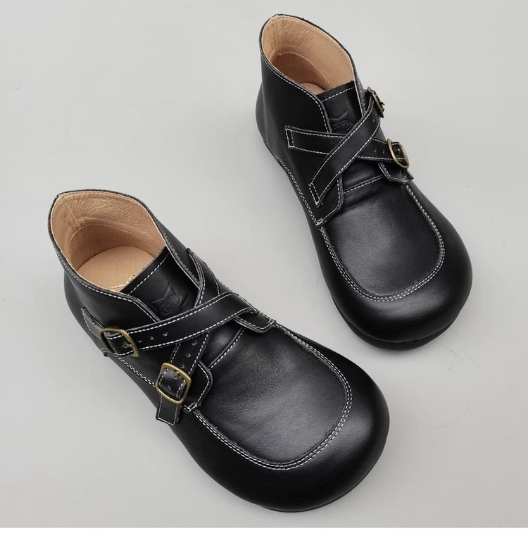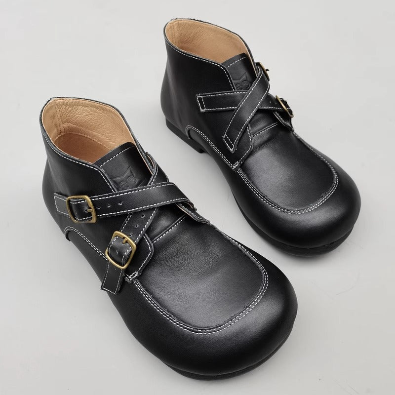 Description: These quirky-chic high-top ankle boots feature premium First-layer cowhide leather with a wide toe box design, perfect for wide/plump feet or high insteps (narrow feet may size down). The shaft reaches ankle joint with breathable pigskin lining and insole, plus a 2cm soft anti-slip rubber sole. The crisscross straps with buckle+elastic allow easy slip-on wear without unfastening - delivering both bold style and all-day comfort.