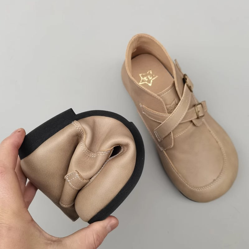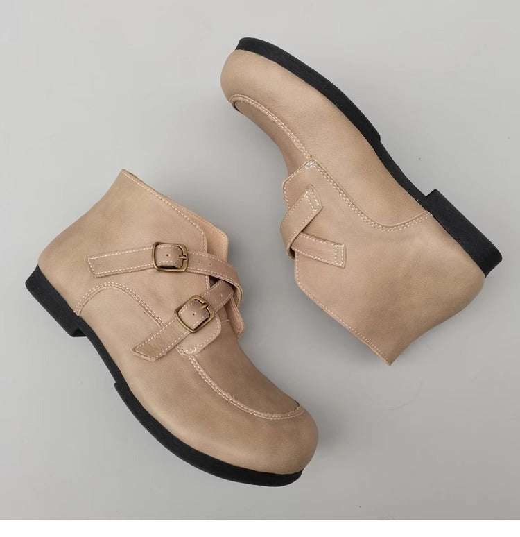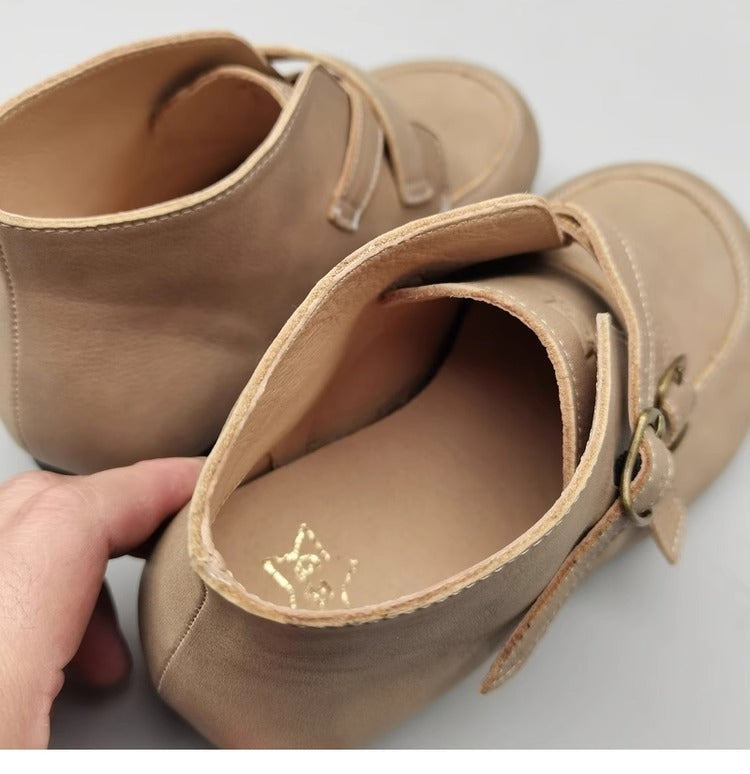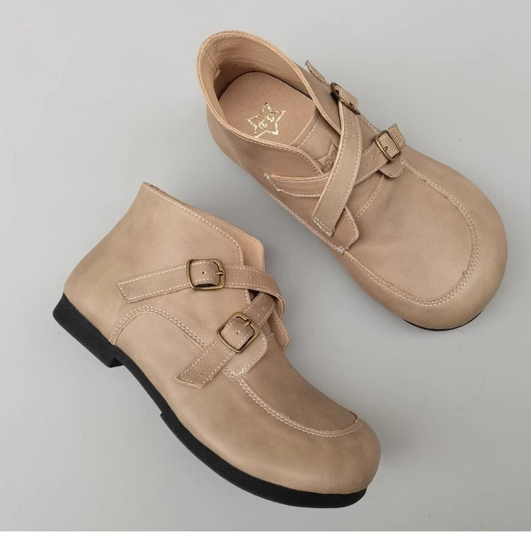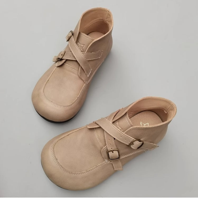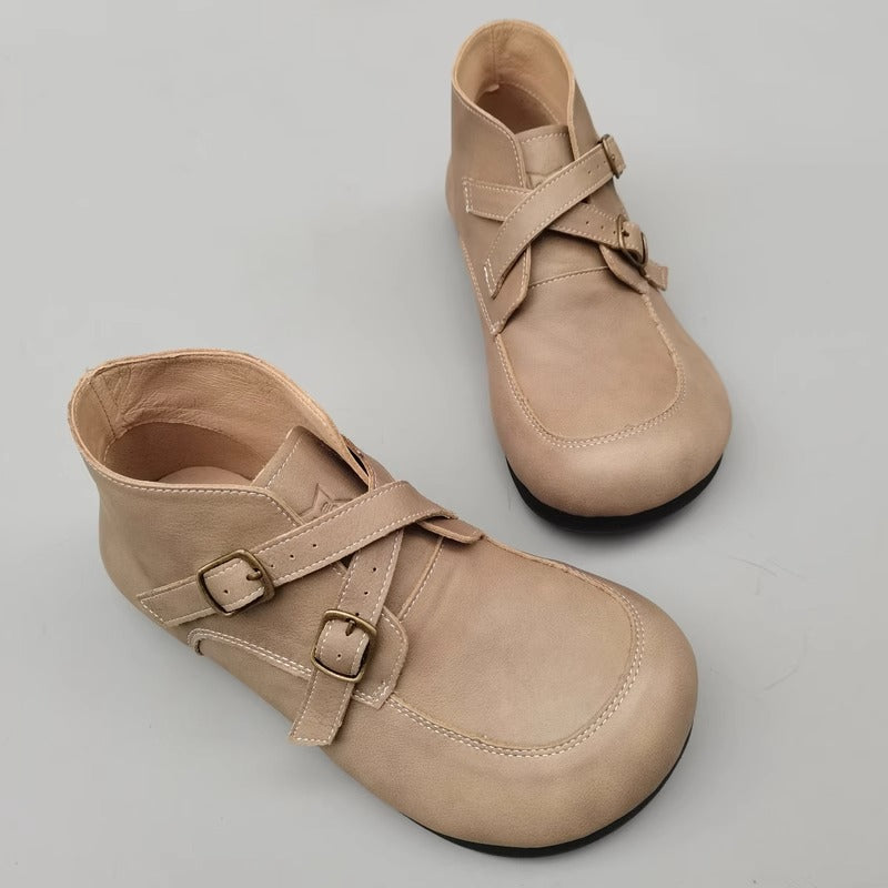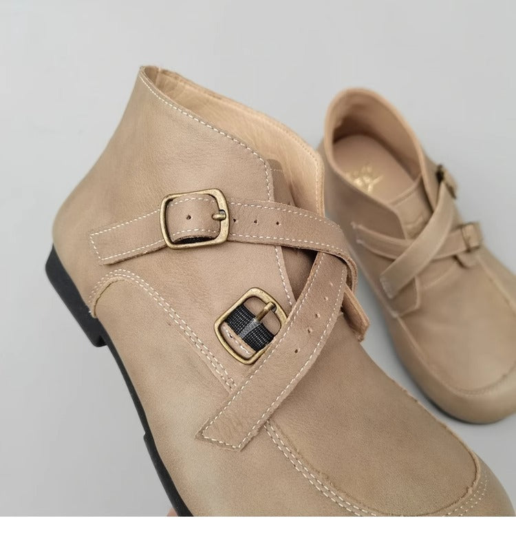 Description: These quirky-chic high-top ankle boots feature premium First-layer cowhide leather with a wide toe box design, perfect for wide/plump feet or high insteps (narrow feet may size down). The shaft reaches ankle joint with breathable pigskin lining and insole, plus a 2cm soft anti-slip rubber sole. The crisscross straps with buckle+elastic allow easy slip-on wear without unfastening - delivering both bold style and all-day comfort.