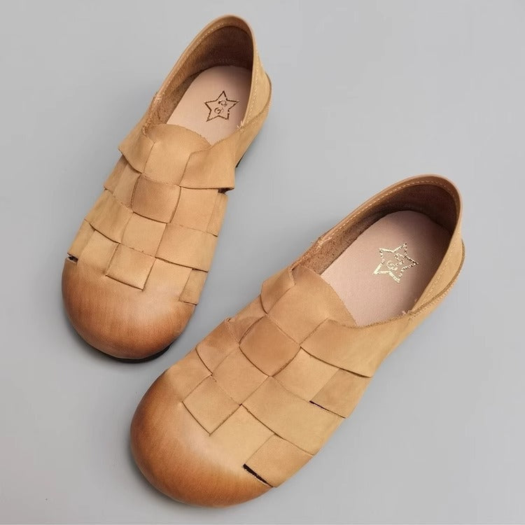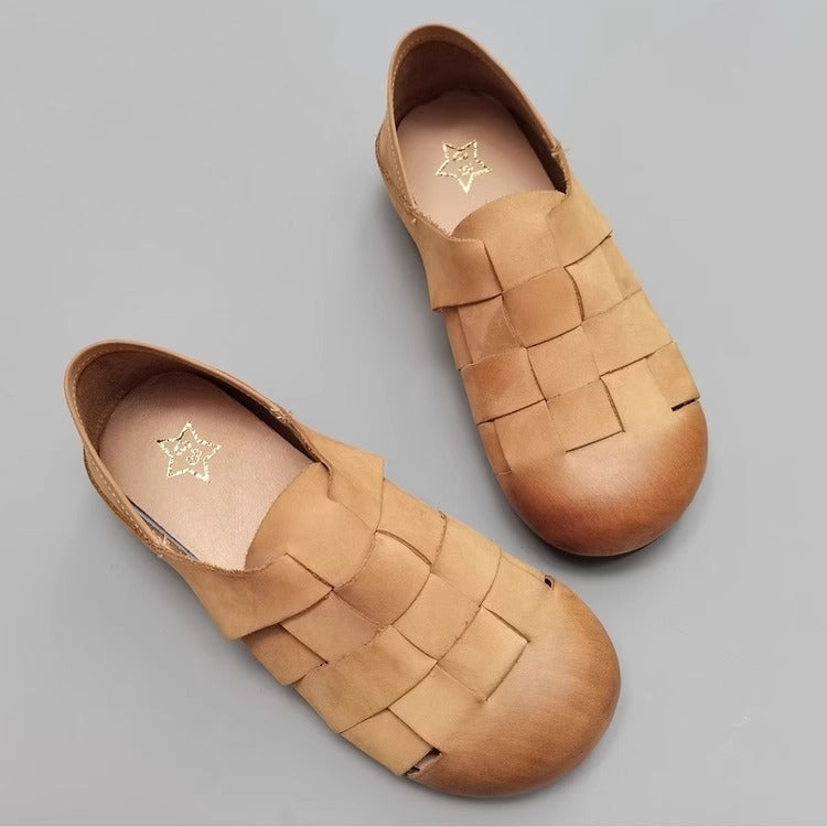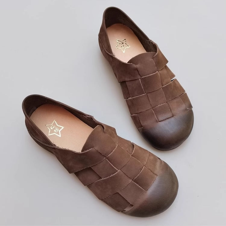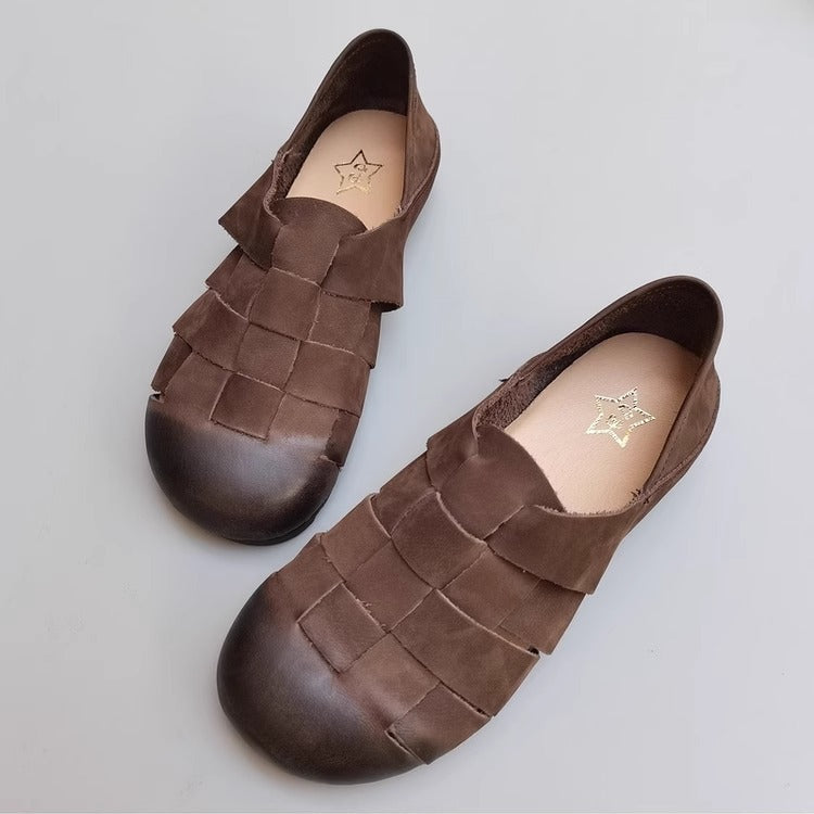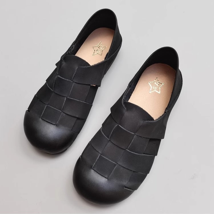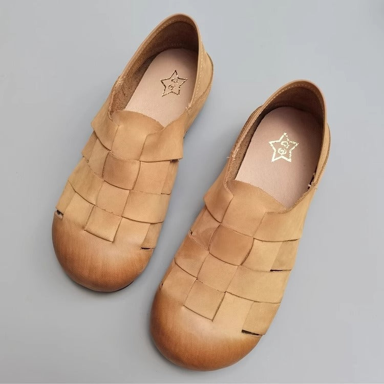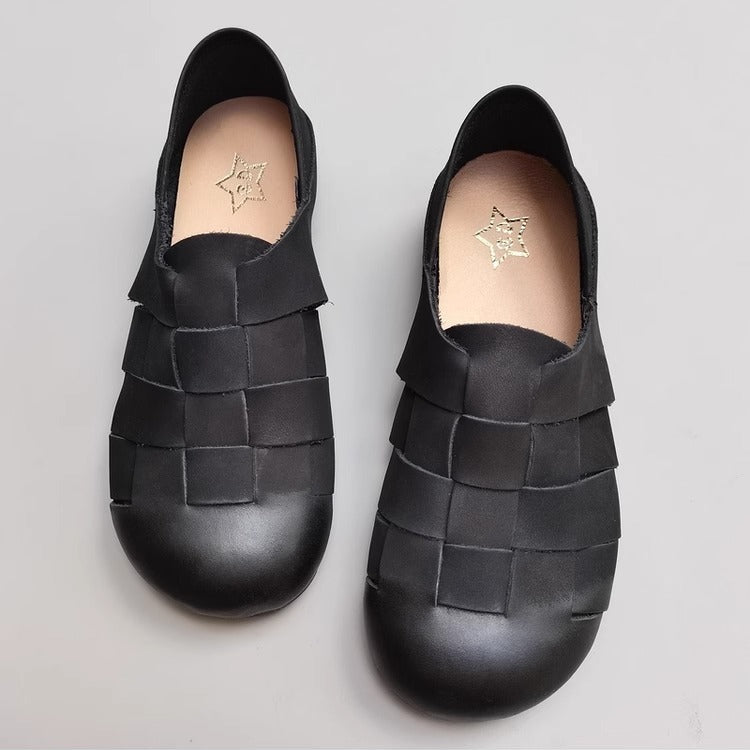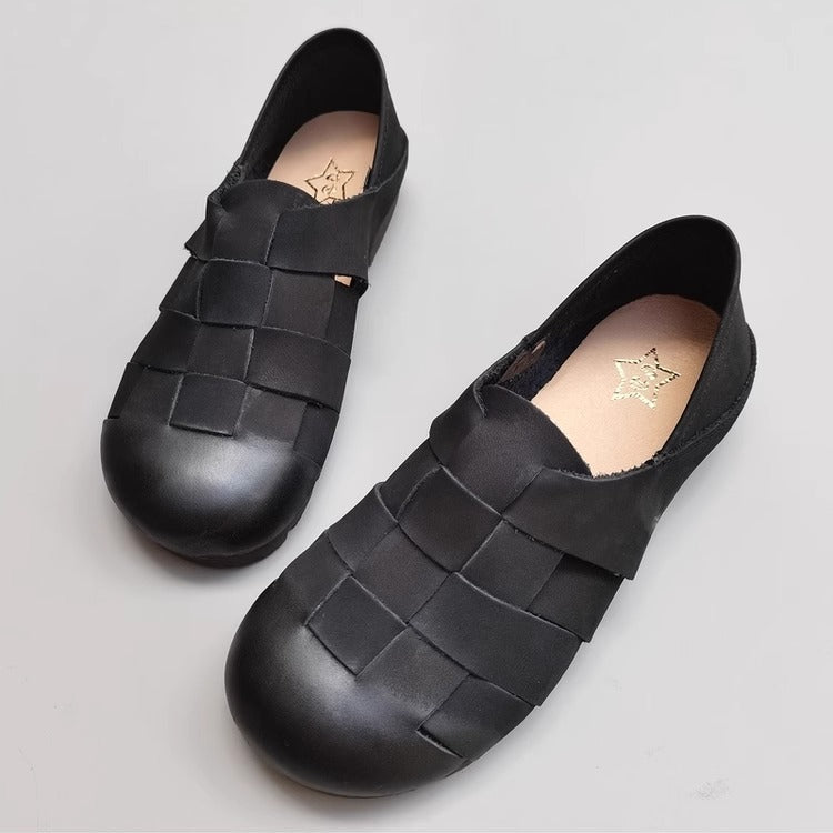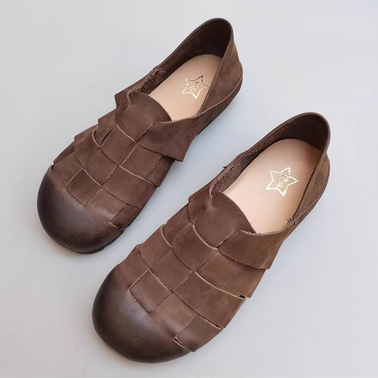 Women's Handmade Leather Round Toe Braided Breathable Flat Shoes