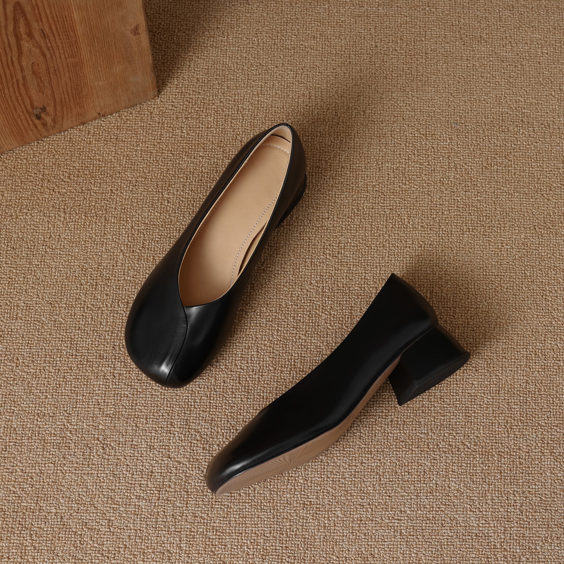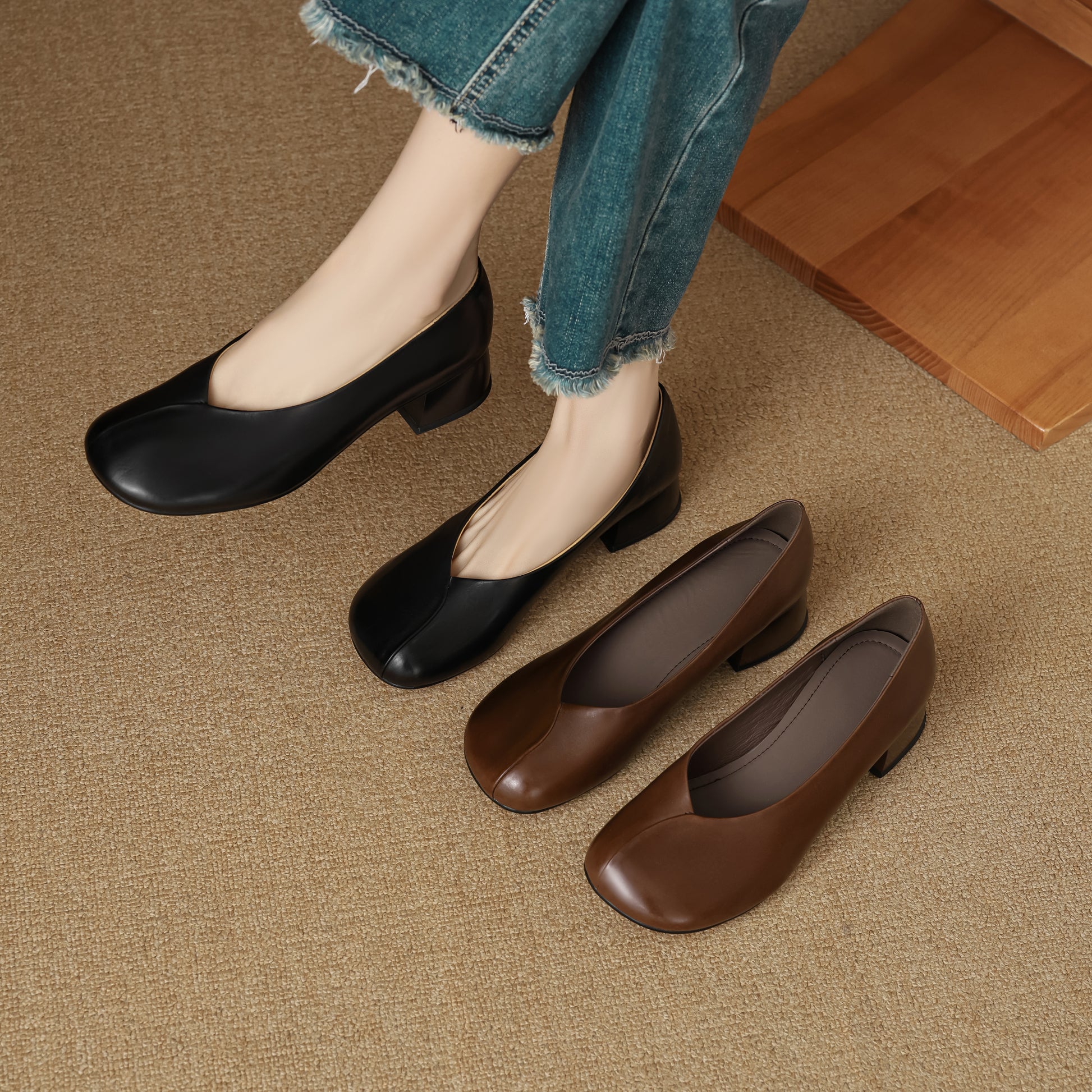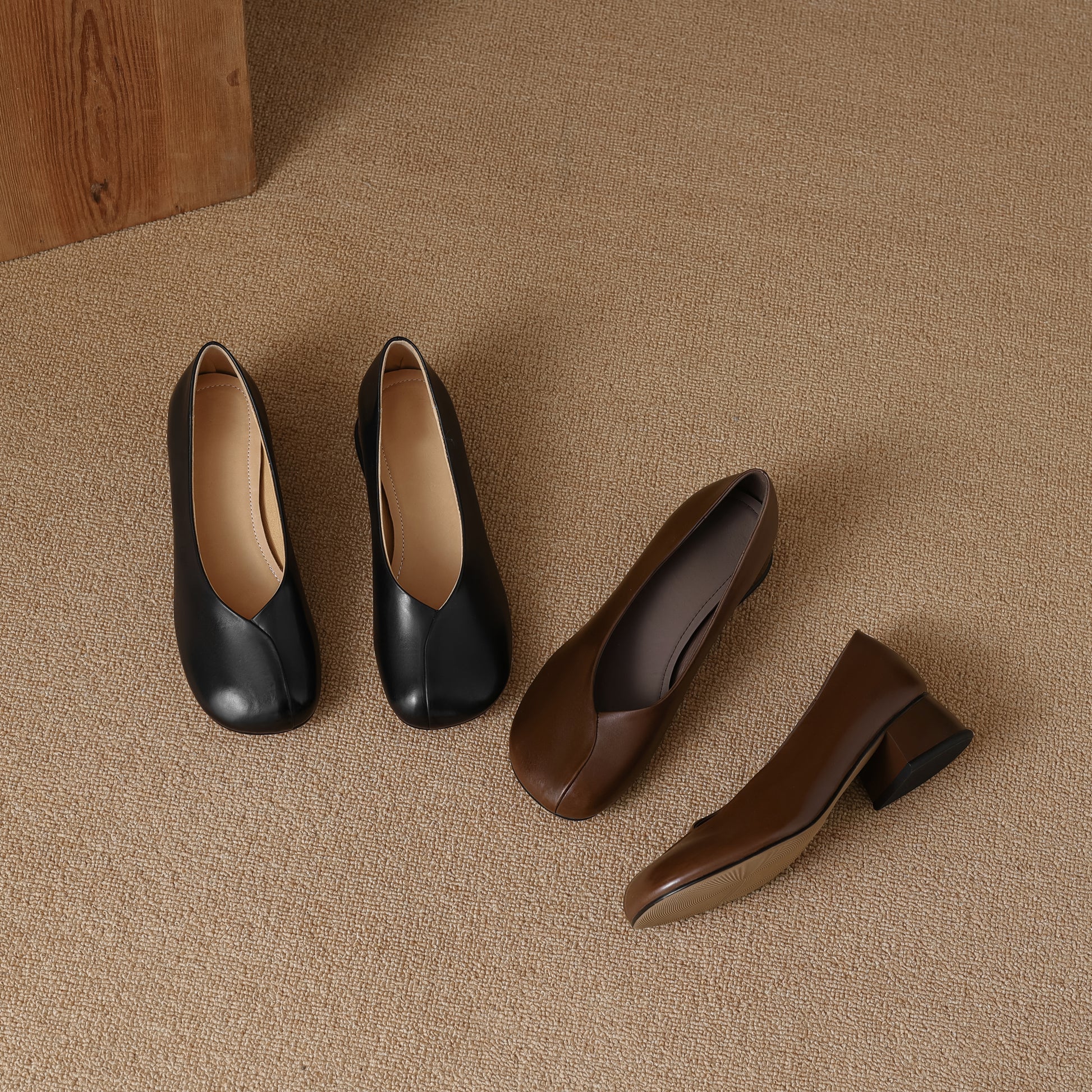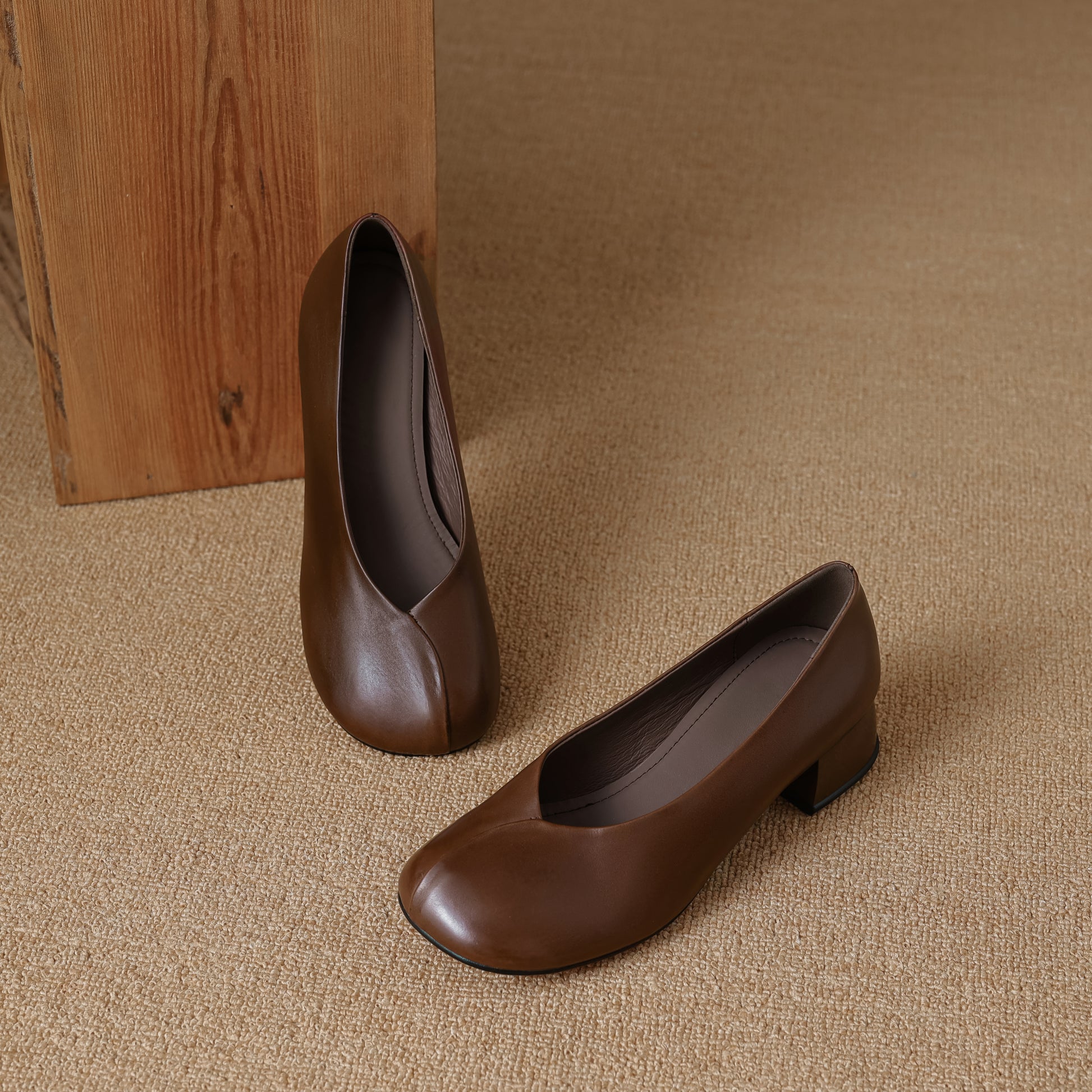 Women's Handmade Leather Slip-on Round Toe Low Heel Block Pumps