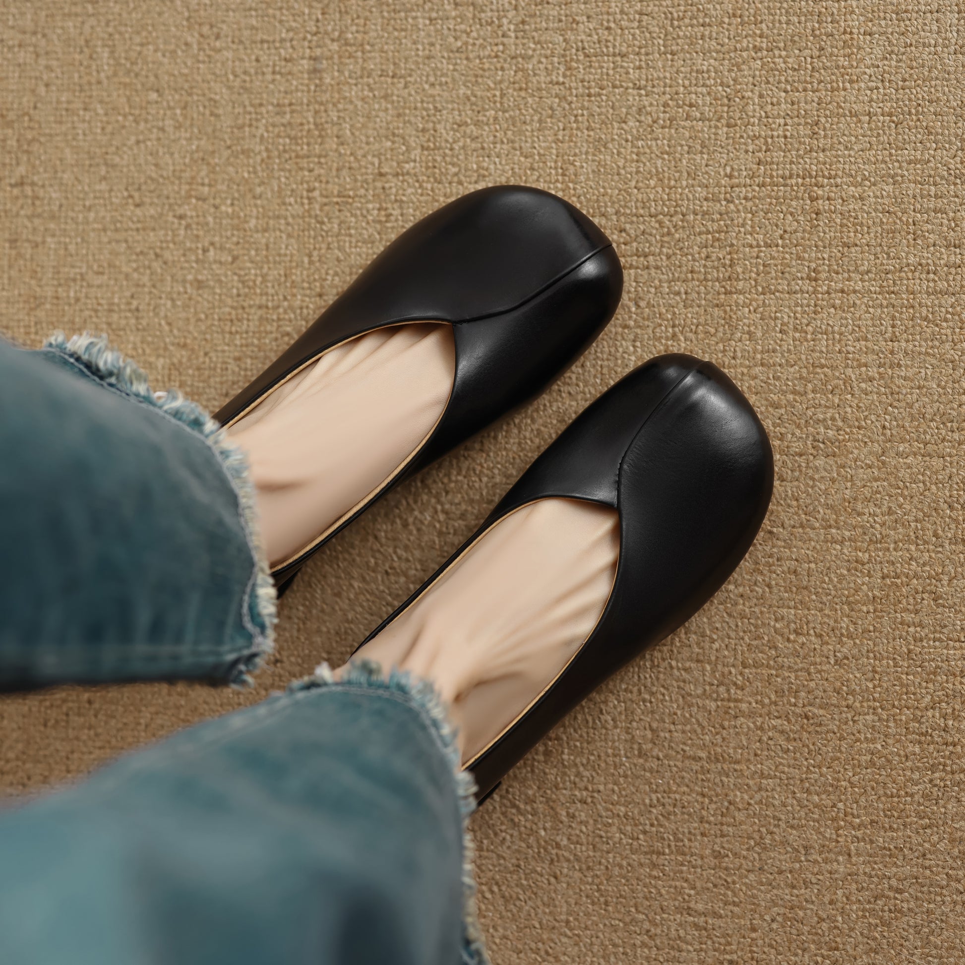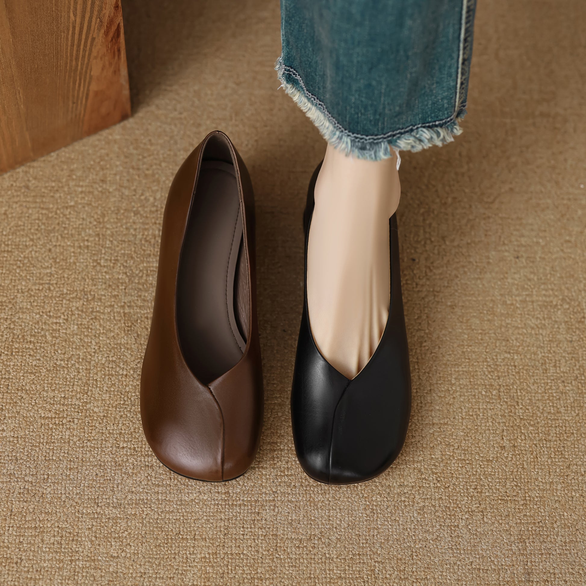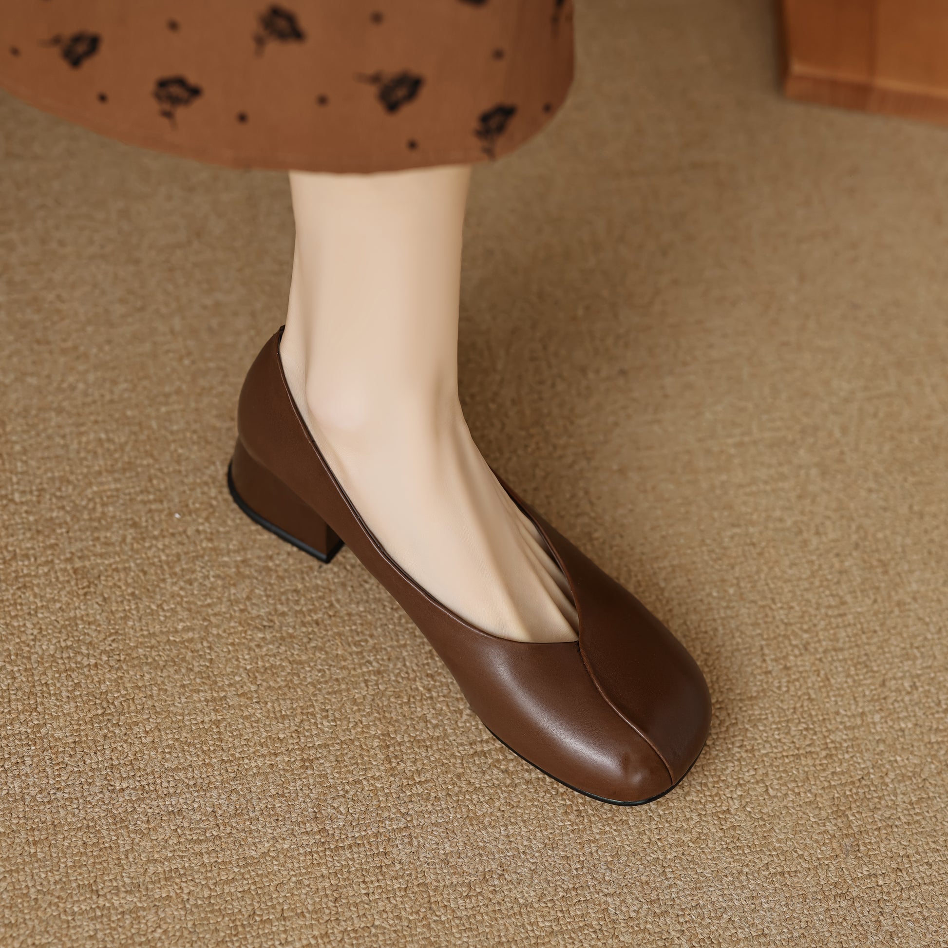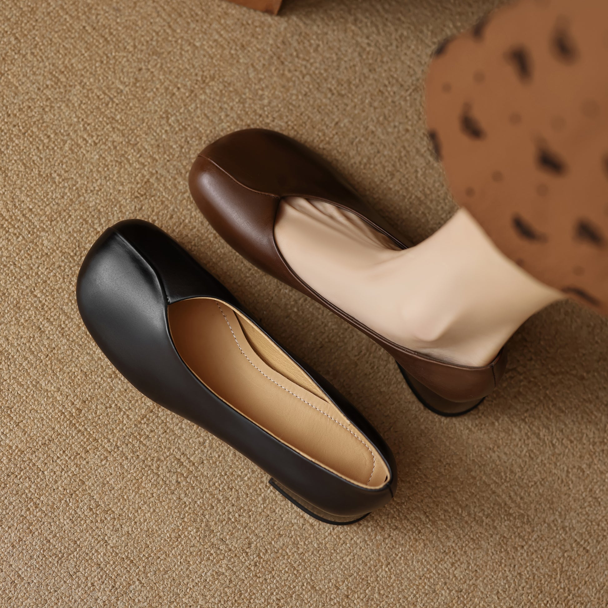 Women's Handmade Leather Slip-on Round Toe Low Heel Block Pumps