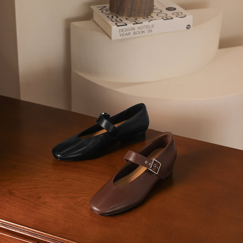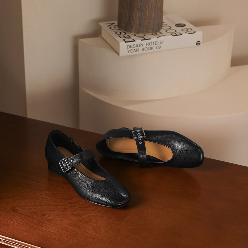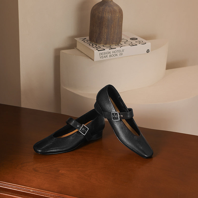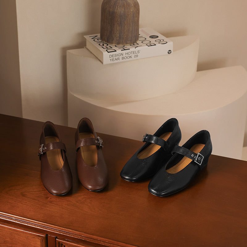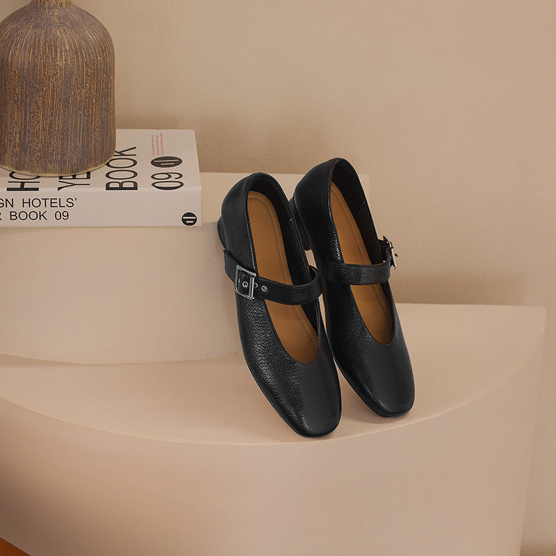 The VintageStep MaryJane is a timeless women's flat that blends vintage charm with artisanal quality. Handcrafted from buttery-soft lambskin, this classic design features a breathable sheepskin lining and durable cowhide insole for all-day comfort. The 3cm heel and flexible rubber sole provide subtle elevation, while the rounded toe and adjustable buckle strap ensure a secure fit.