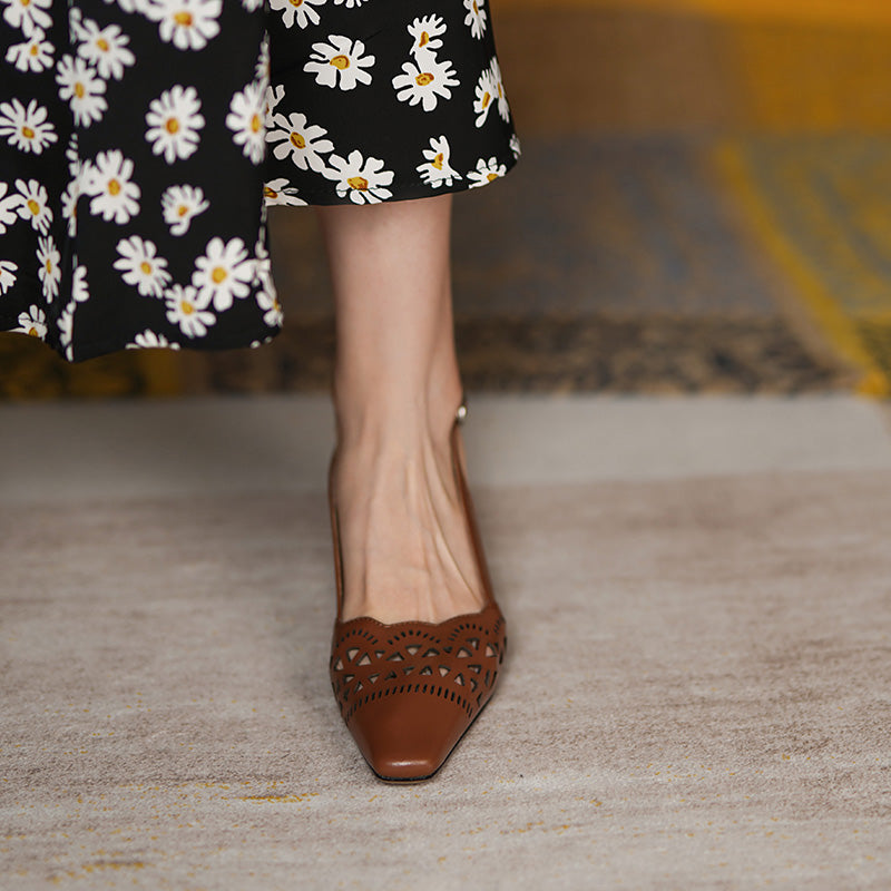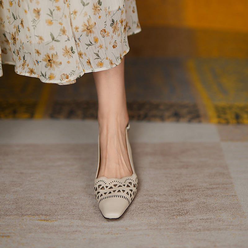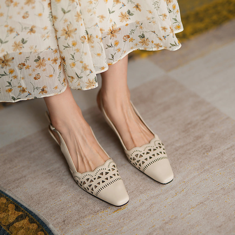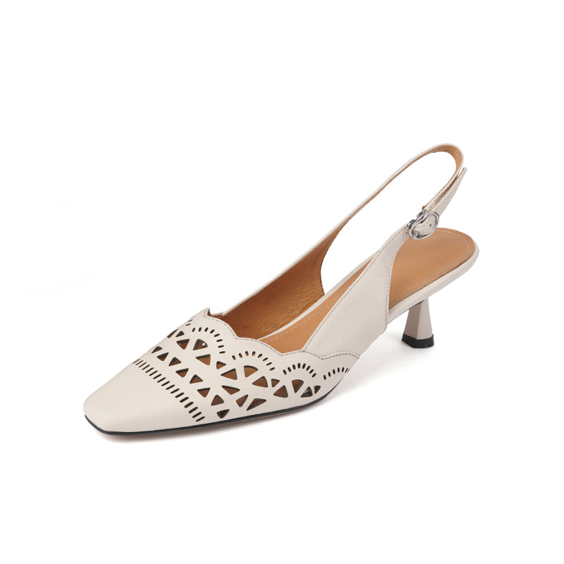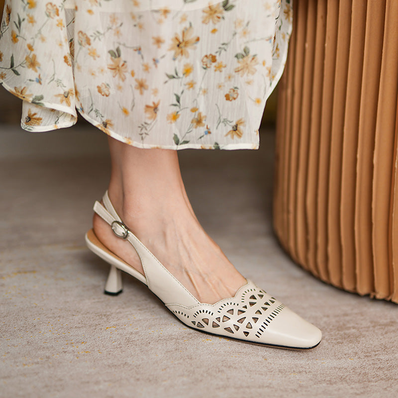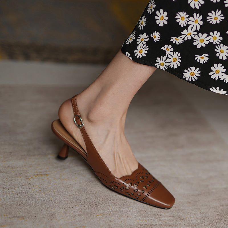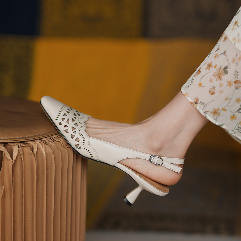 The RetroHollow SlingLuxe is a vintage-inspired women's sandal that blends retro charm with summer sophistication. Handcrafted from premium cowhide with delicate cut-out detailing, this elegant design features a smooth microfiber lining and breathable sheepskin insole for comfortable wear. The 5cm kitten heel and flexible TPR sole provide graceful elevation, while the pointed toe elongates the silhouette.