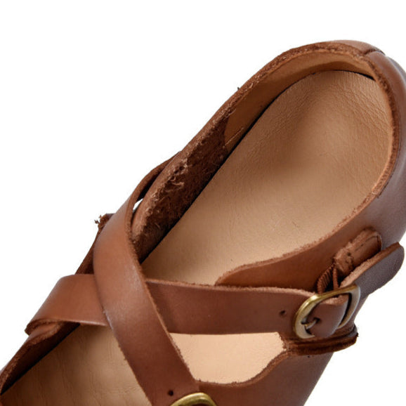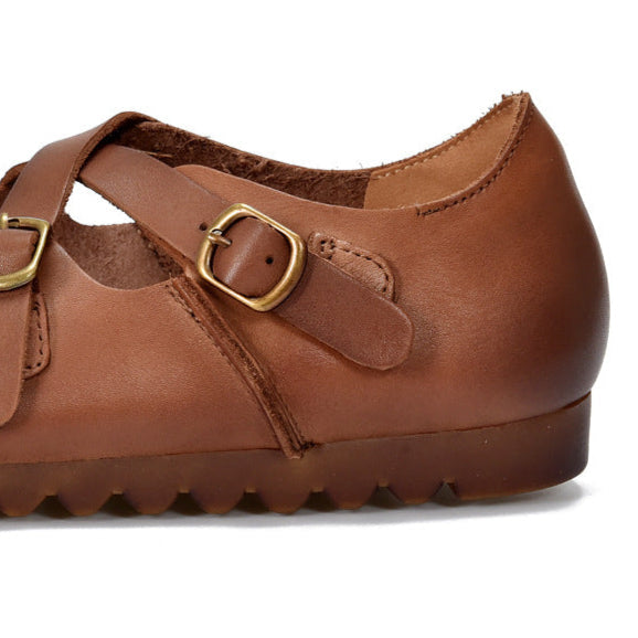 These unique flat shoes bring a vintage touch to any outfit. Made with genuine leather and a cross strap design, these shoes are both stylish and comfortable. Perfect for adding some personality to your casual look.
