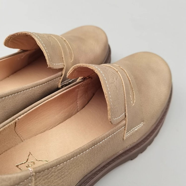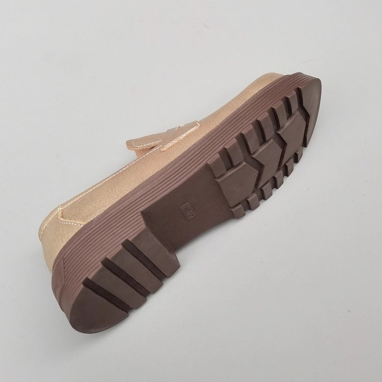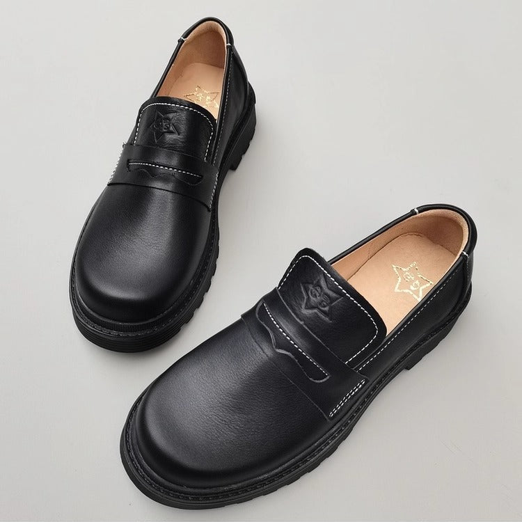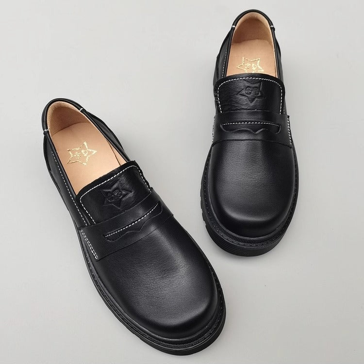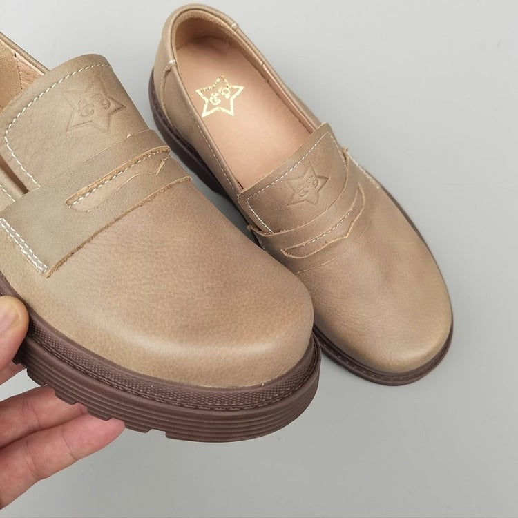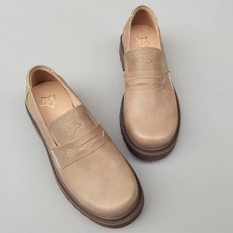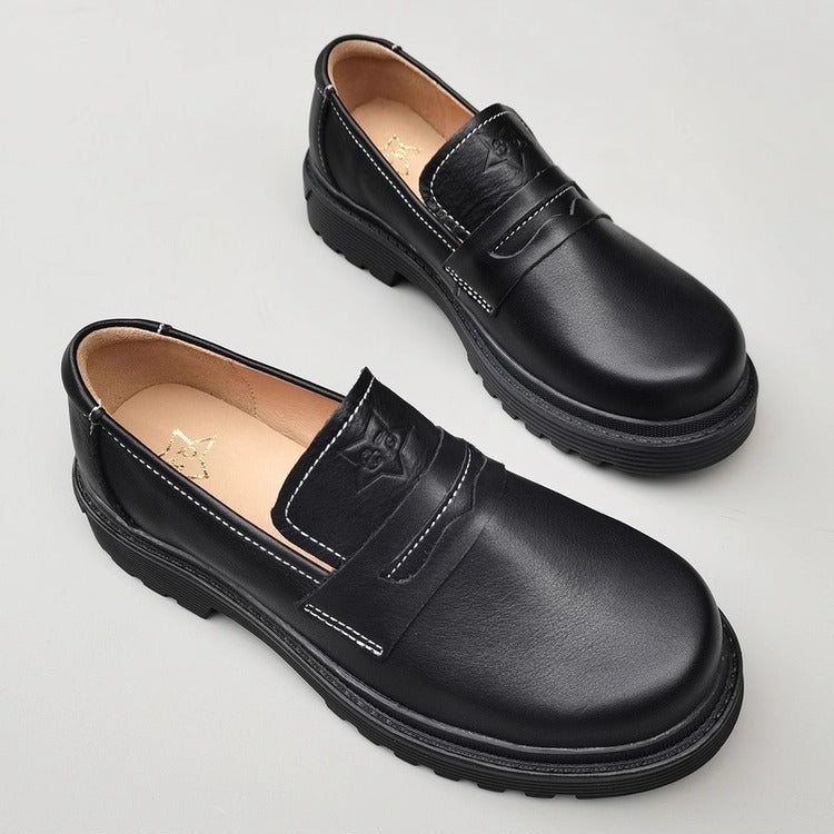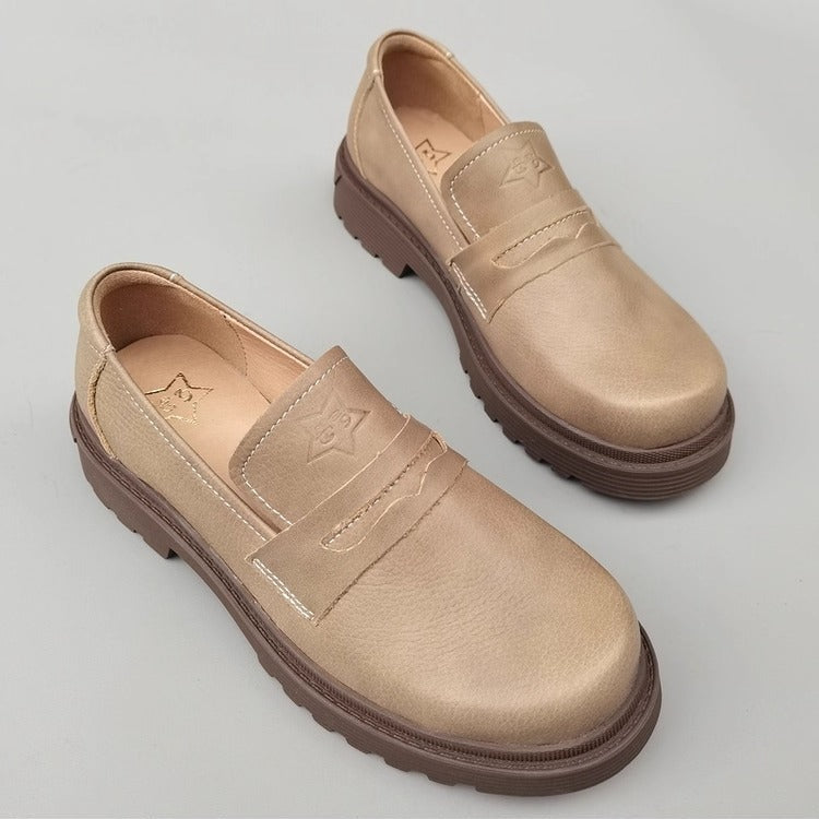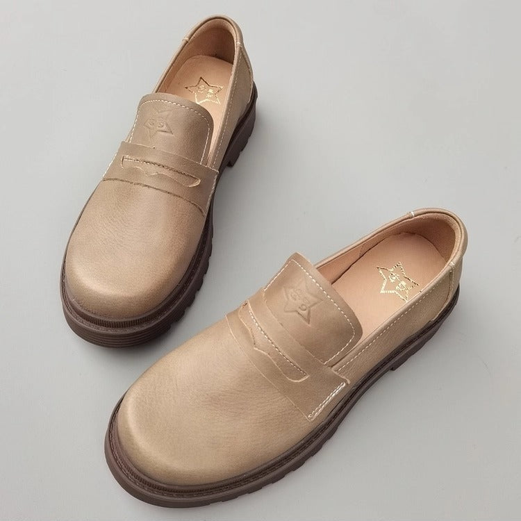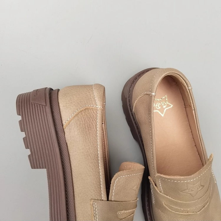 Women's Leather Mid Heel Chunky Loafers – Japanese Style & Non-Slip Sole