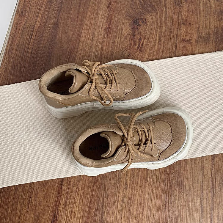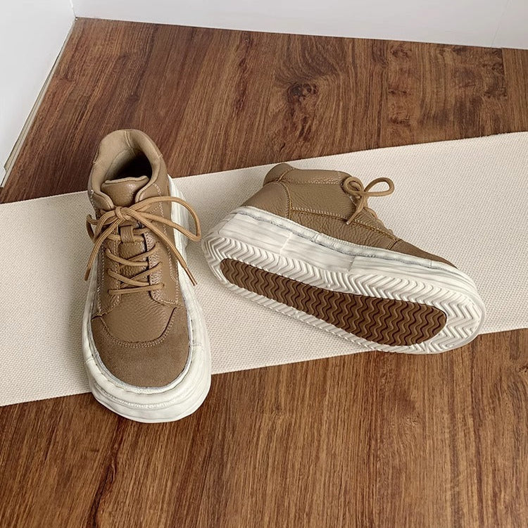 Stand out with these trendy high-top sneakers featuring a unique leather patchwork design. Crafted from second-layer cowhide with cloth and latex insole for breathable comfort. The 4cm heel adds subtle height, while the lace-up closure ensures a snug fit. Available in Beige, Khaki, and Black—perfect for autumn and winter casual wear.
