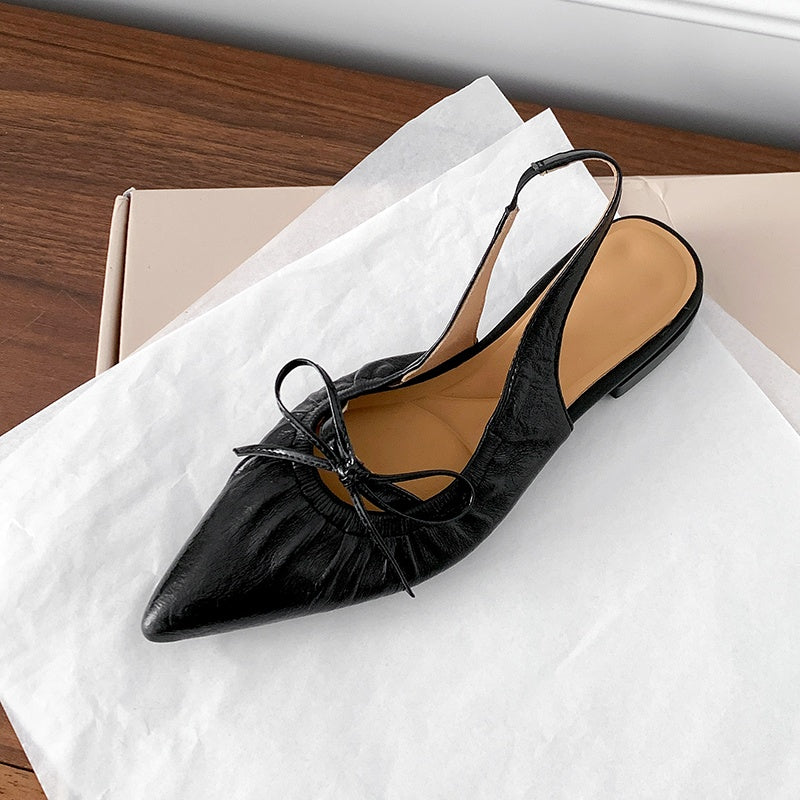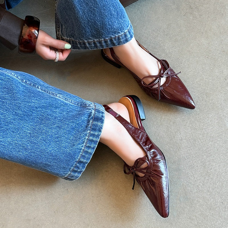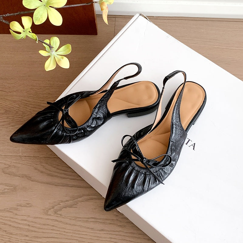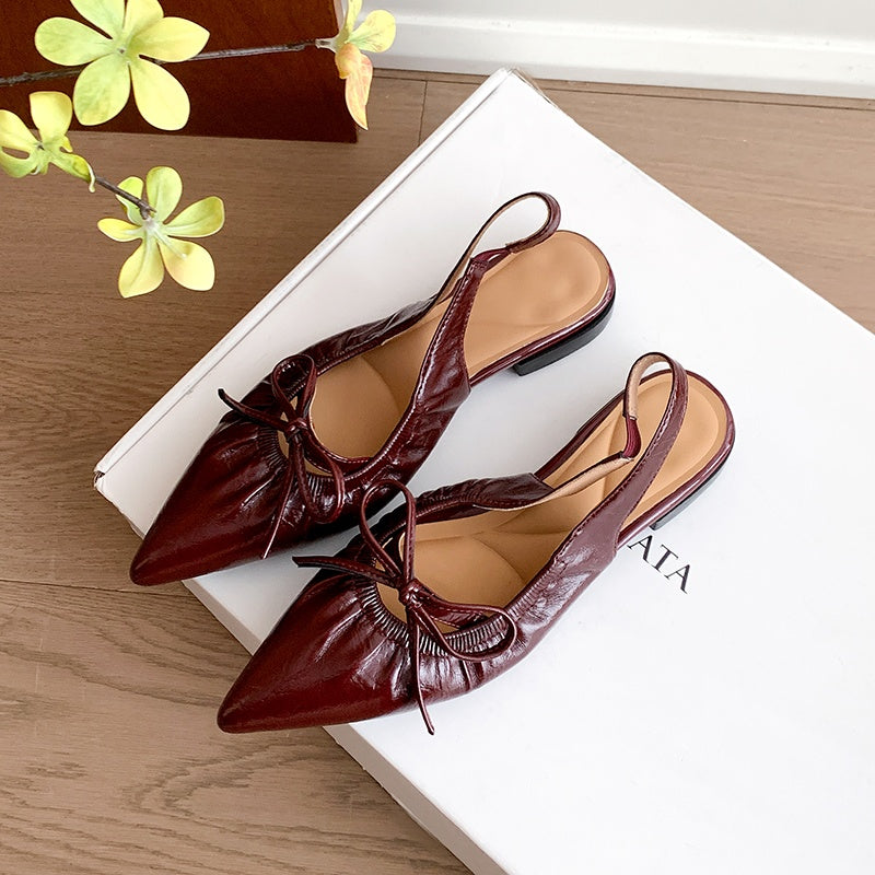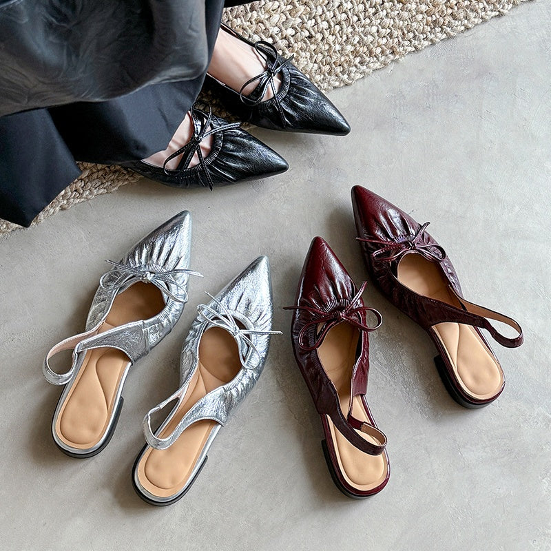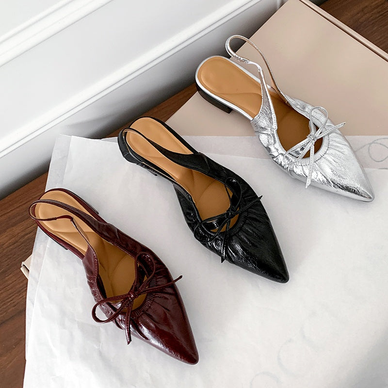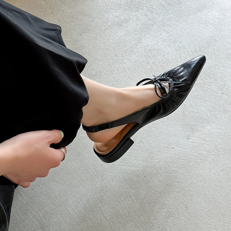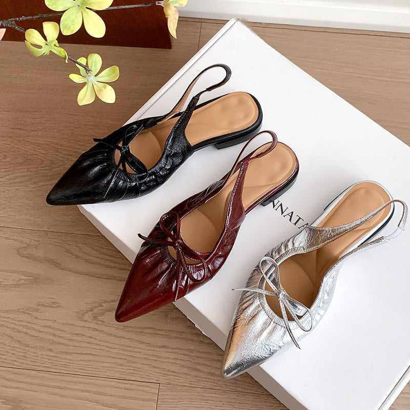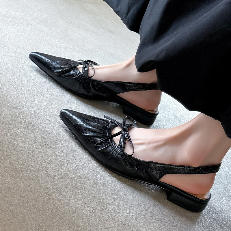 Women's Leather Pointed Toe Bowknot Low Heel Slingback Sandals
