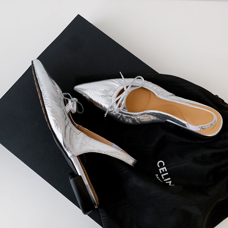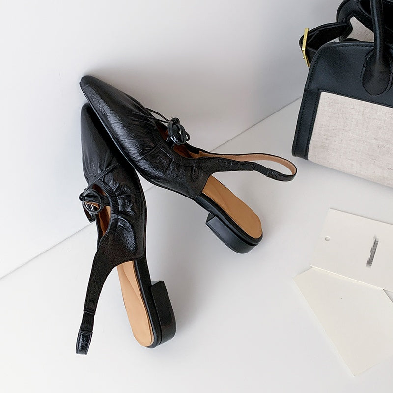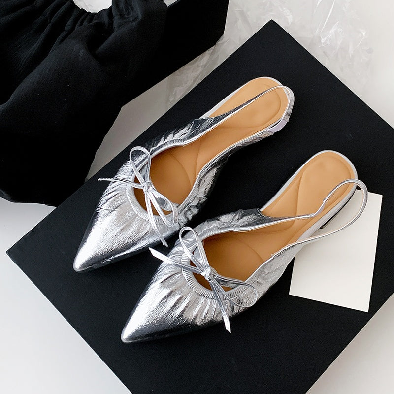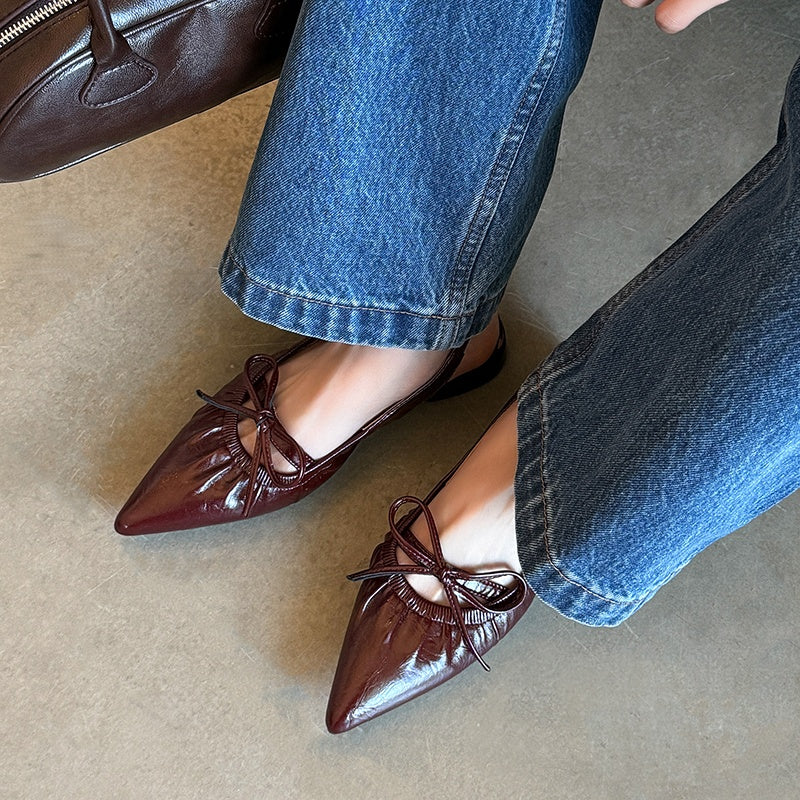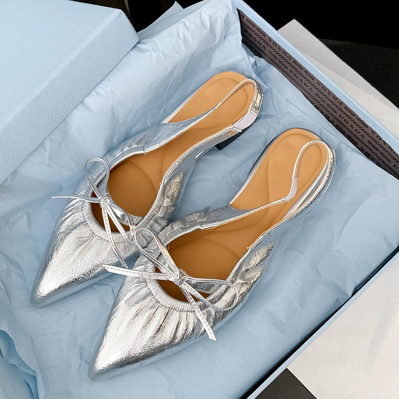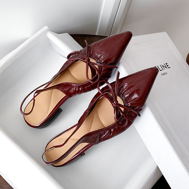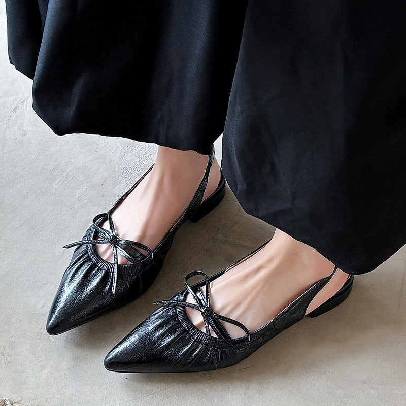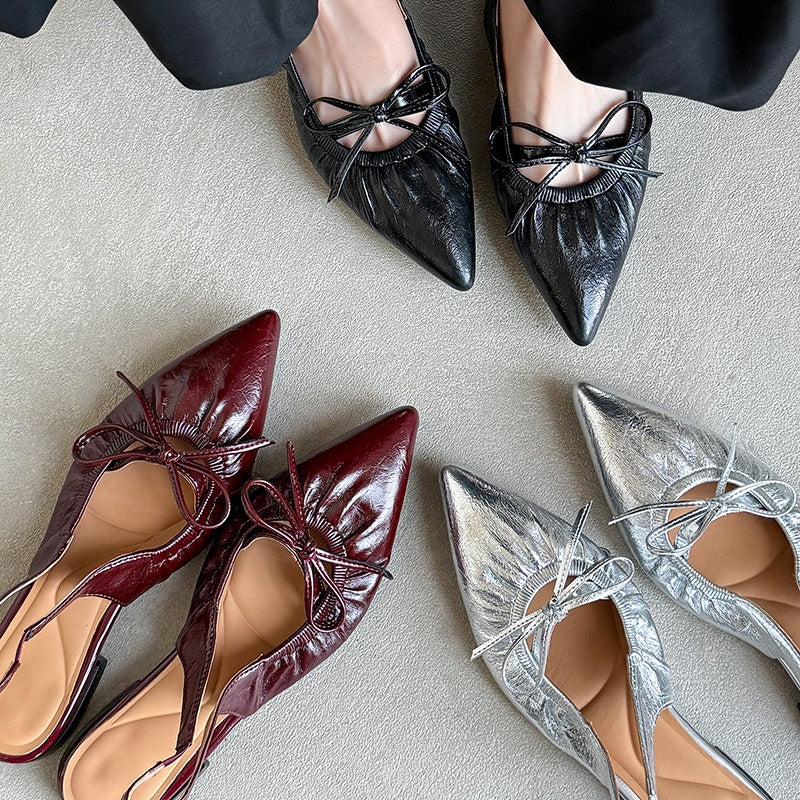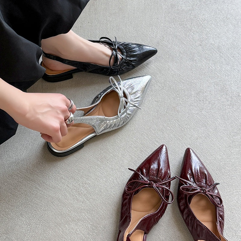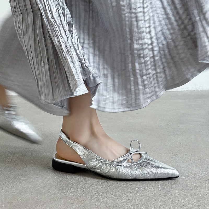 Women's Leather Pointed Toe Bowknot Low Heel Slingback Sandals