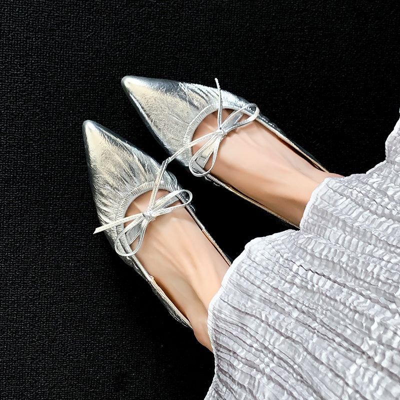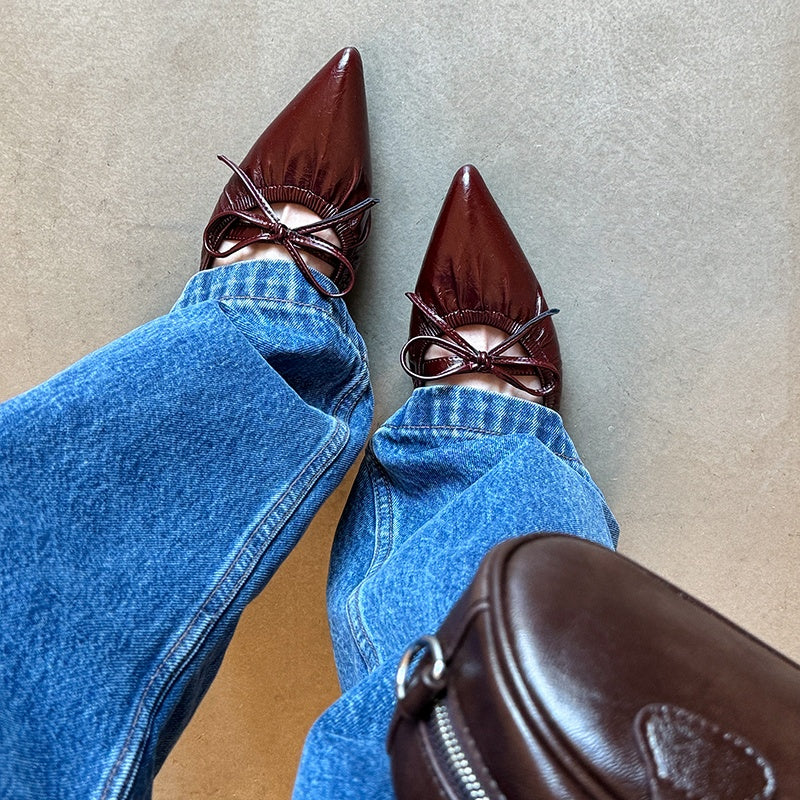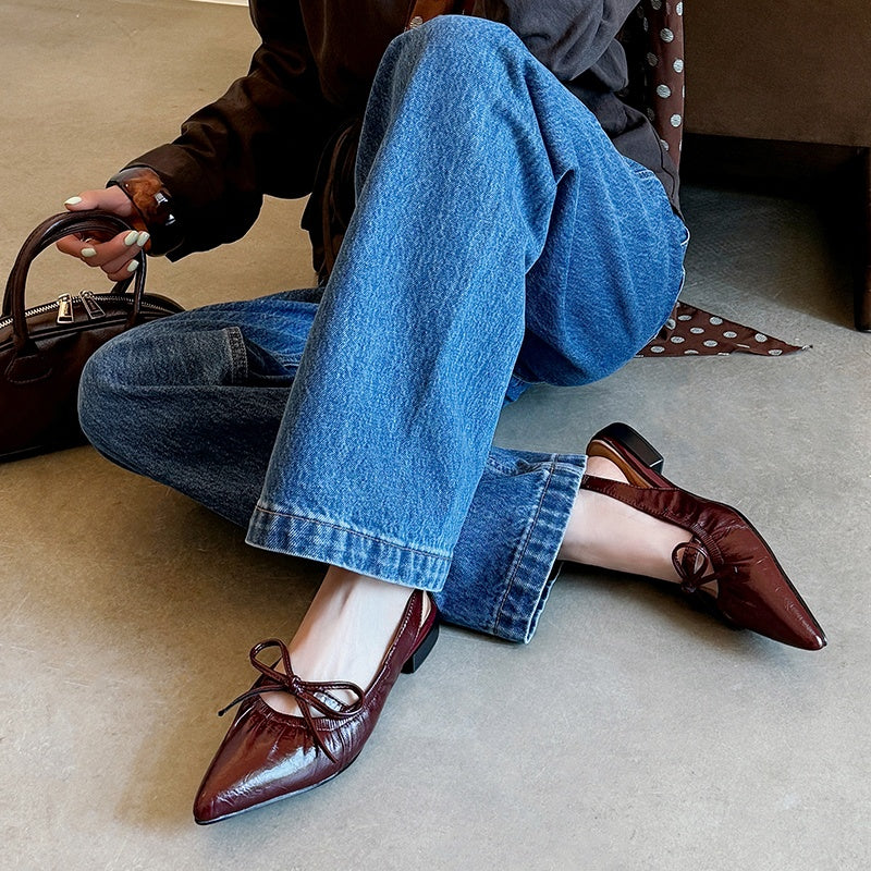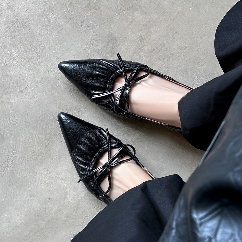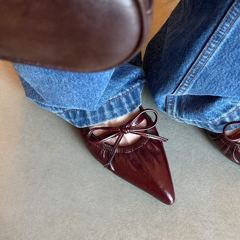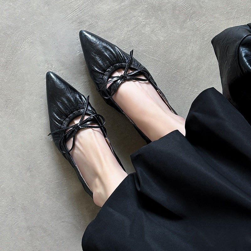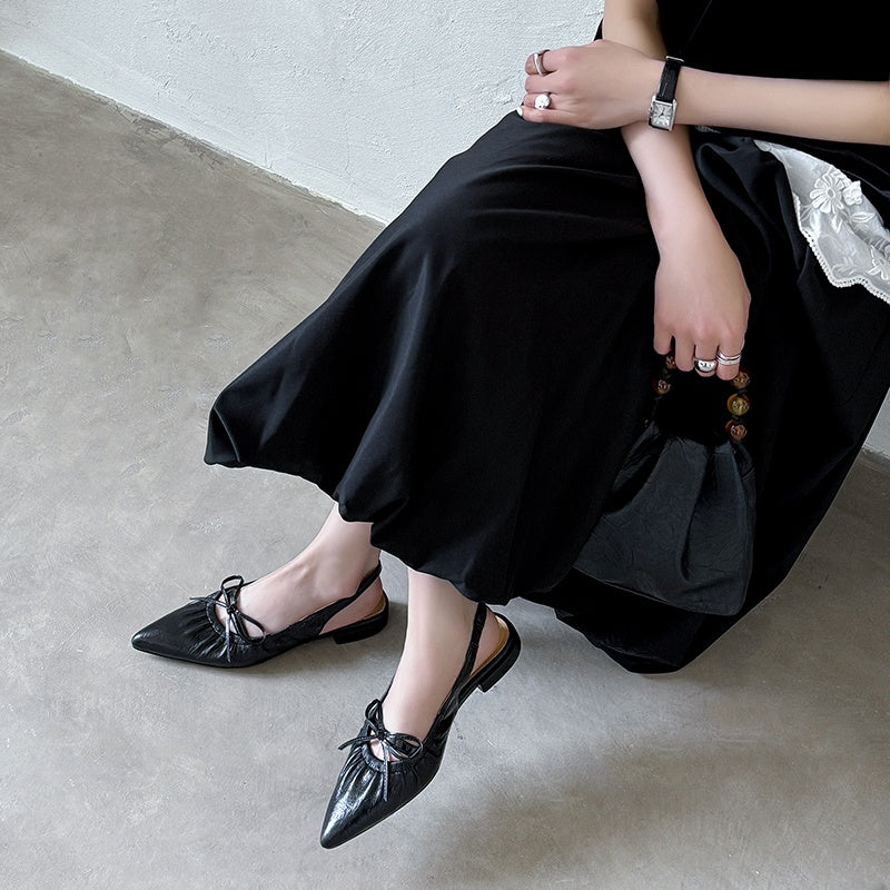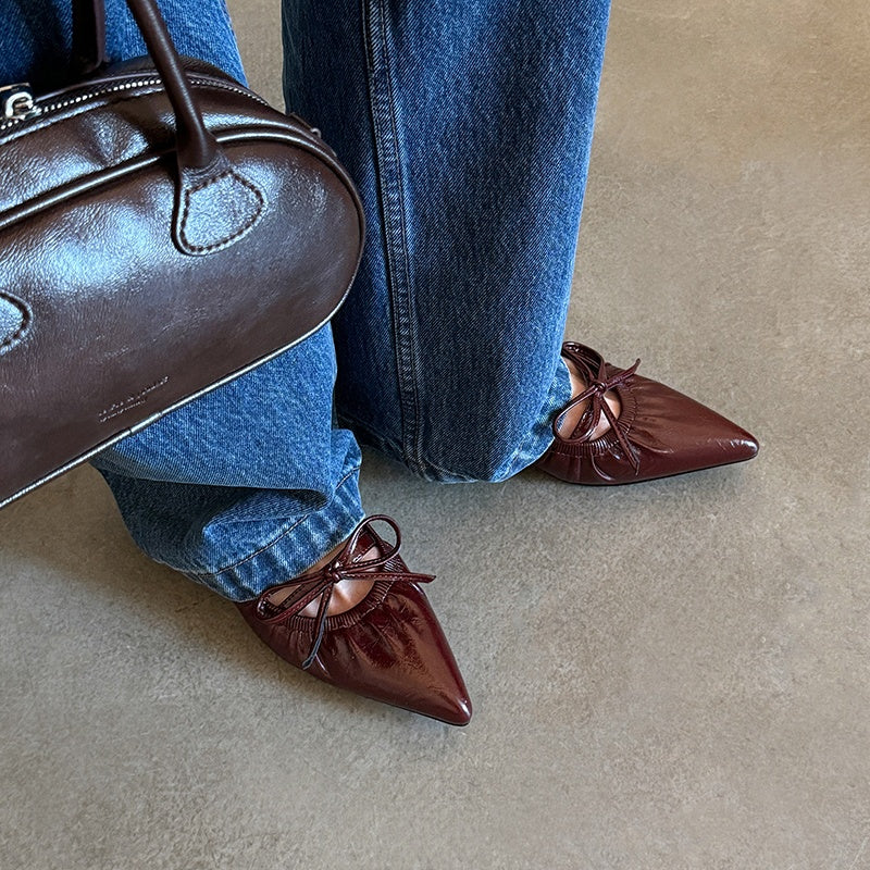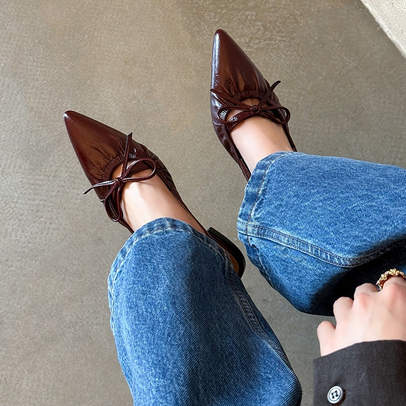 Women's Leather Pointed Toe Bowknot Low Heel Slingback Sandals
