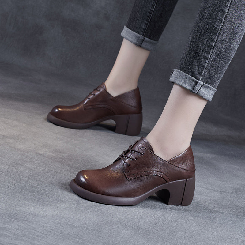 Women's Leather Retro Lace-up Block Heel Oxford Shoes