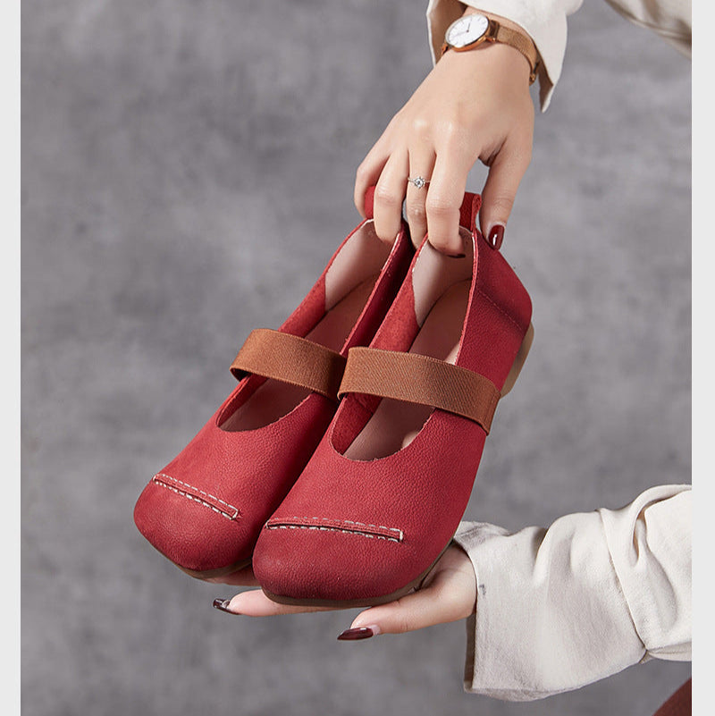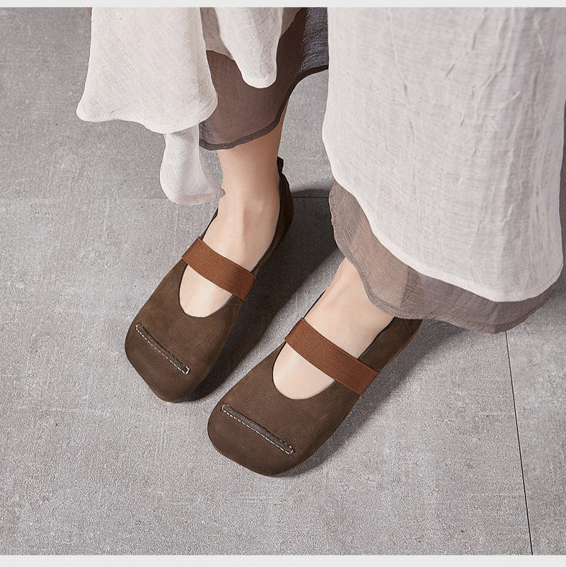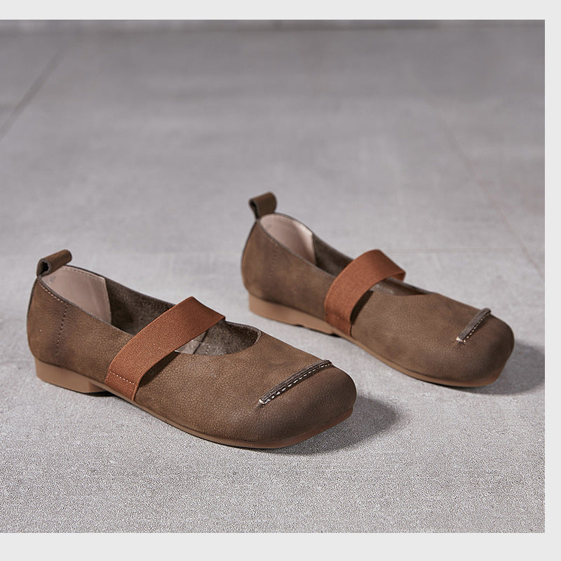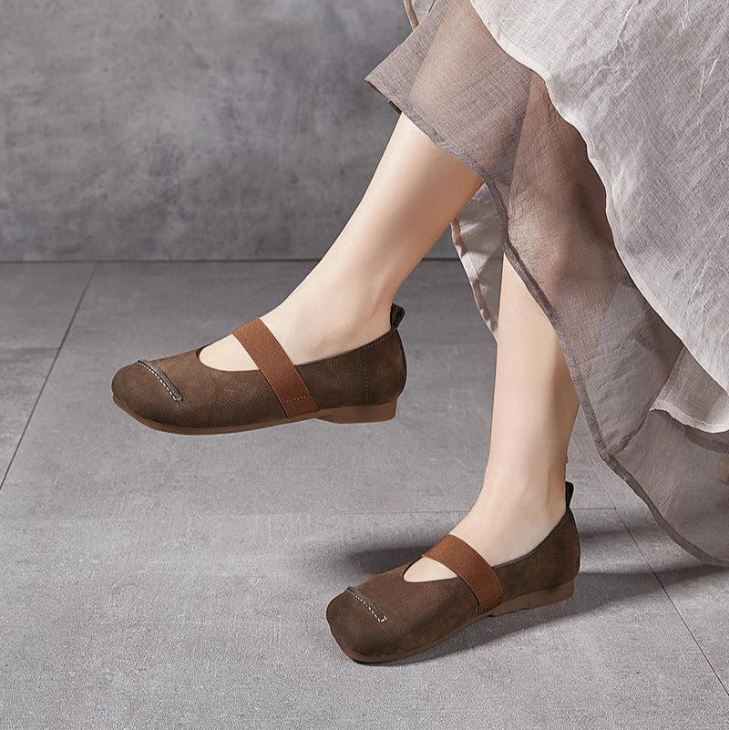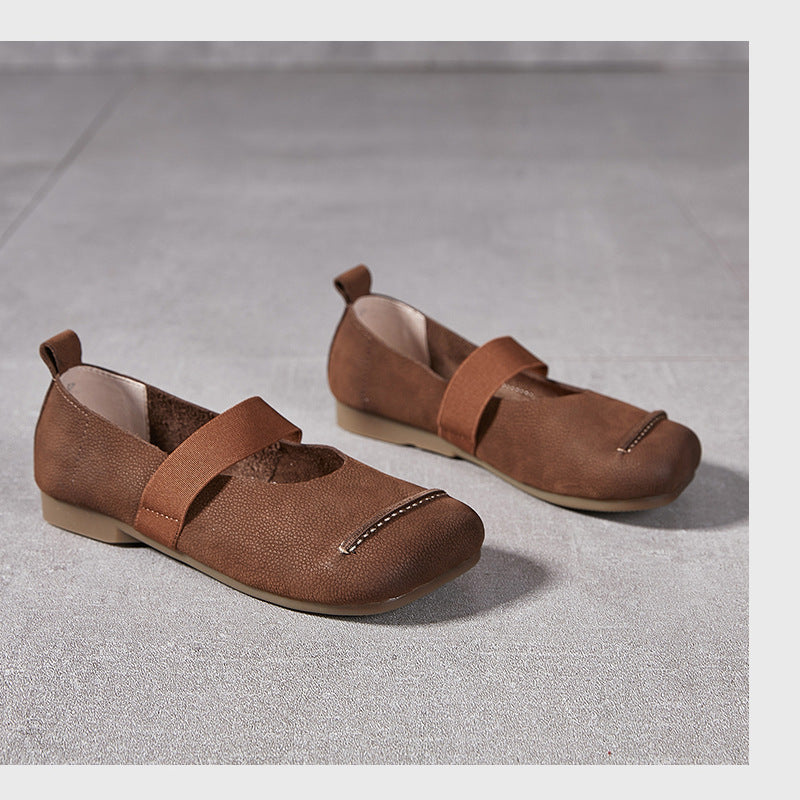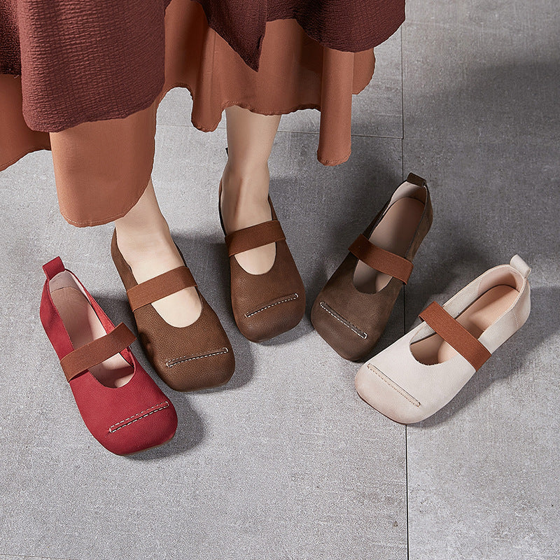 Women's Leather Retro Square Toe Elastic Band Slip On Flat Shoes
