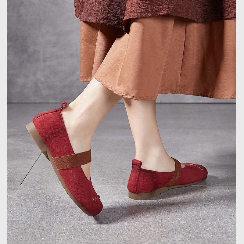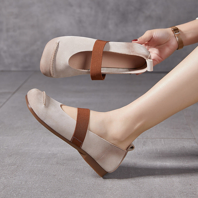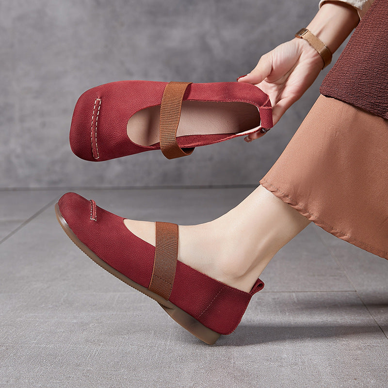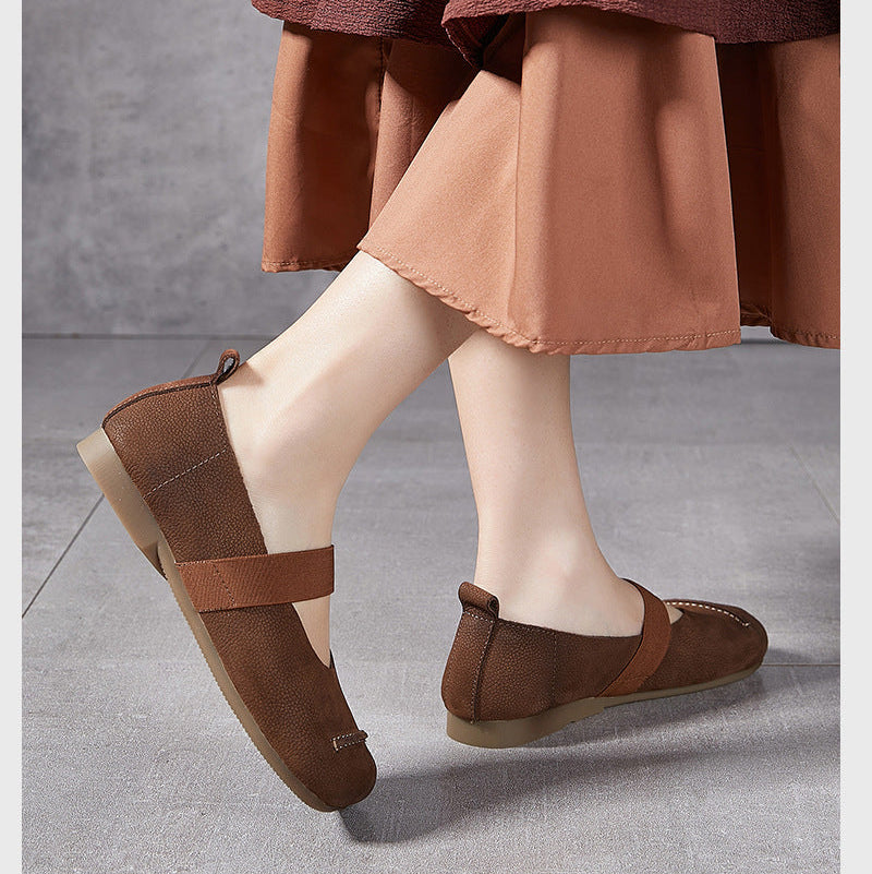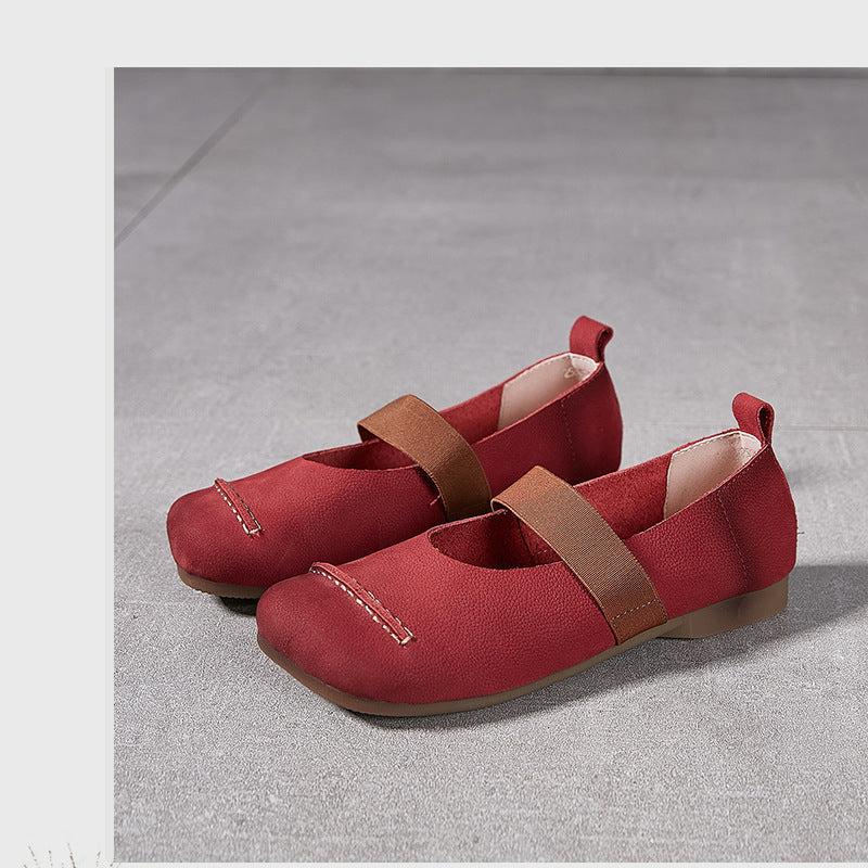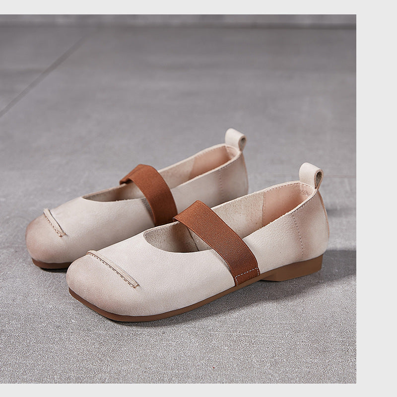 Women's Leather Retro Square Toe Elastic Band Slip On Flat Shoes
