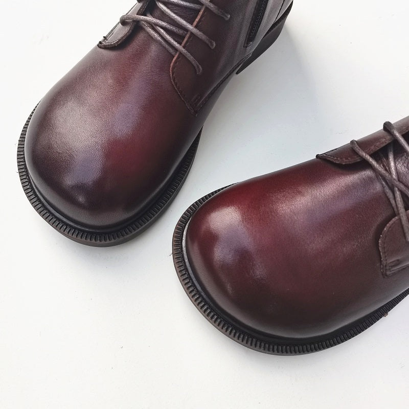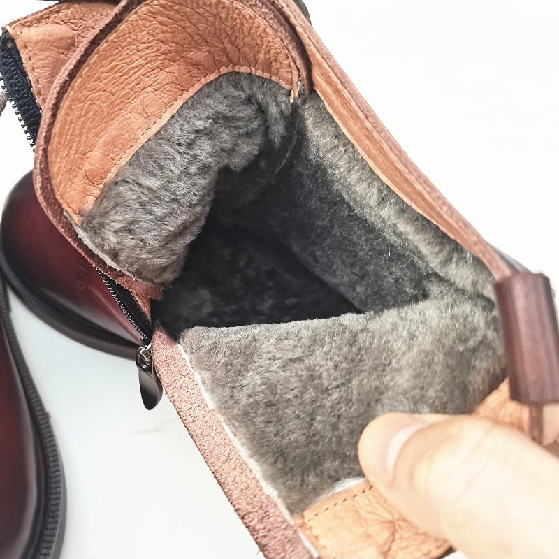 These British-style ankle boots feature a wide round toe and thick integrated sheepskin and wool lining, providing warmth and comfort from ankle to toe. The soft first-layer cowhide upper is treated with wax for a rich, classic finish. A side zipper allows easy slip-on, and the soft rubber block heel offers stability and cushioning. Designed with wider feet in mind, these boots are perfect for keeping your feet cozy during colder months while maintaining a stylish, vintage-inspired look.