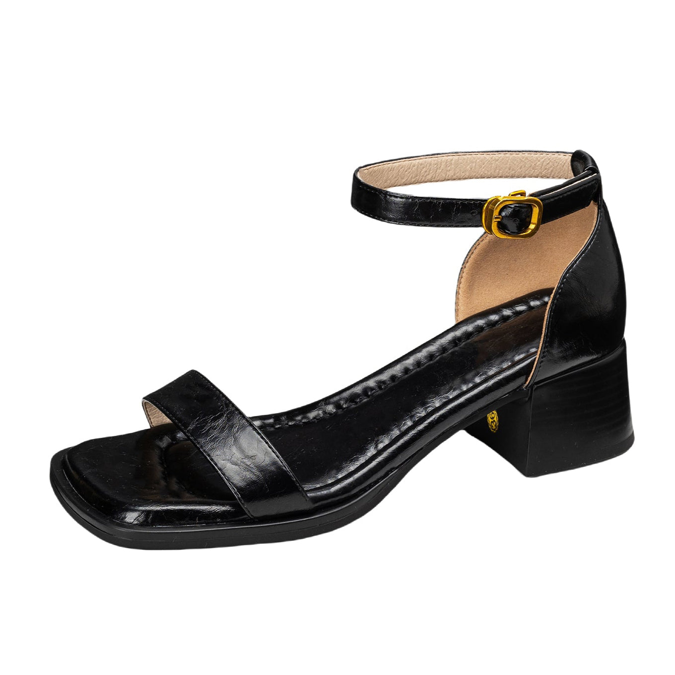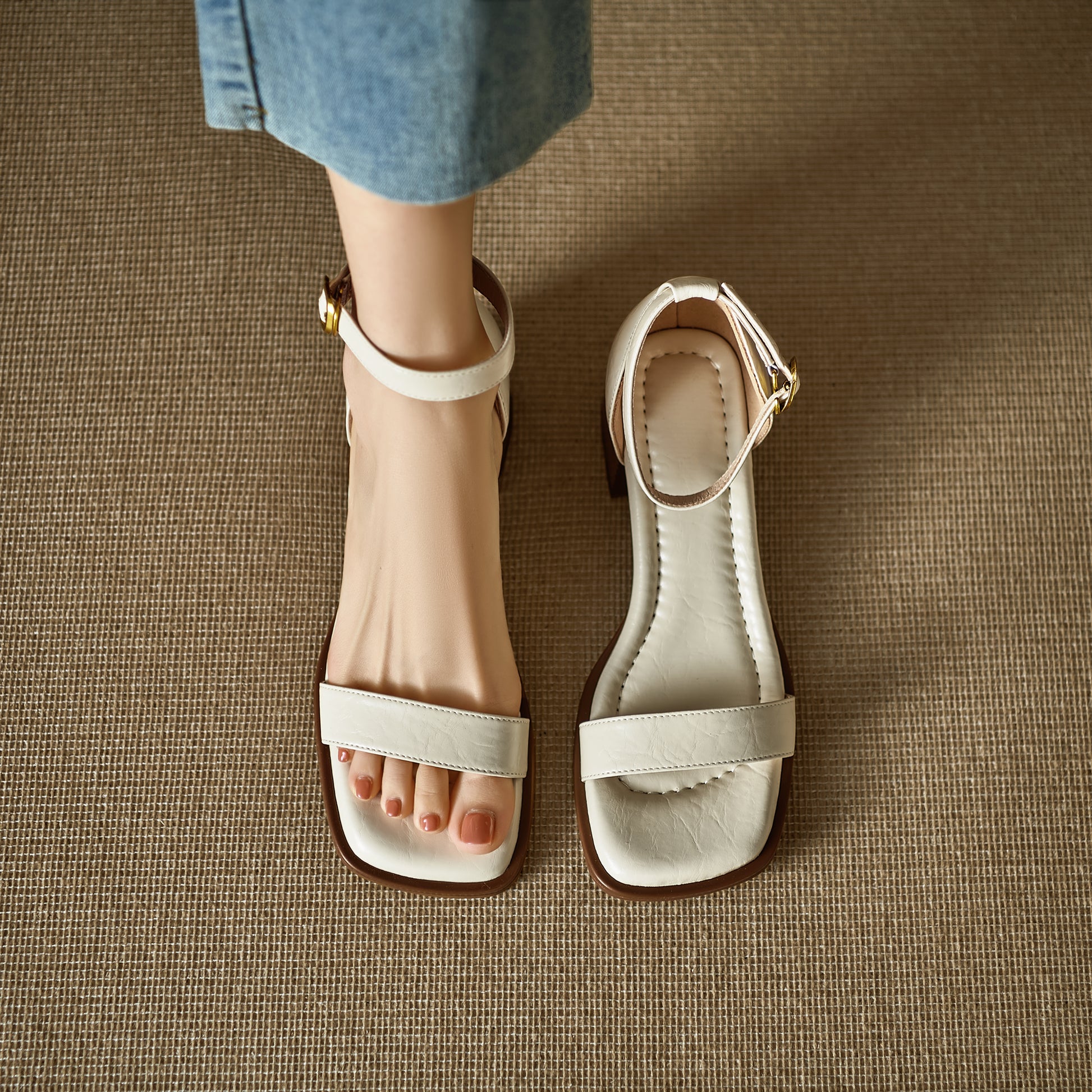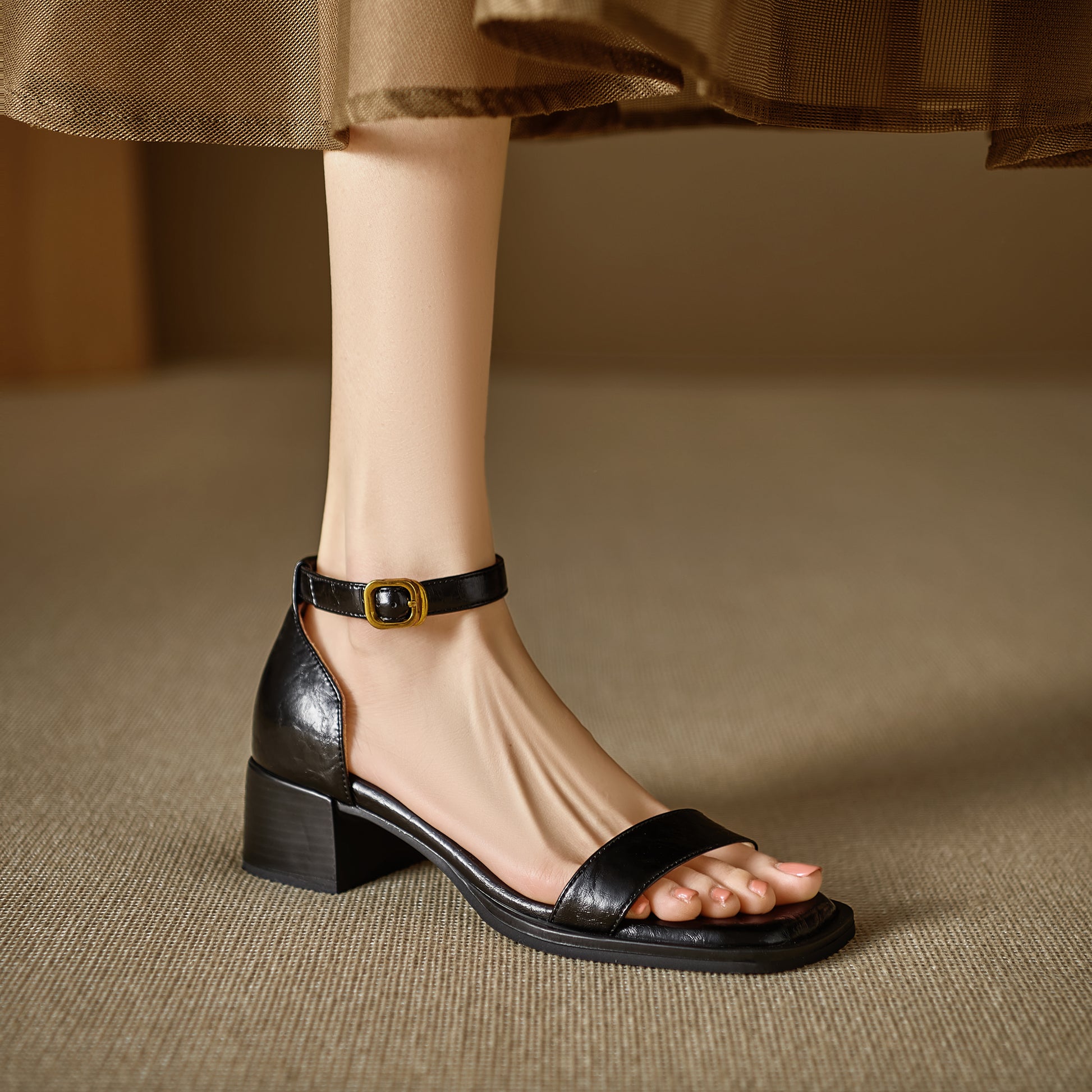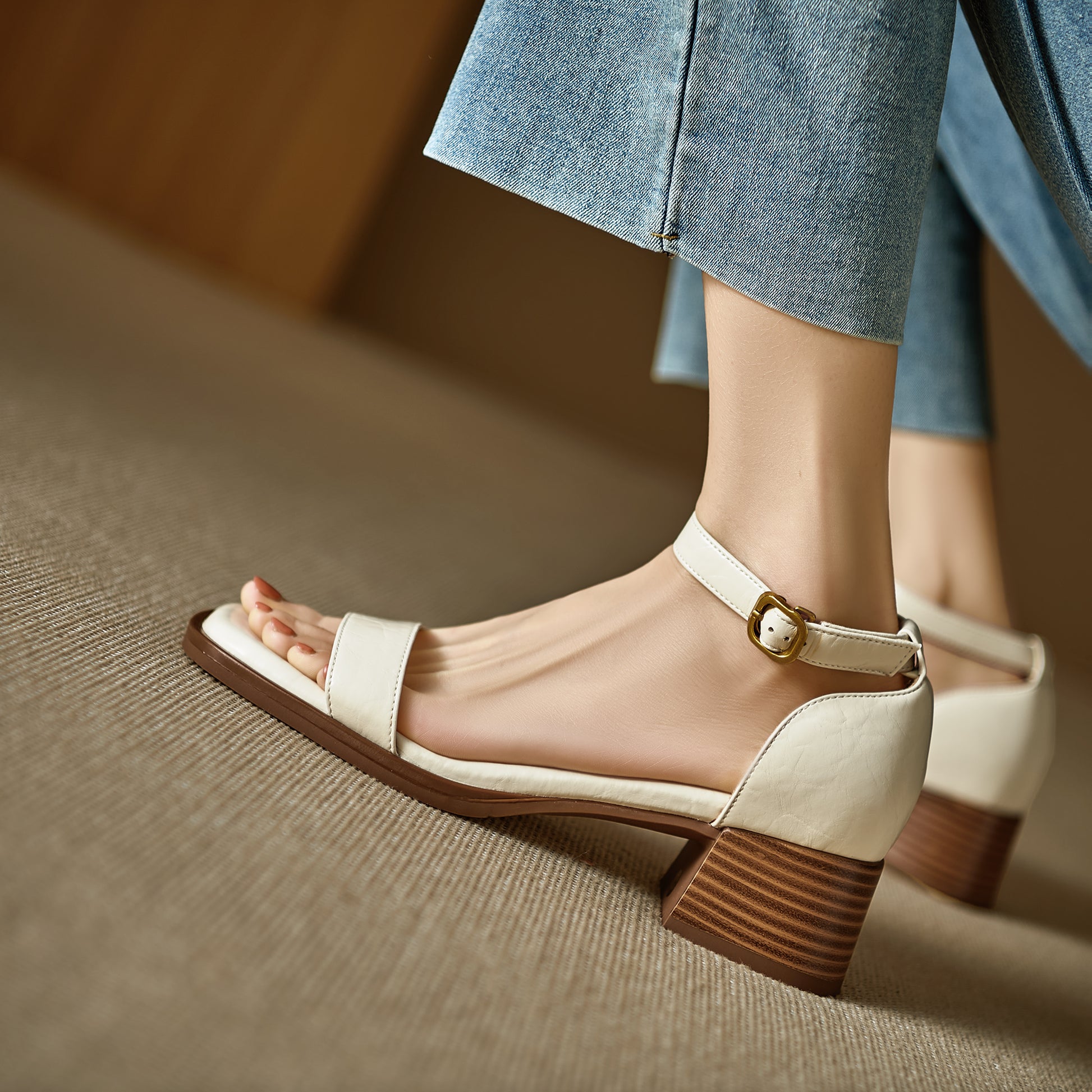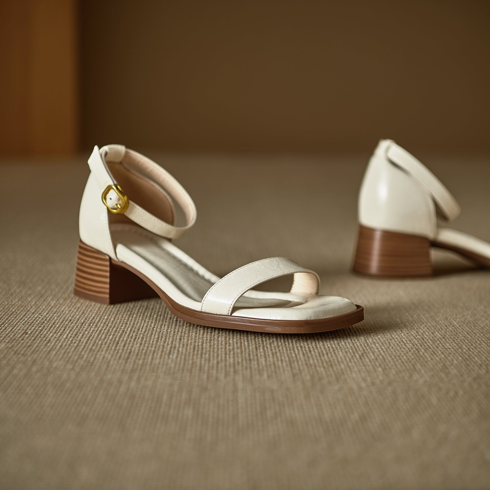 Women's Leather Summer Open Toe Ankle One Buckle Mid Heel Sandals