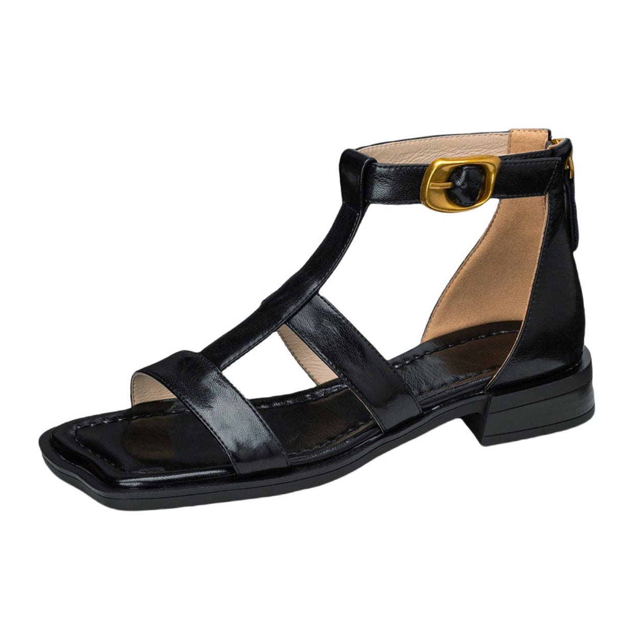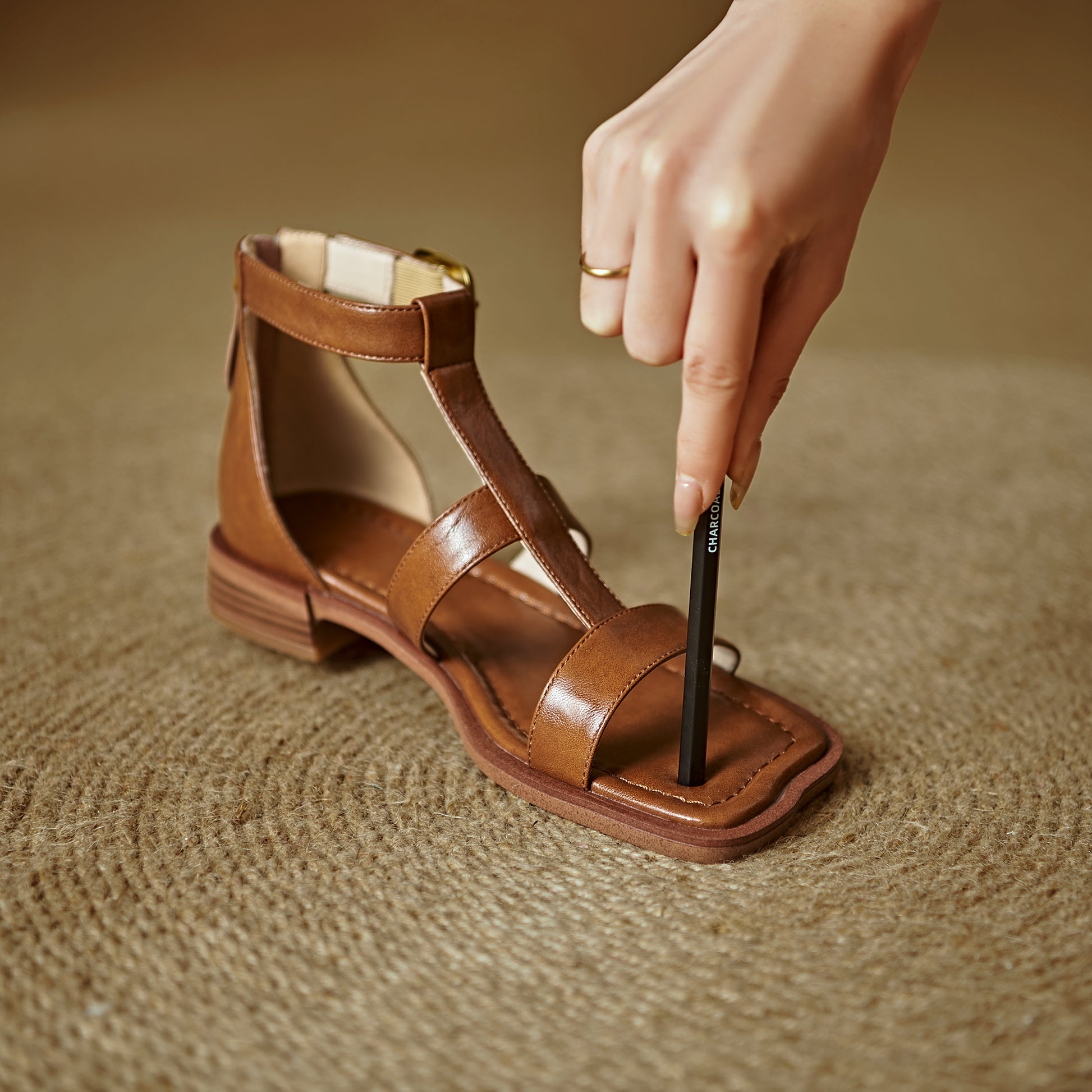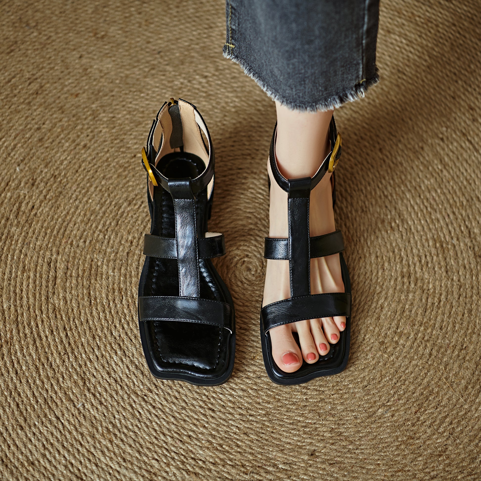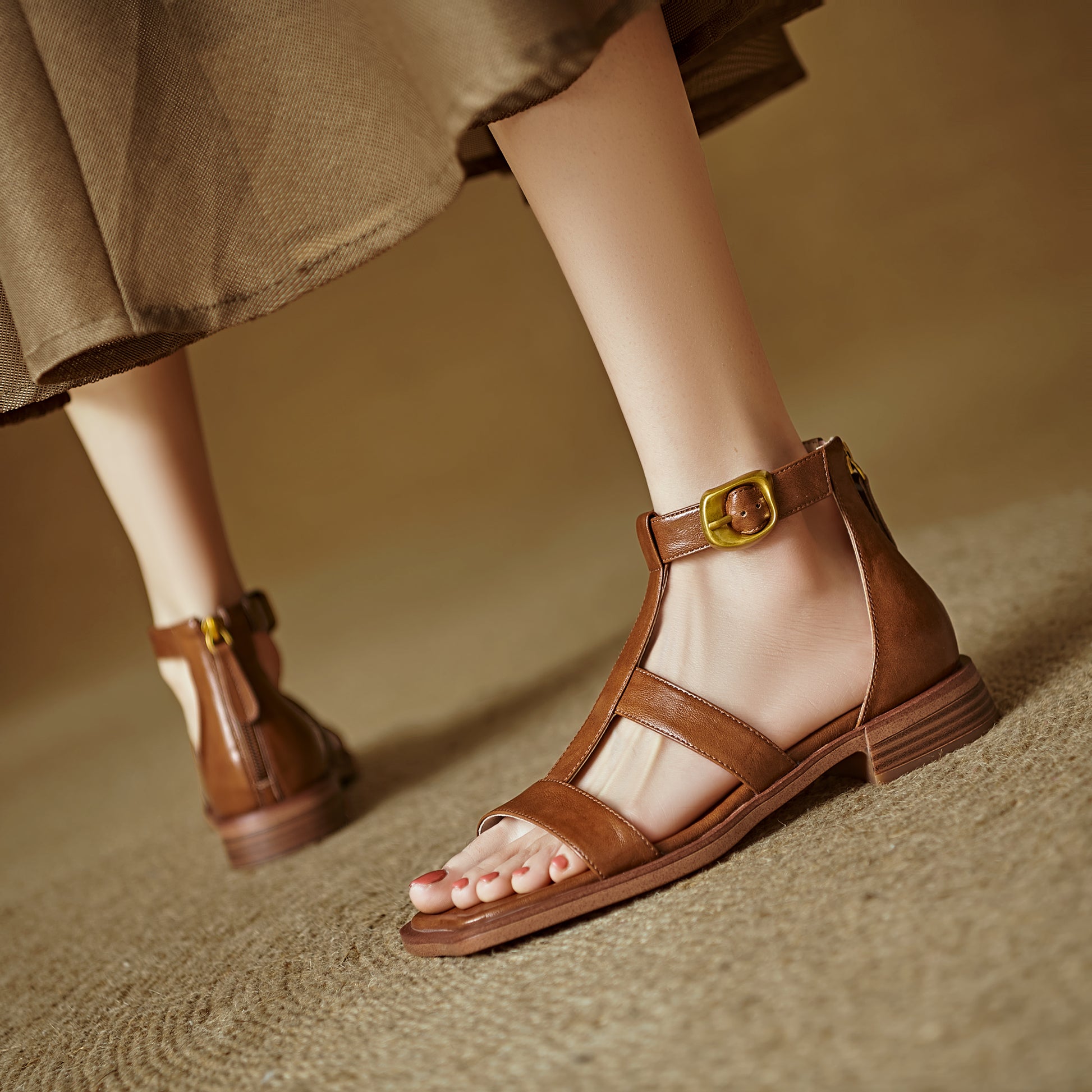Women's Leather Summer Open Toe Wide Strap Back Zipper Ankle Buckle Sandals