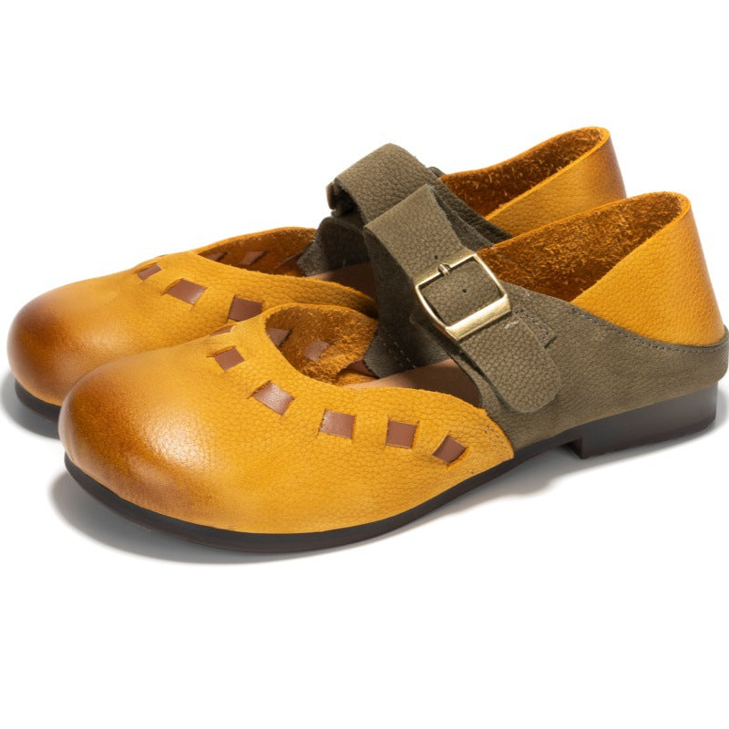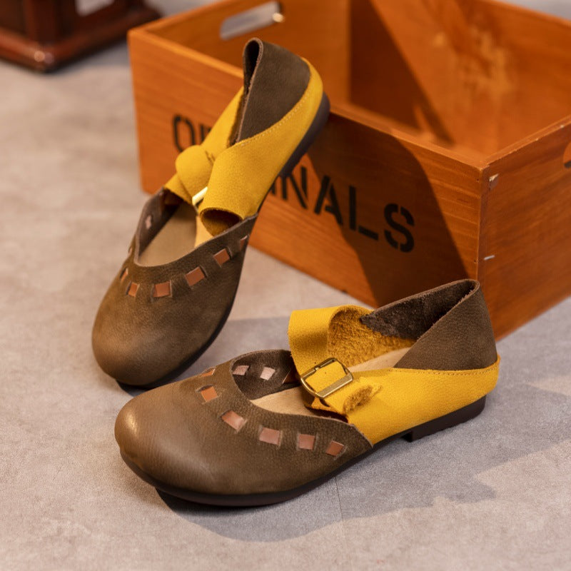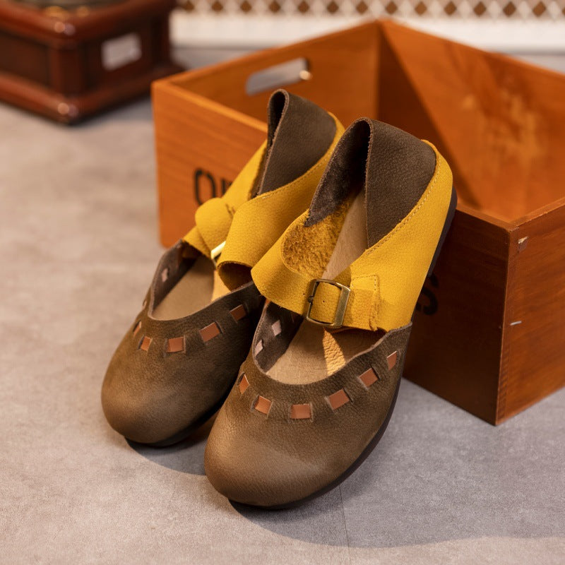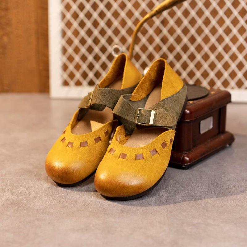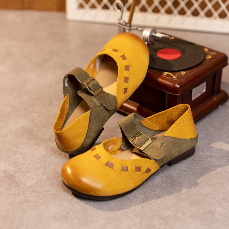 Women's Leather Vintage Patchwork Round Toe Flat Mary Jane