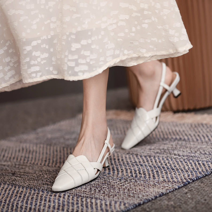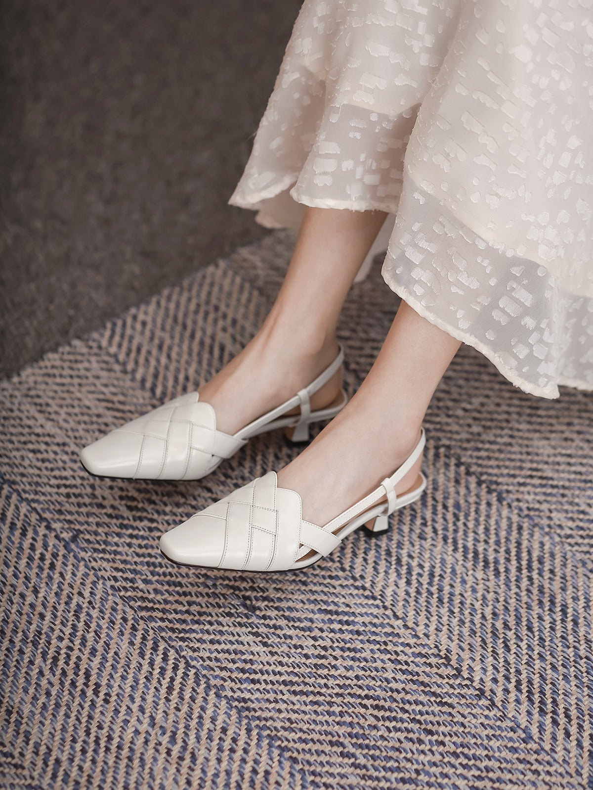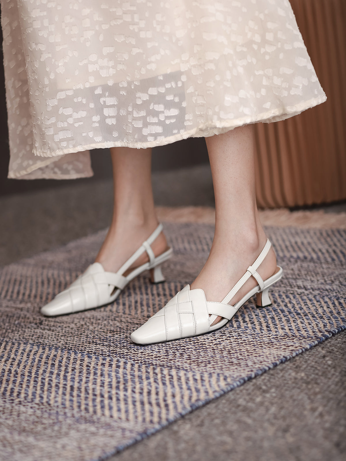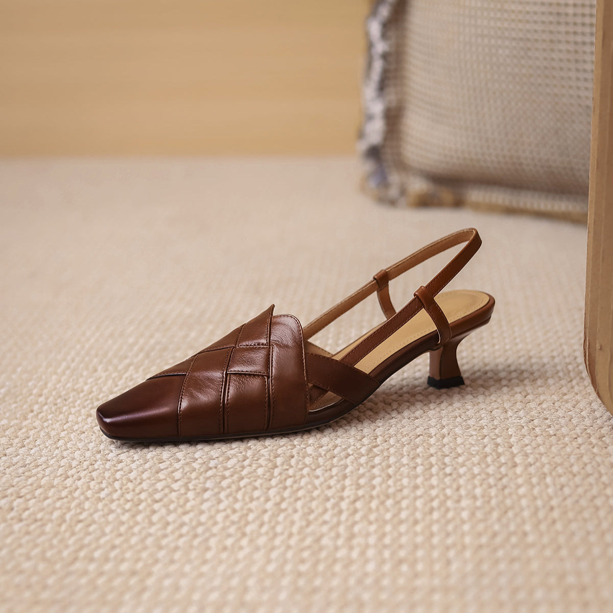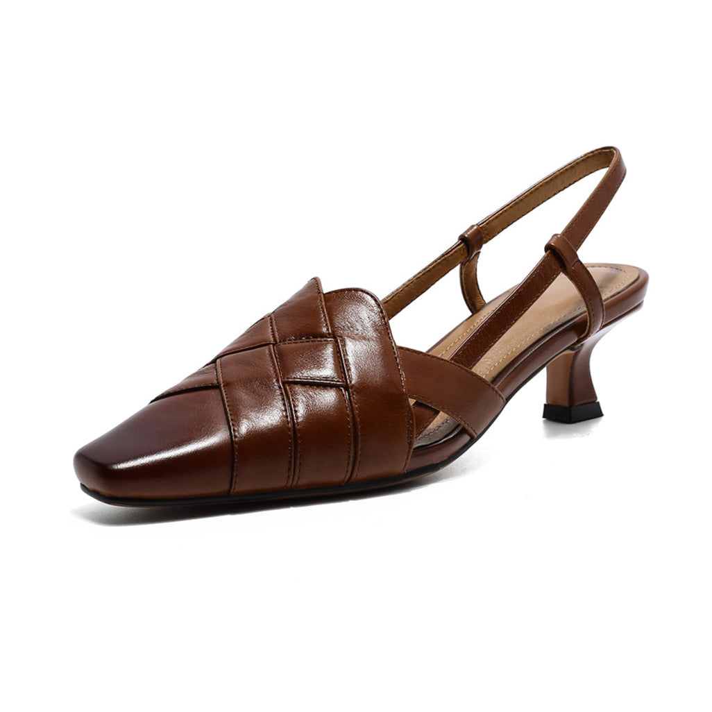 Women's Leather Woven Closed Toe Slingback Kitten Heel Sandals