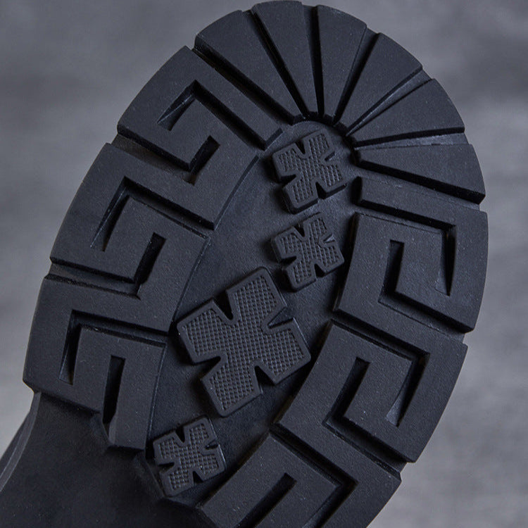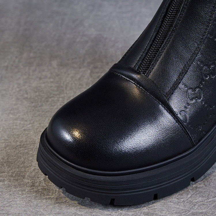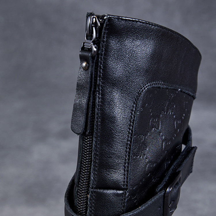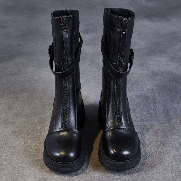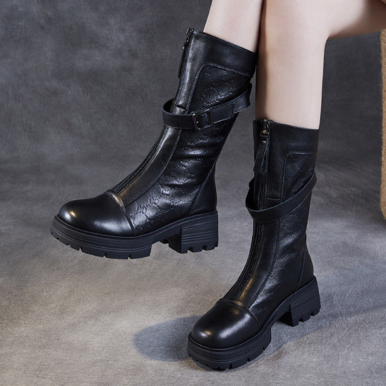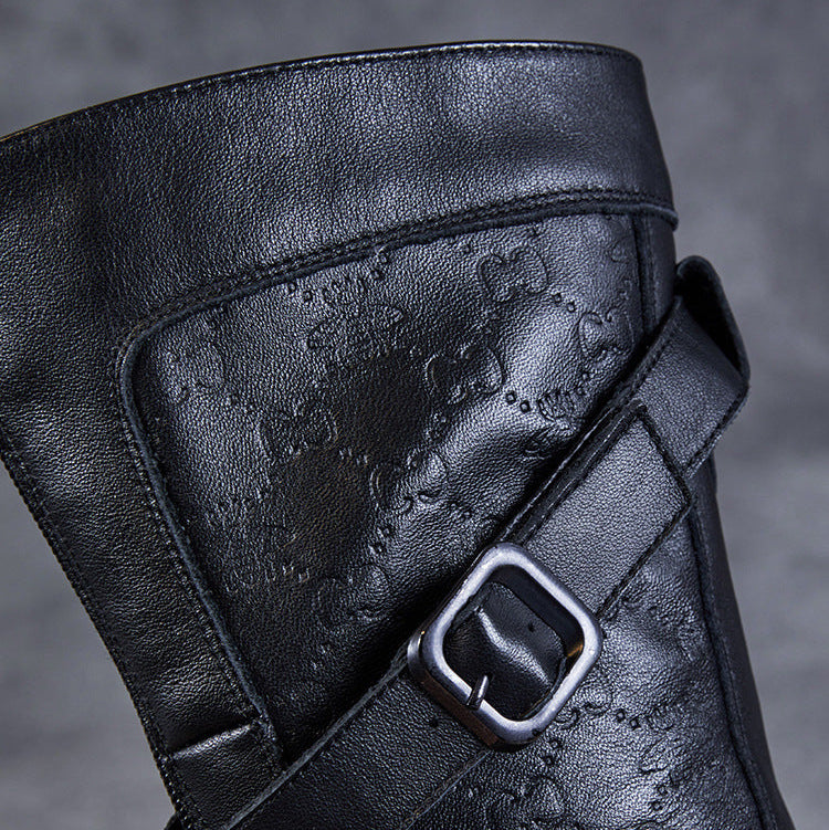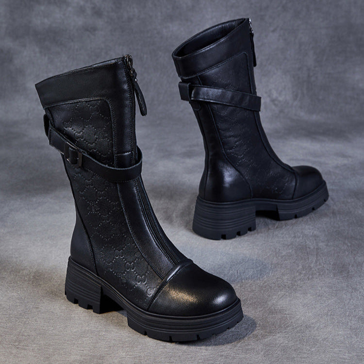 Women's Mid-Calf Embossed Genuine Leather Boots – Buckle Detail Chunky Heel Platform