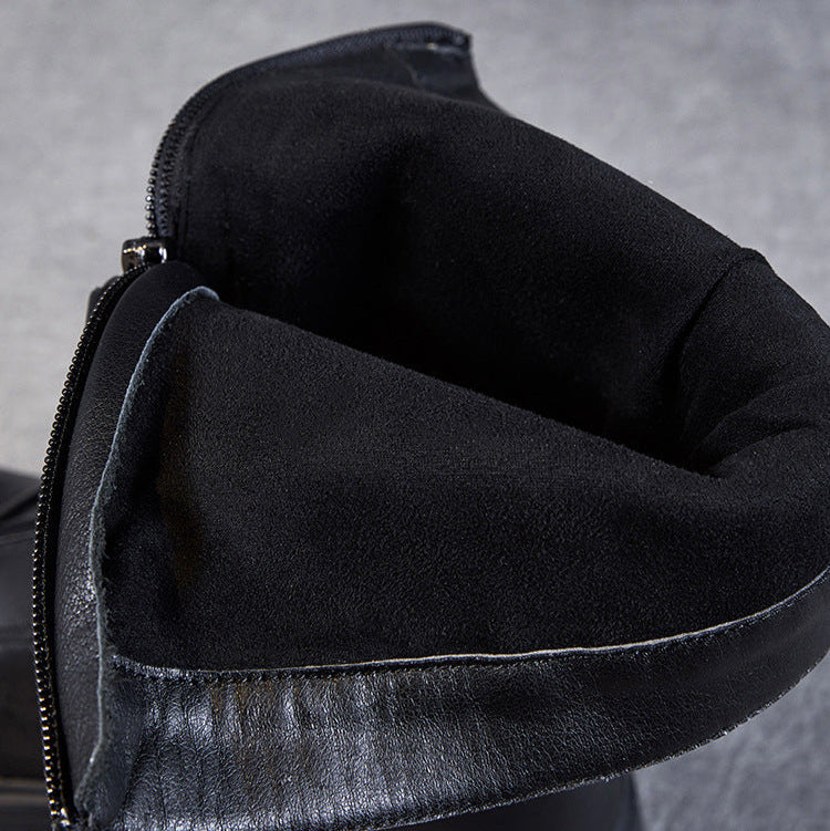Crafted from premium first-layer cowhide with embossed detailing, these mid-calf boots feature a secure buckle accent and a chunky 5.5cm heel with platform for added height and stability. The microfiber lining and pigskin insole ensure warmth and comfort, while the rubber sole provides grip. The 23cm shaft with 32cm circumference fits snugly around the calf. Back zipper allows easy wear. Perfect for winter. Available in Black.