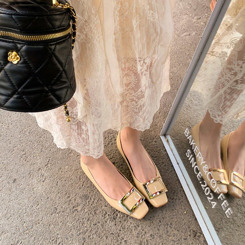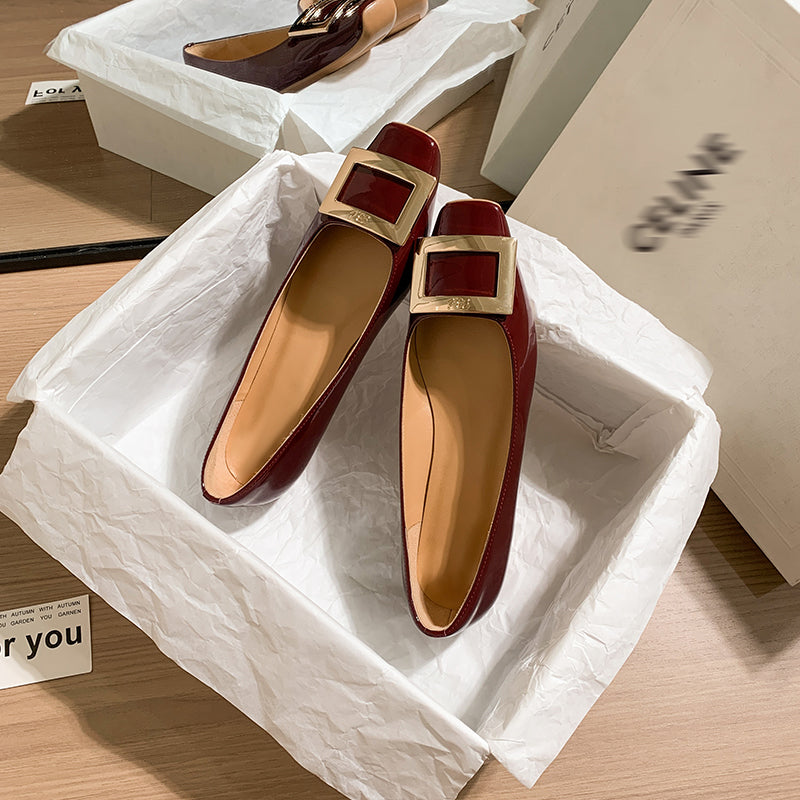 Add a touch of polished elegance to your wardrobe with these glossy patent leather flats, featuring a refined square toe and delicate metal buckle. The perfect blend of classic style and modern comfort for warmer seasons.