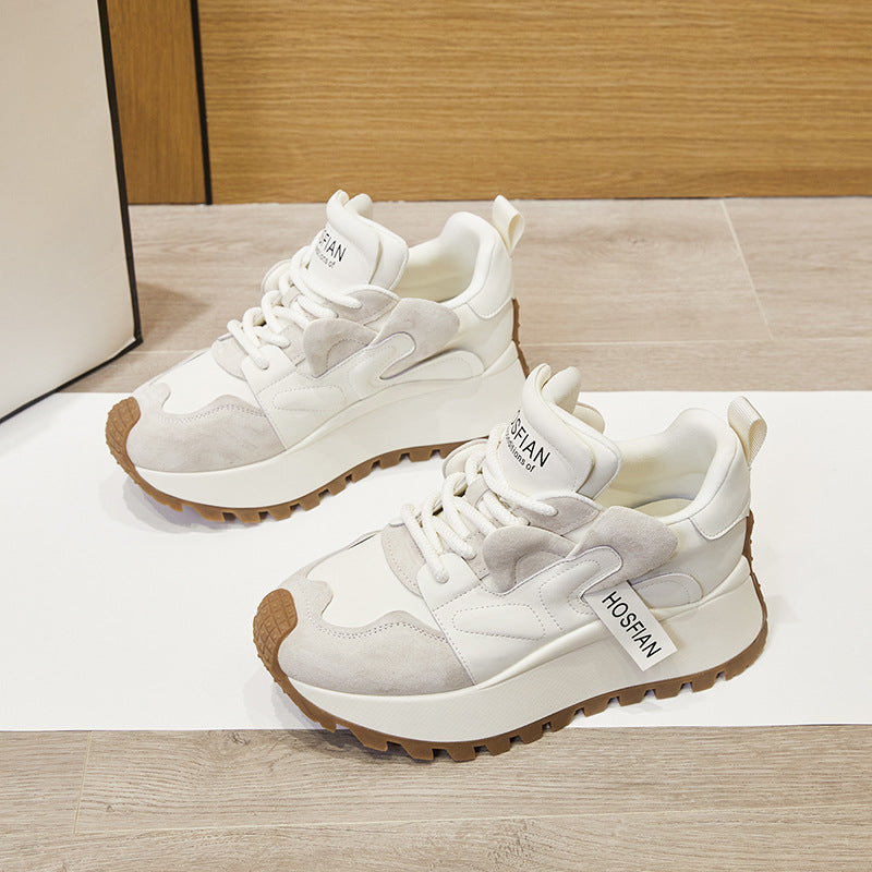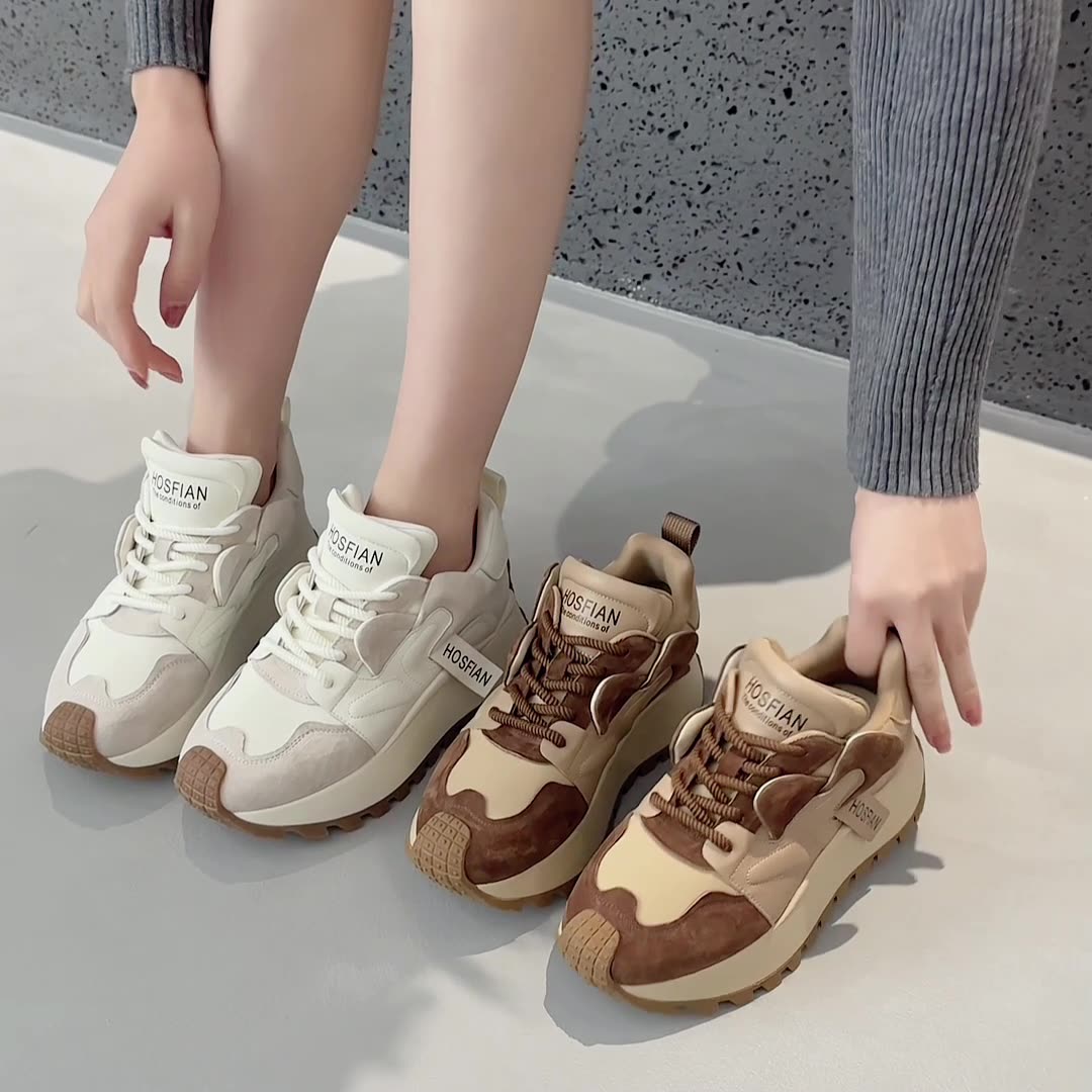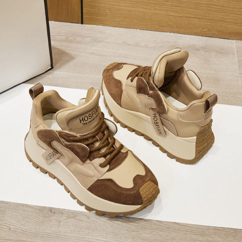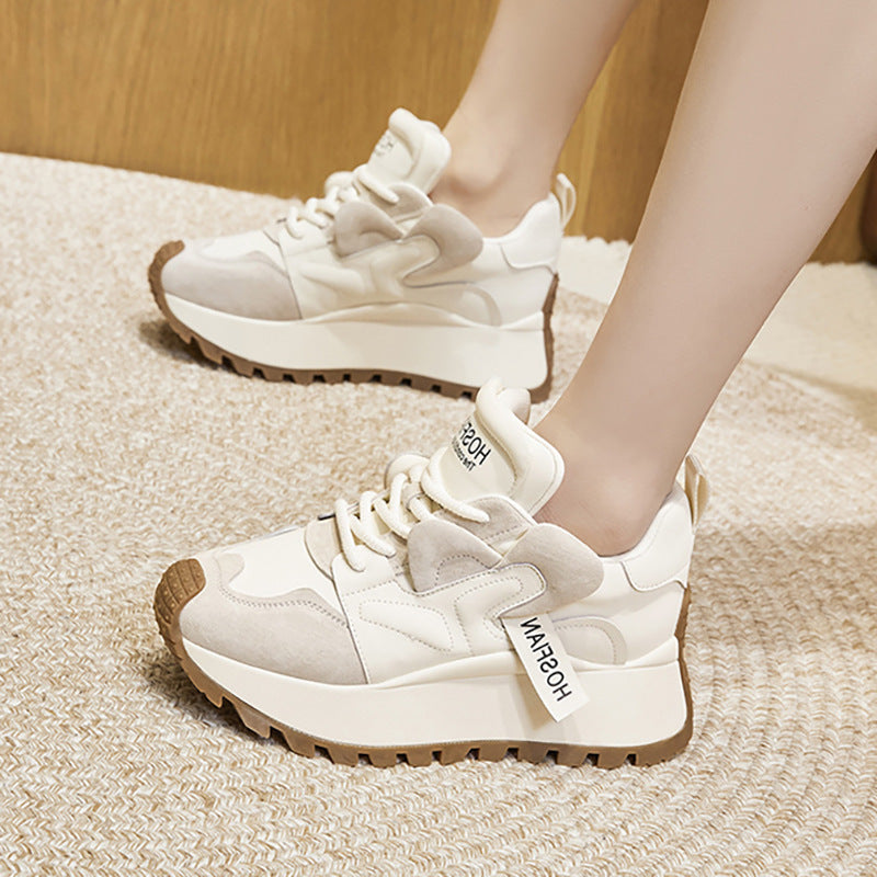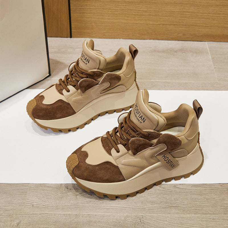 These stylish platform sneakers feature a cowhide leather upper with a soft cloth lining and latex insole for lasting comfort. The chunky 6.0cm EVA sole adds height without sacrificing stability. Lace-up closure ensures a secure fit, while the rounded toe keeps the look casual and versatile. Ideal for everyday wear in autumn and winter. Available in Beige and Coffee.