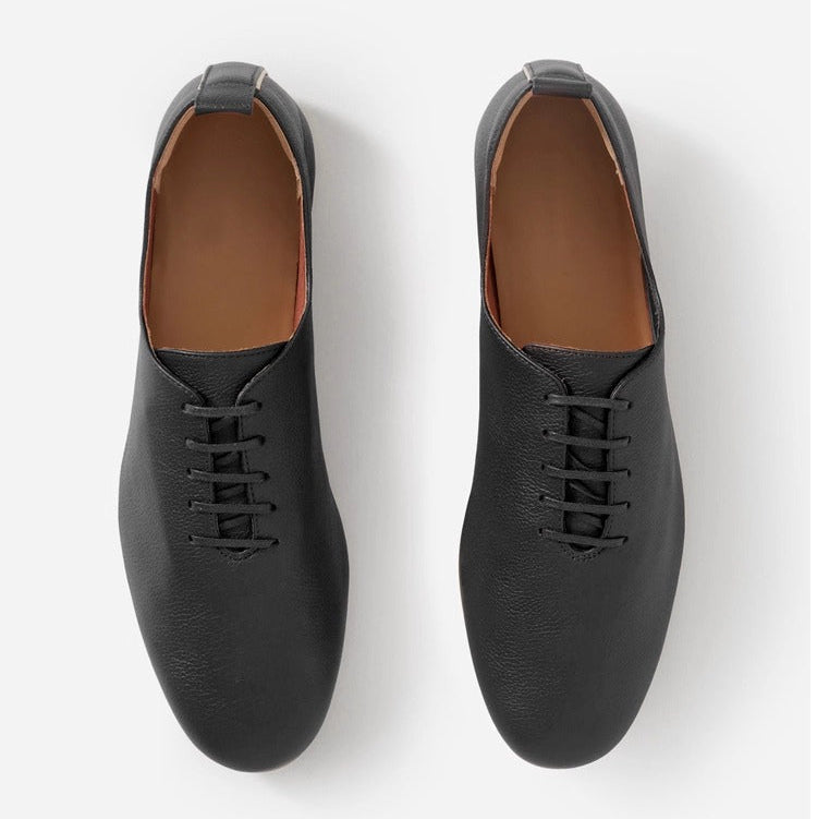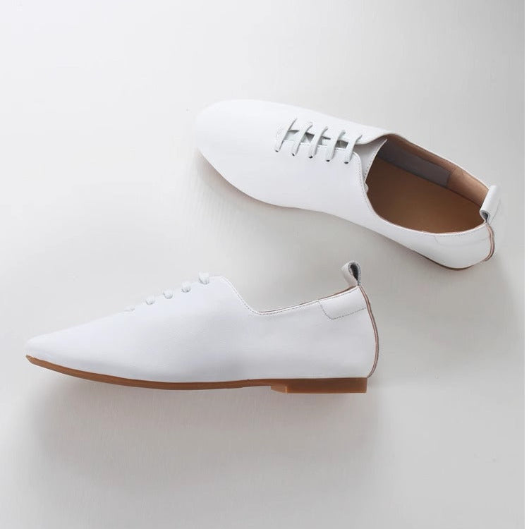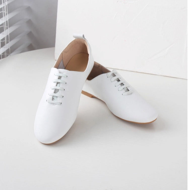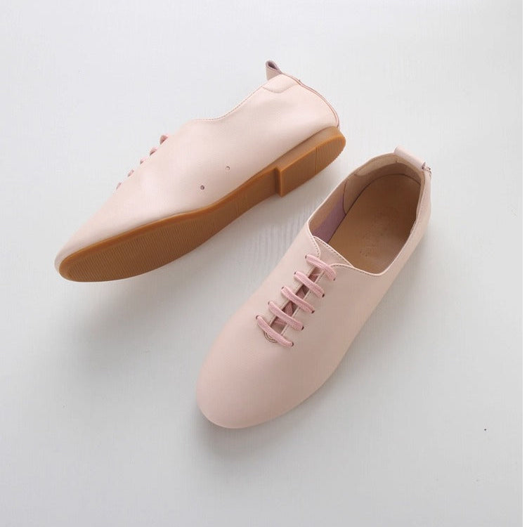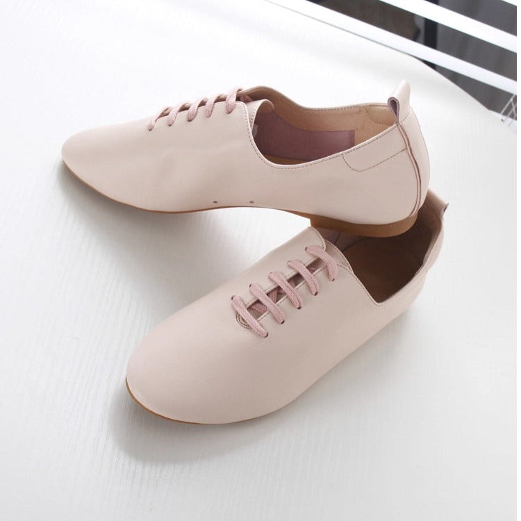 These preppy flats feature a classic round toe design crafted from high-quality cowhide. The soft sheepskin insole and breathable pigskin lining provide exceptional comfort, while the durable rubber sole ensures good traction. The lace-up closure offers a secure fit. With a modest 1cm heel, these flats are perfect for everyday wear during spring and autumn. Available in Black, White, and Pink.