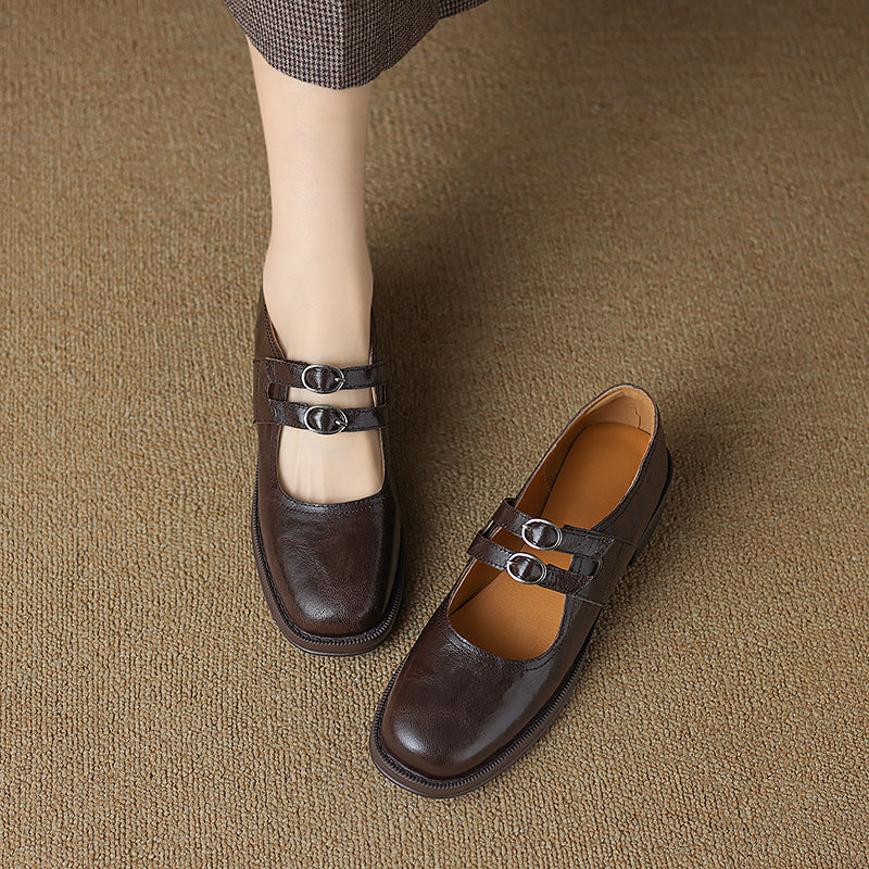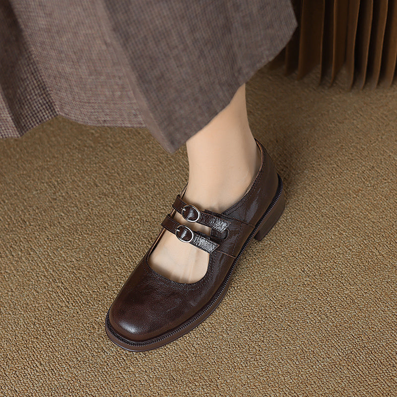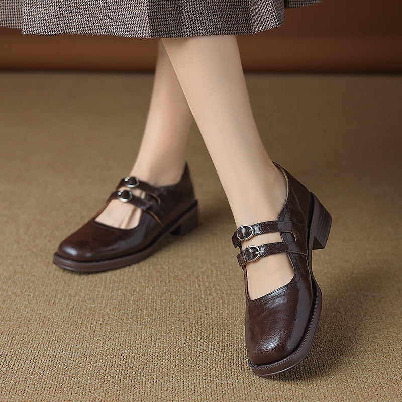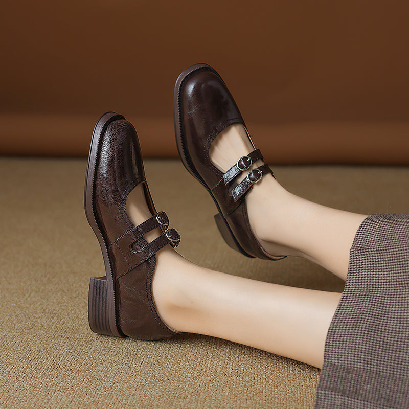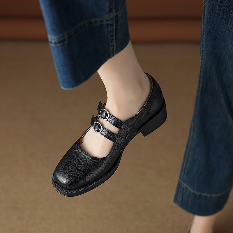 Women's Sheepskin Leather Block Heel Low Heel Double Buckle Mary Jane Shoes