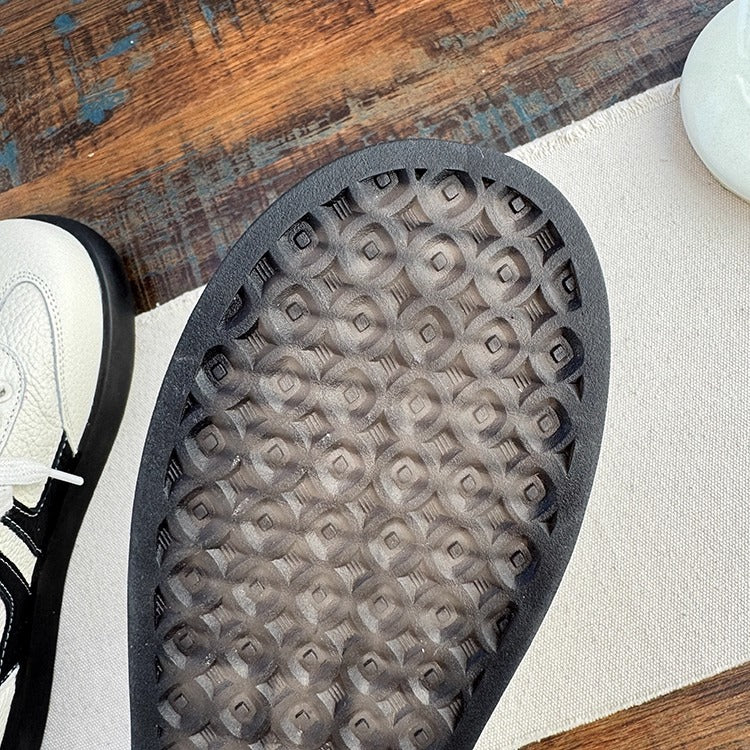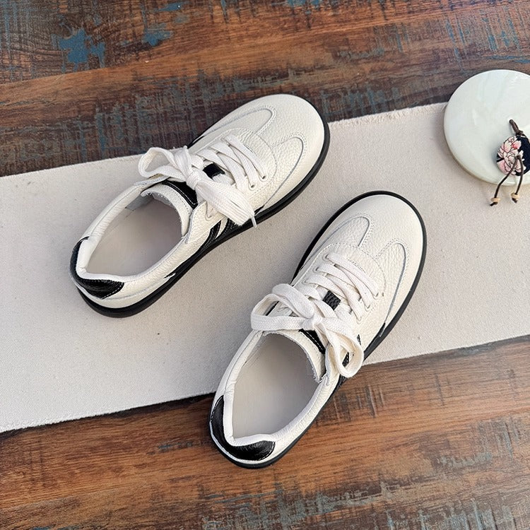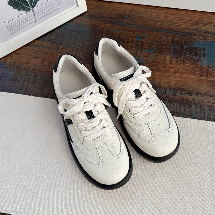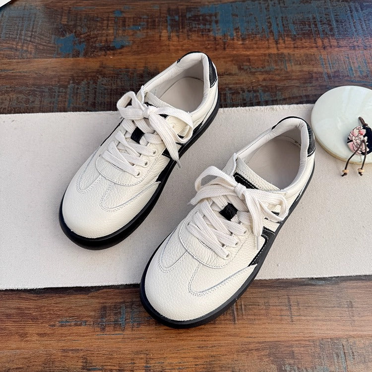 Crafted from supple first-layer cowhide, these sneakers offer all-day comfort with a soft microfiber lining and insole. The round toe and 2.5cm rubber sole provide gentle support, while the lace-up closure ensures a secure fit. A versatile casual tennis-style shoe perfect for spring and autumn, available in Beige and Black.