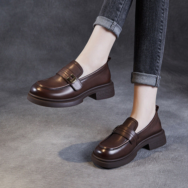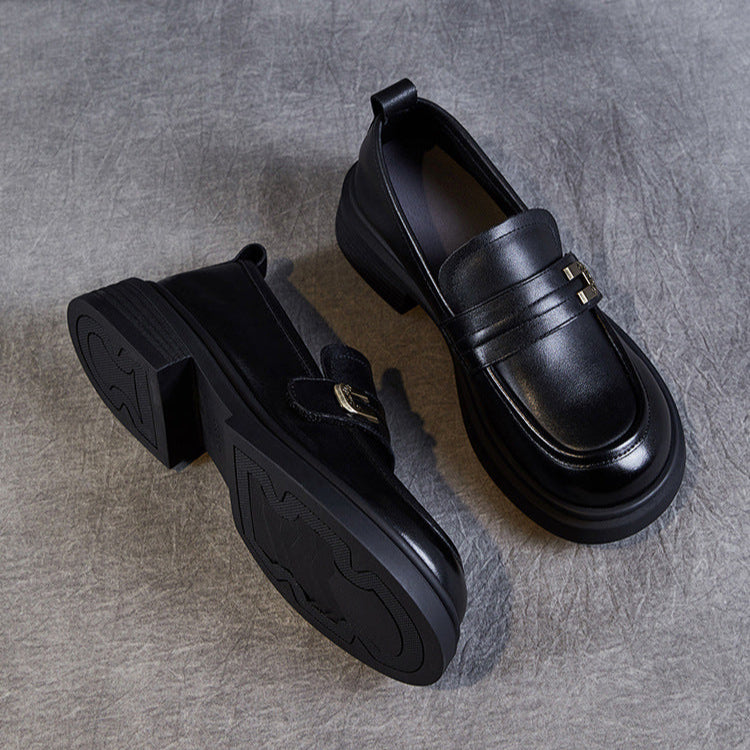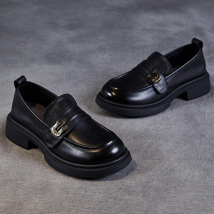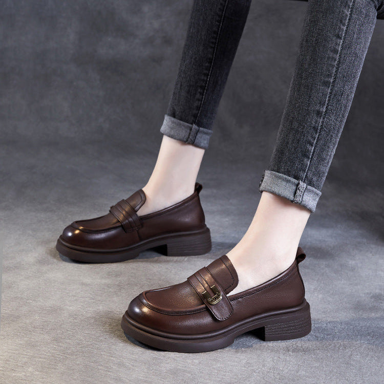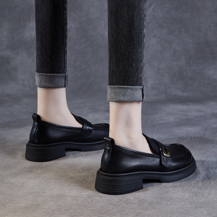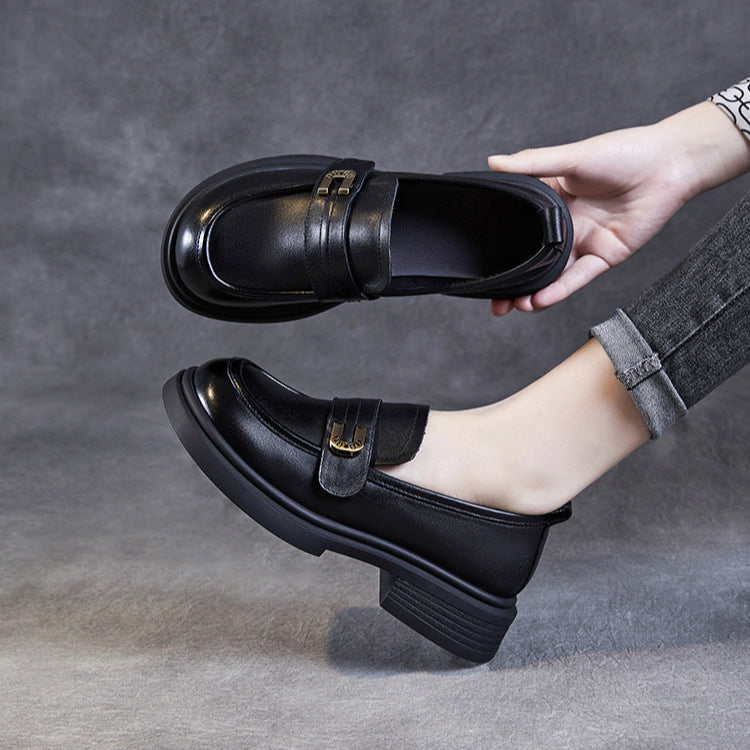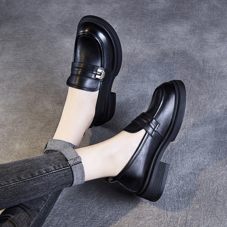 Made from soft first-layer cowhide, these loafers feature a classic round toe and a comfortable 4cm low heel perfect for all-day wear. The breathable pigskin insole provides cushioning, while the durable rubber sole ensures reliable grip. Slip-on design allows easy on and off. Ideal for spring and autumn seasons. Available in Black and Brown.