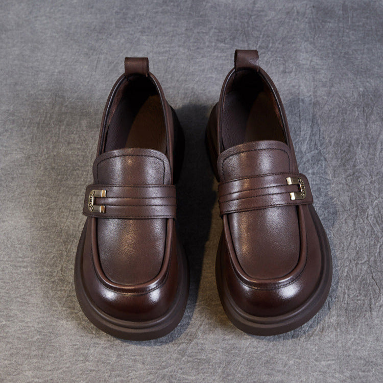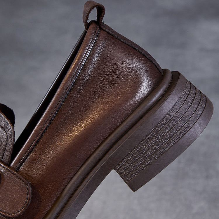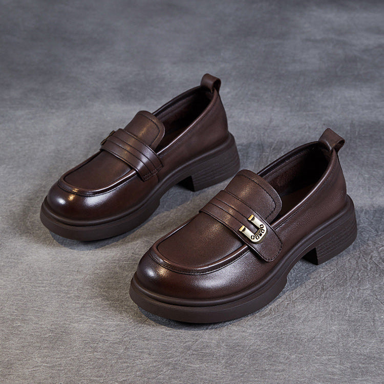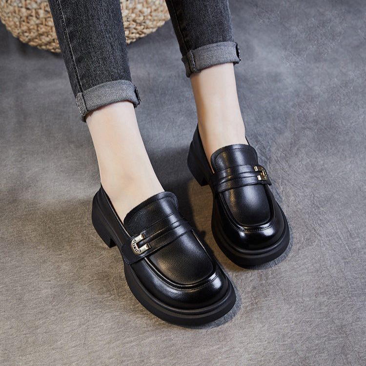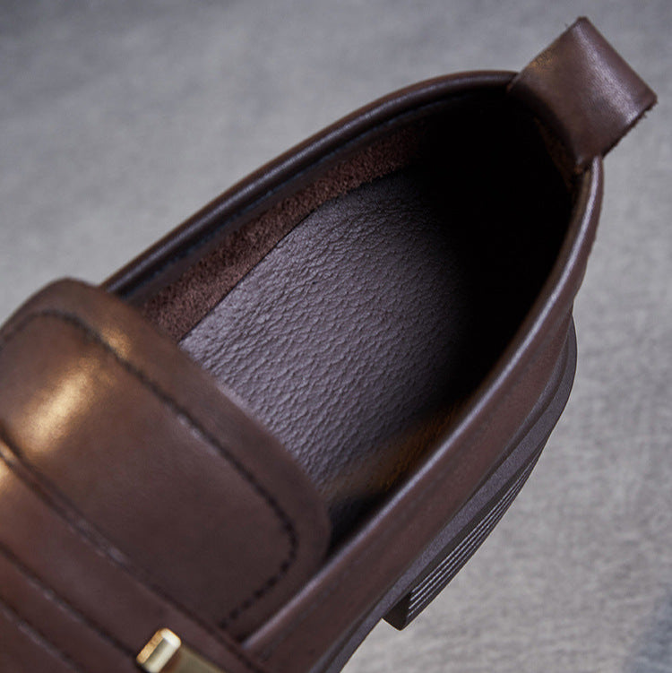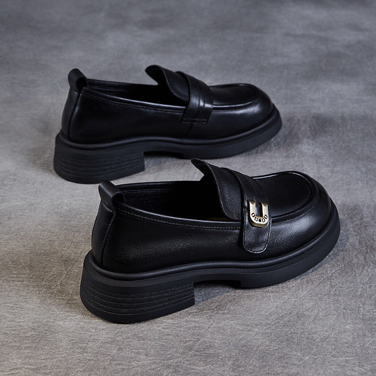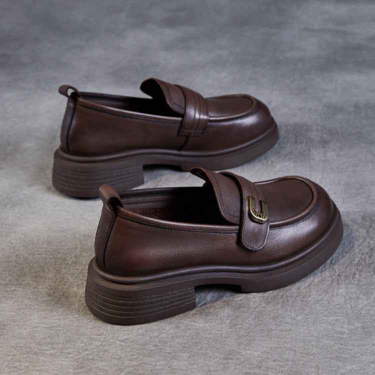Made from soft first-layer cowhide, these loafers feature a classic round toe and a comfortable 4cm low heel perfect for all-day wear. The breathable pigskin insole provides cushioning, while the durable rubber sole ensures reliable grip. Slip-on design allows easy on and off. Ideal for spring and autumn seasons. Available in Black and Brown.
