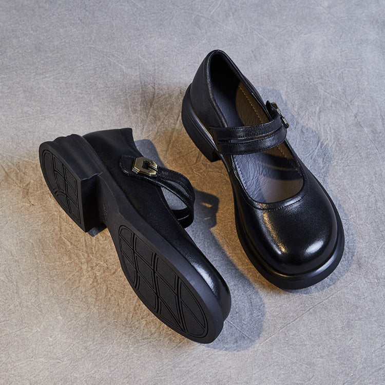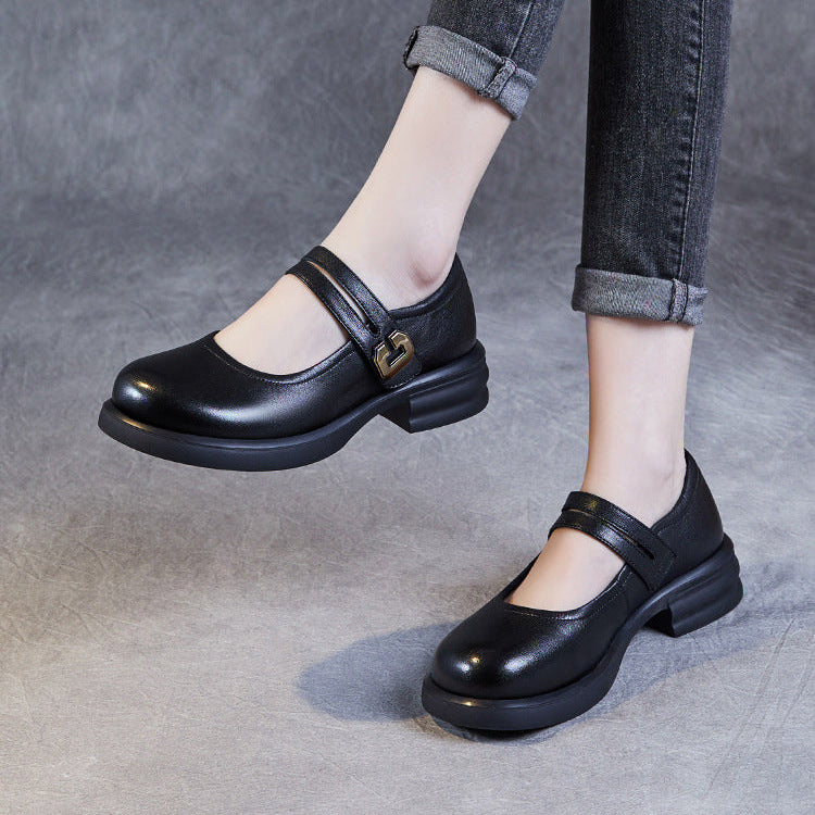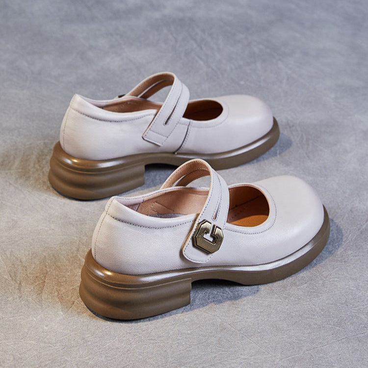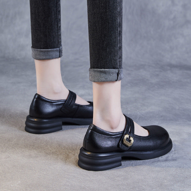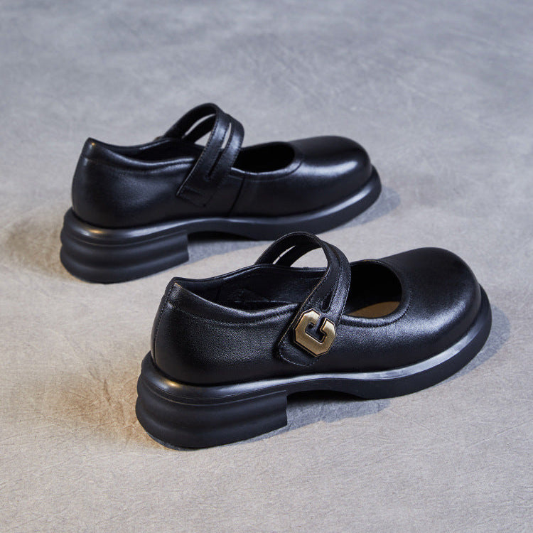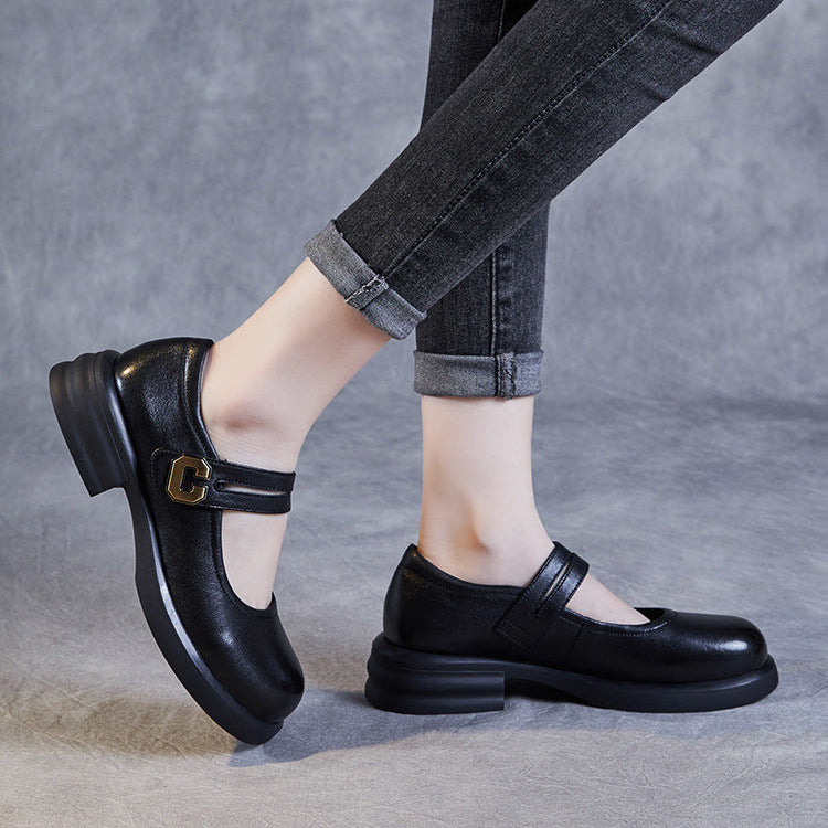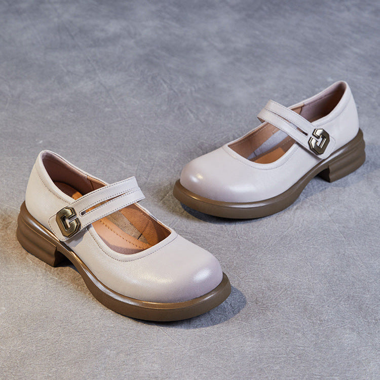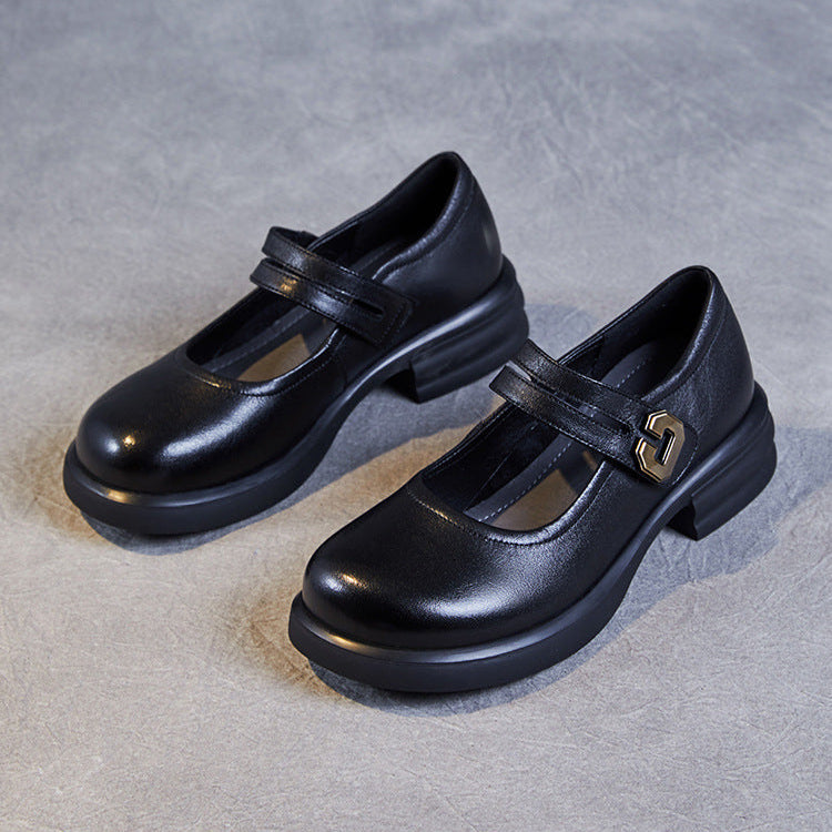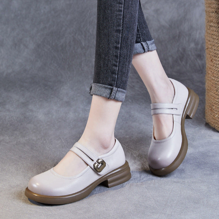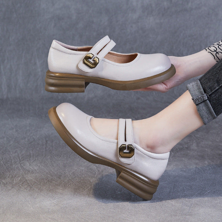 Made from soft first-layer cowhide, these Mary Janes feature a classic round toe and a low 3.5cm heel for all-day comfort. The pigskin insole adds breathability, while the adjustable Velcro strap ensures an easy and secure fit. Finished with a flexible rubber sole, they're perfect for spring and autumn. Available in Black and Beige.