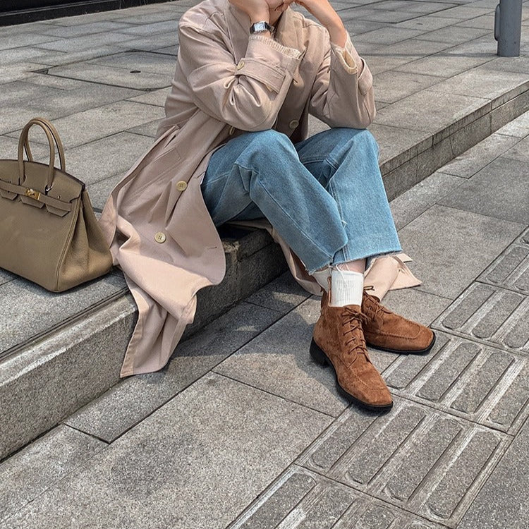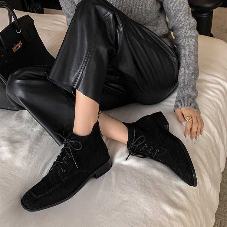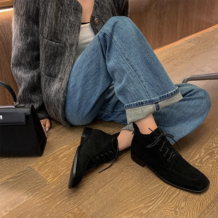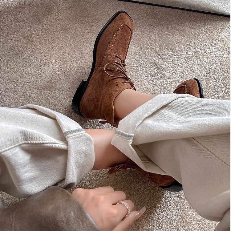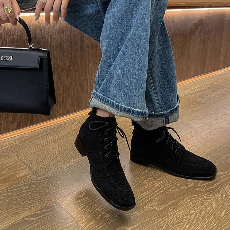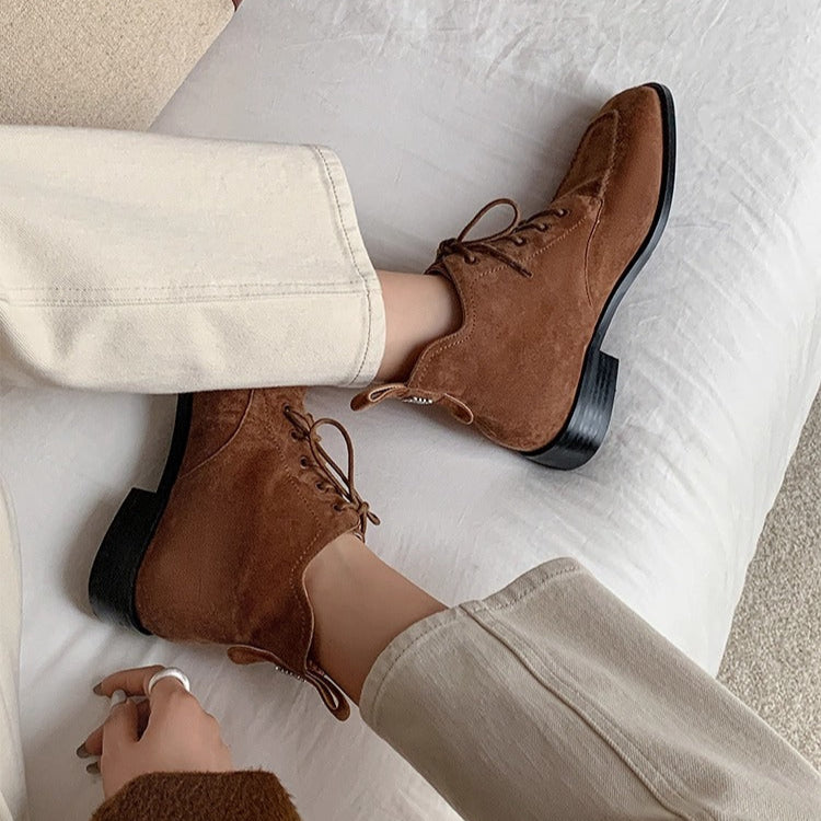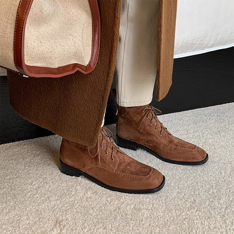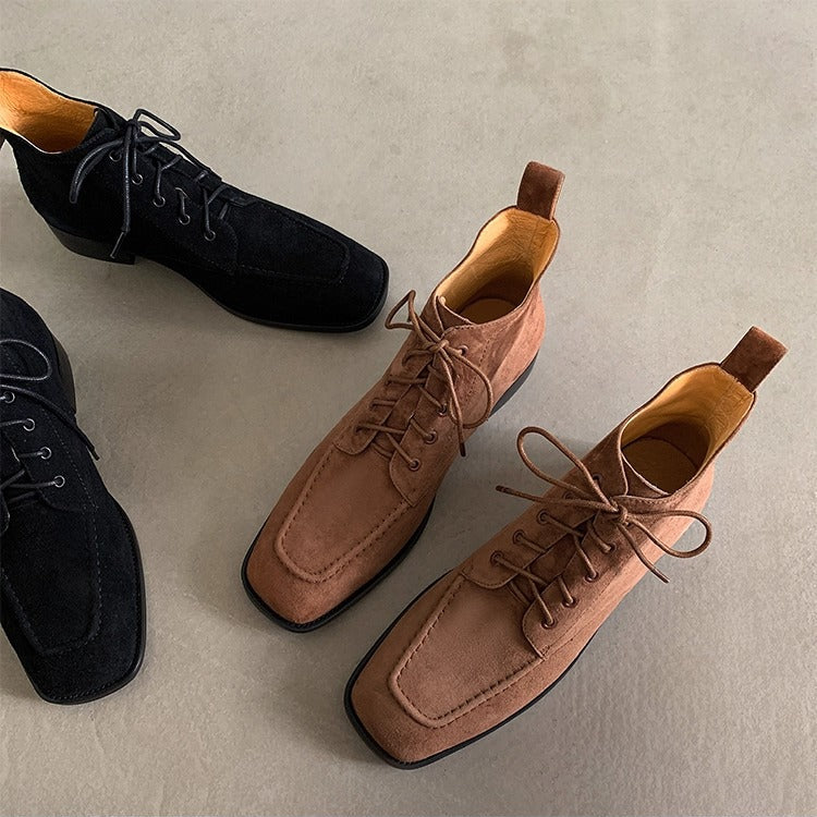 Women's Suede Square Toe Ankle Boots – Lace-Up Low Heel Stylish Style