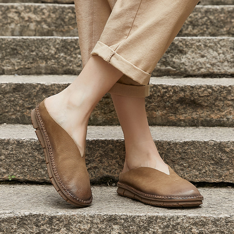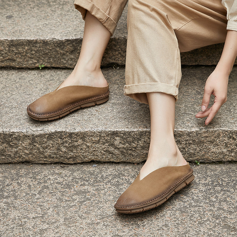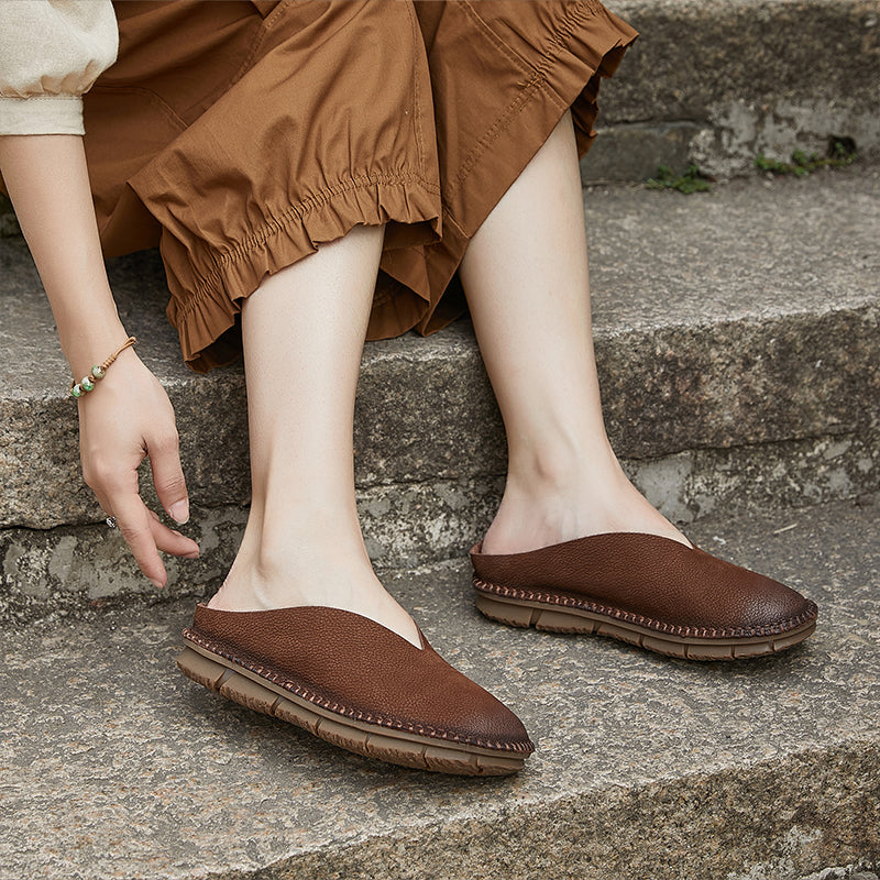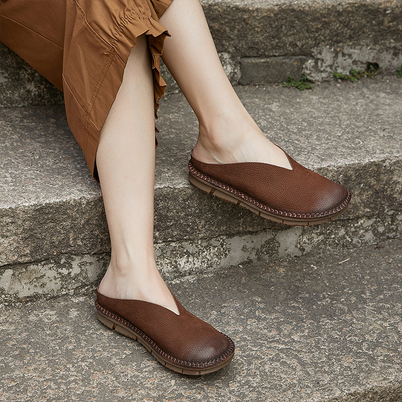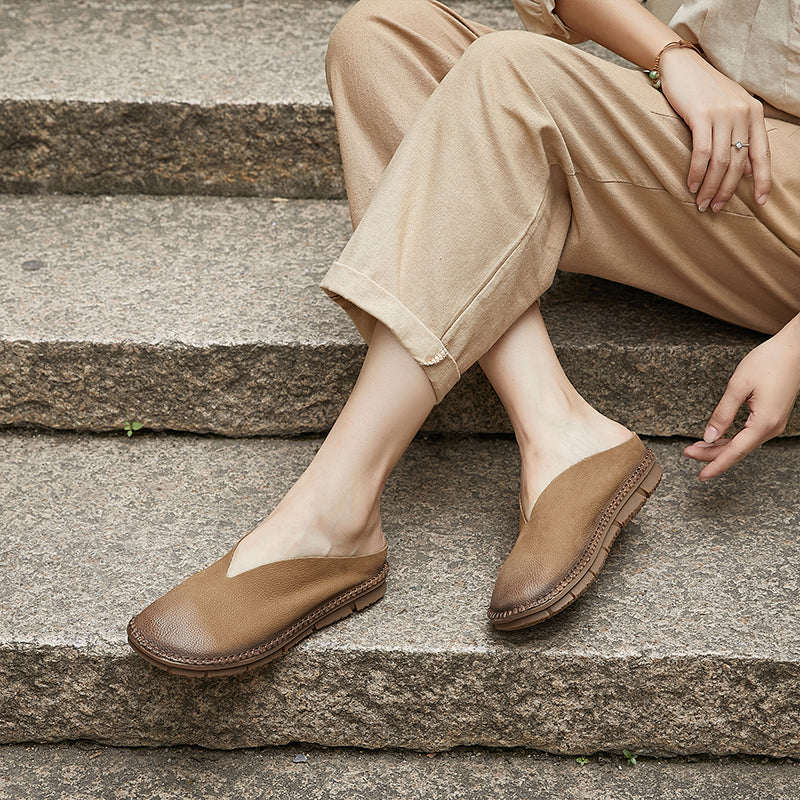 Women's V-Cut Soft Leather Flat Mules – Retro Minimalist Style