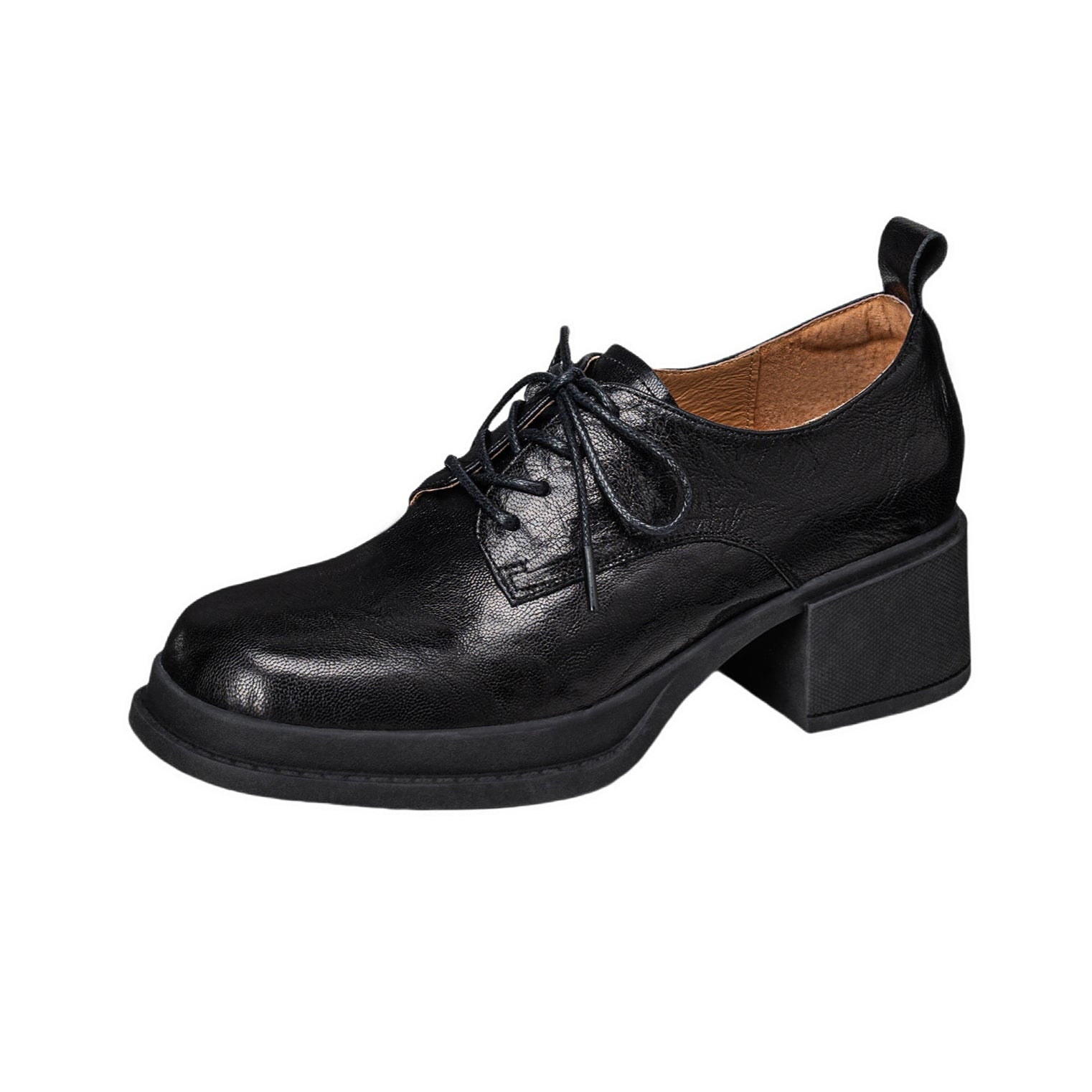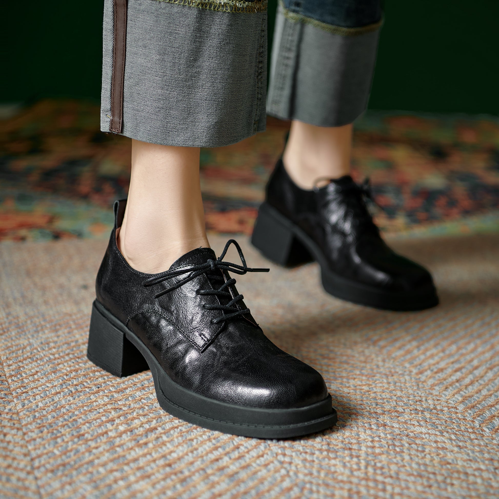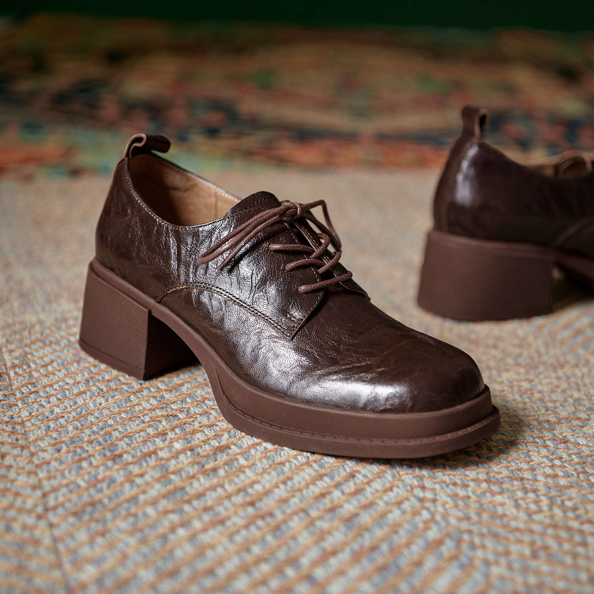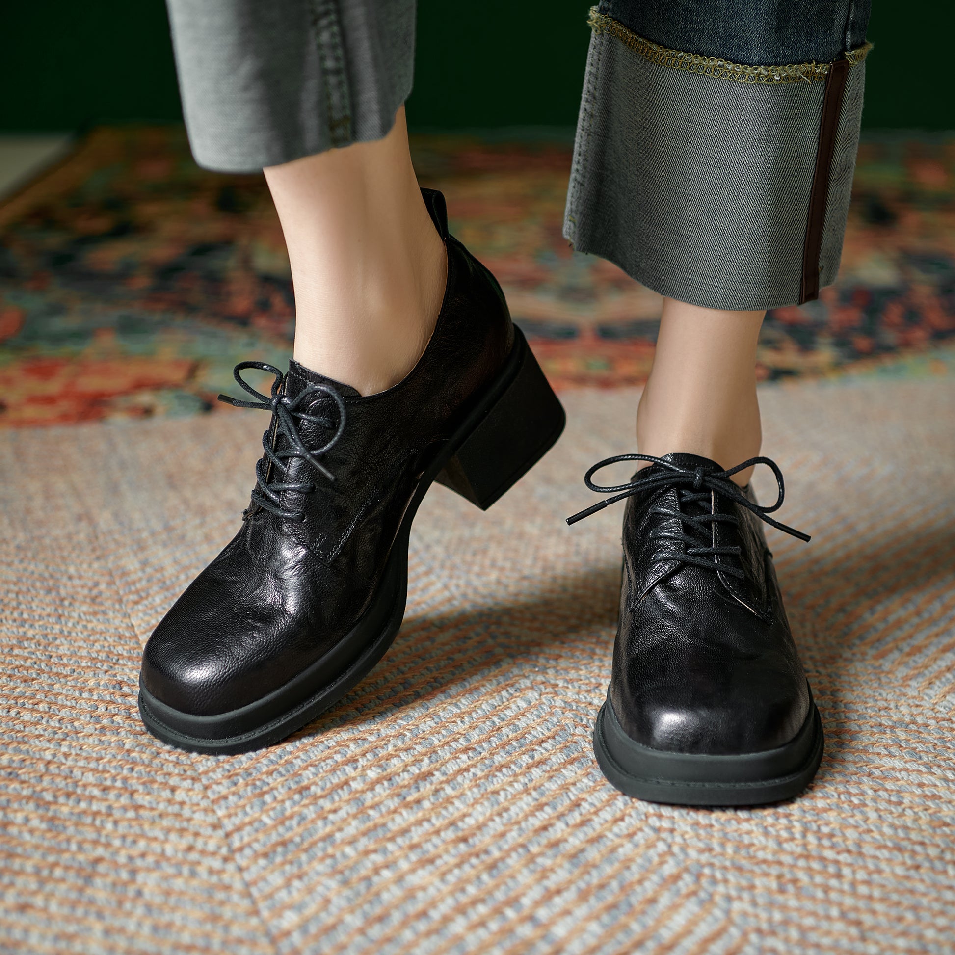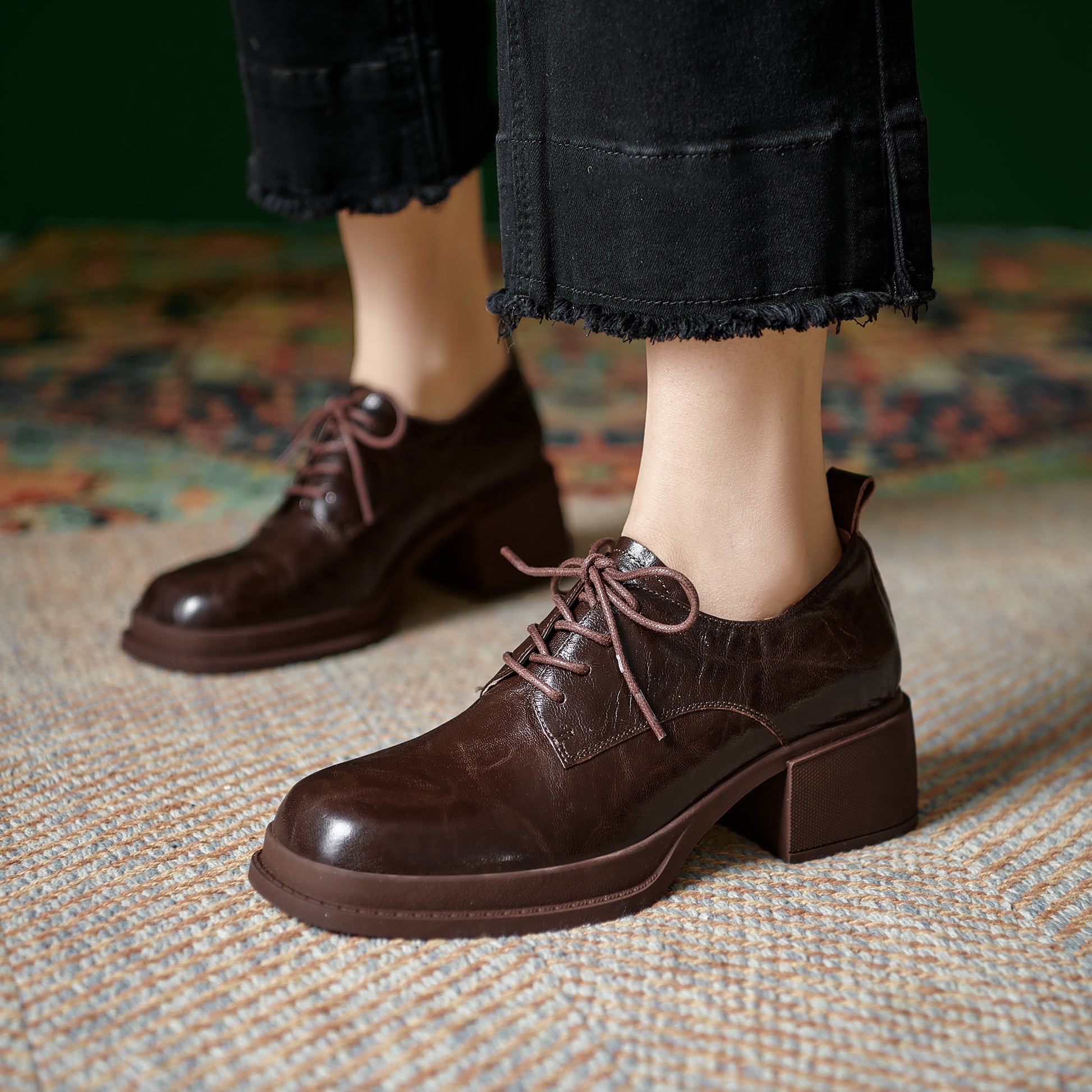 Women's Vintage Block Heels Leather Oxfords & Tie Shoes Lace-up mid-heel