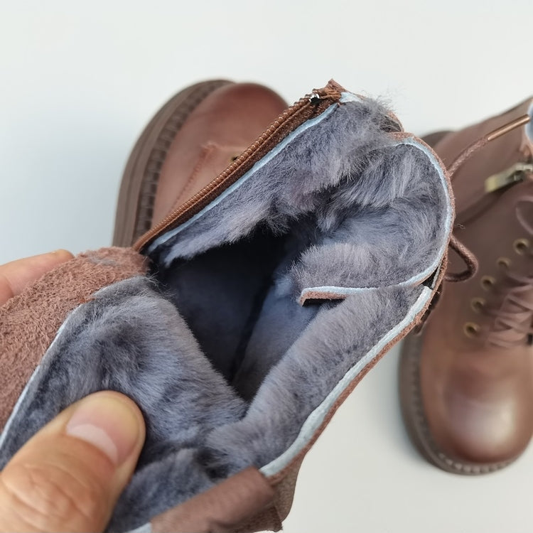 These British-style Martin short boots feature a high-top design with thick integrated sheepskin and wool lining, offering warmth and comfort from ankle to toe. The wide round toe and first-layer cowhide upper provide extra room, making them ideal for wider feet. The front lace-up allows adjustment for a perfect fit, while the inner side zipper ensures easy slip-on. The soft rubber sole provides stability and grip, with heel height of 3.5 cm for comfortable walking. Perfect for staying cozy and stylish during cold autumn and winter days.