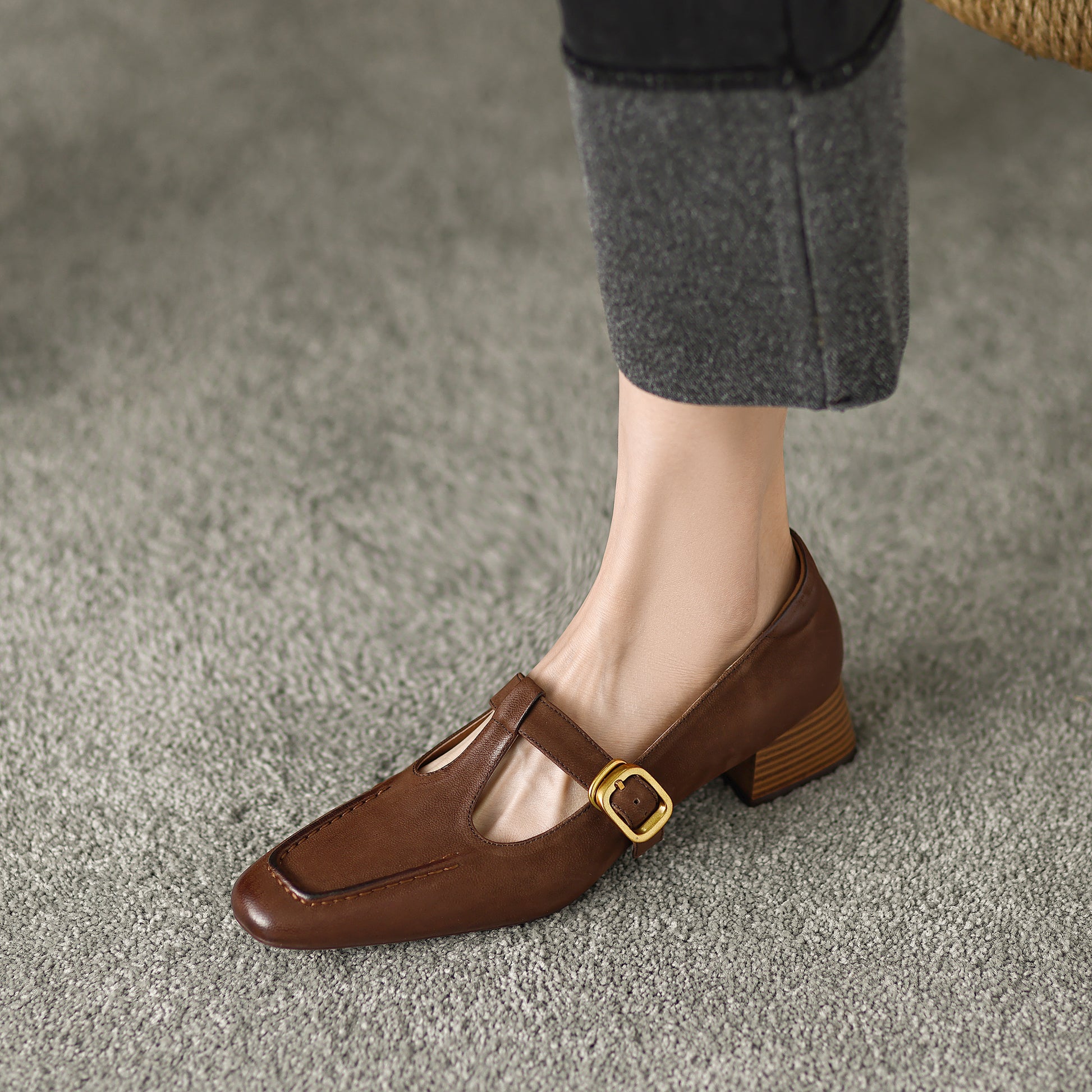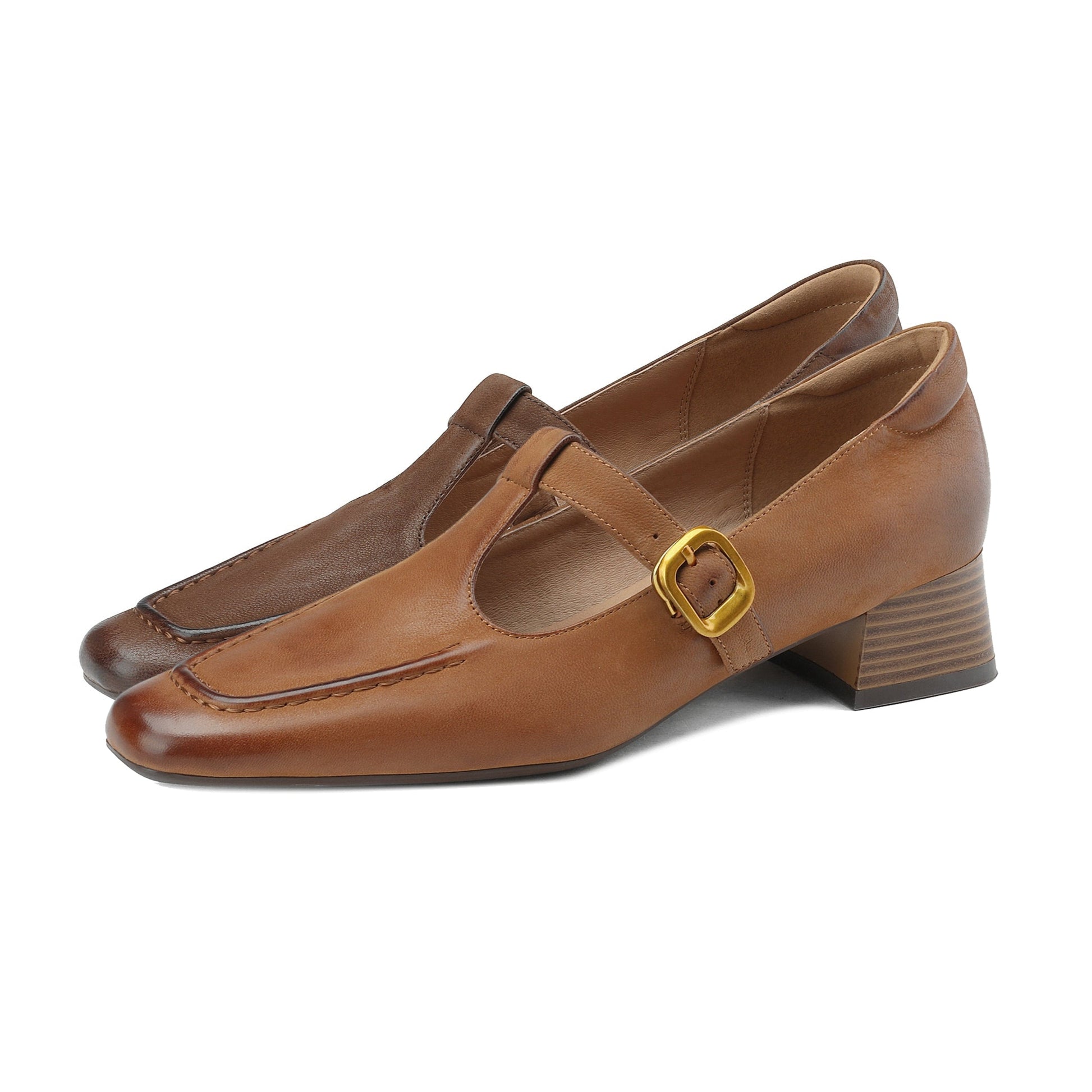 Women's Pointed Toe Genuine Leather Handmade Buckle Low Block Heels Mary Jane Dress Shoes